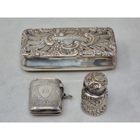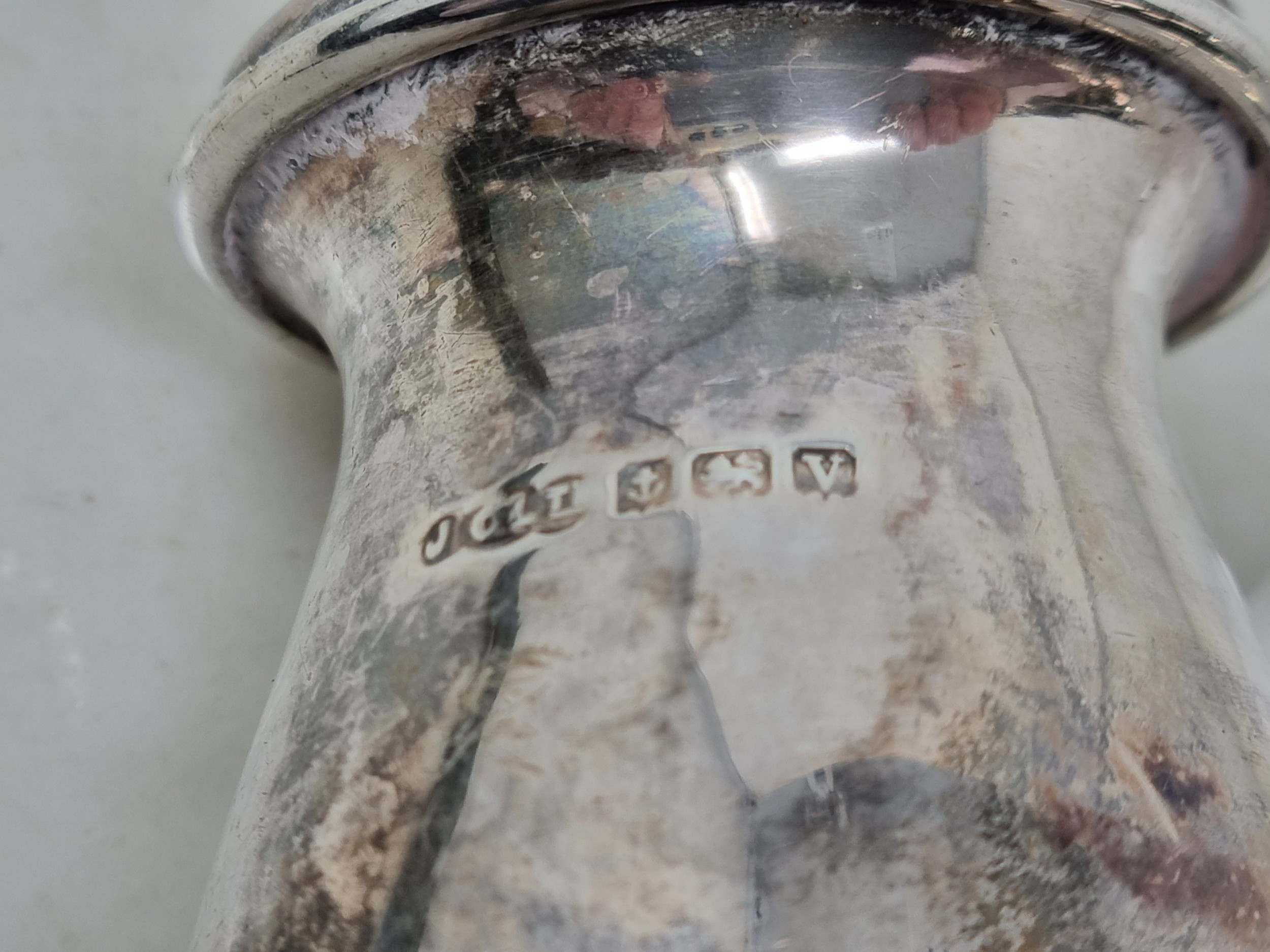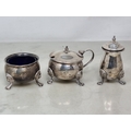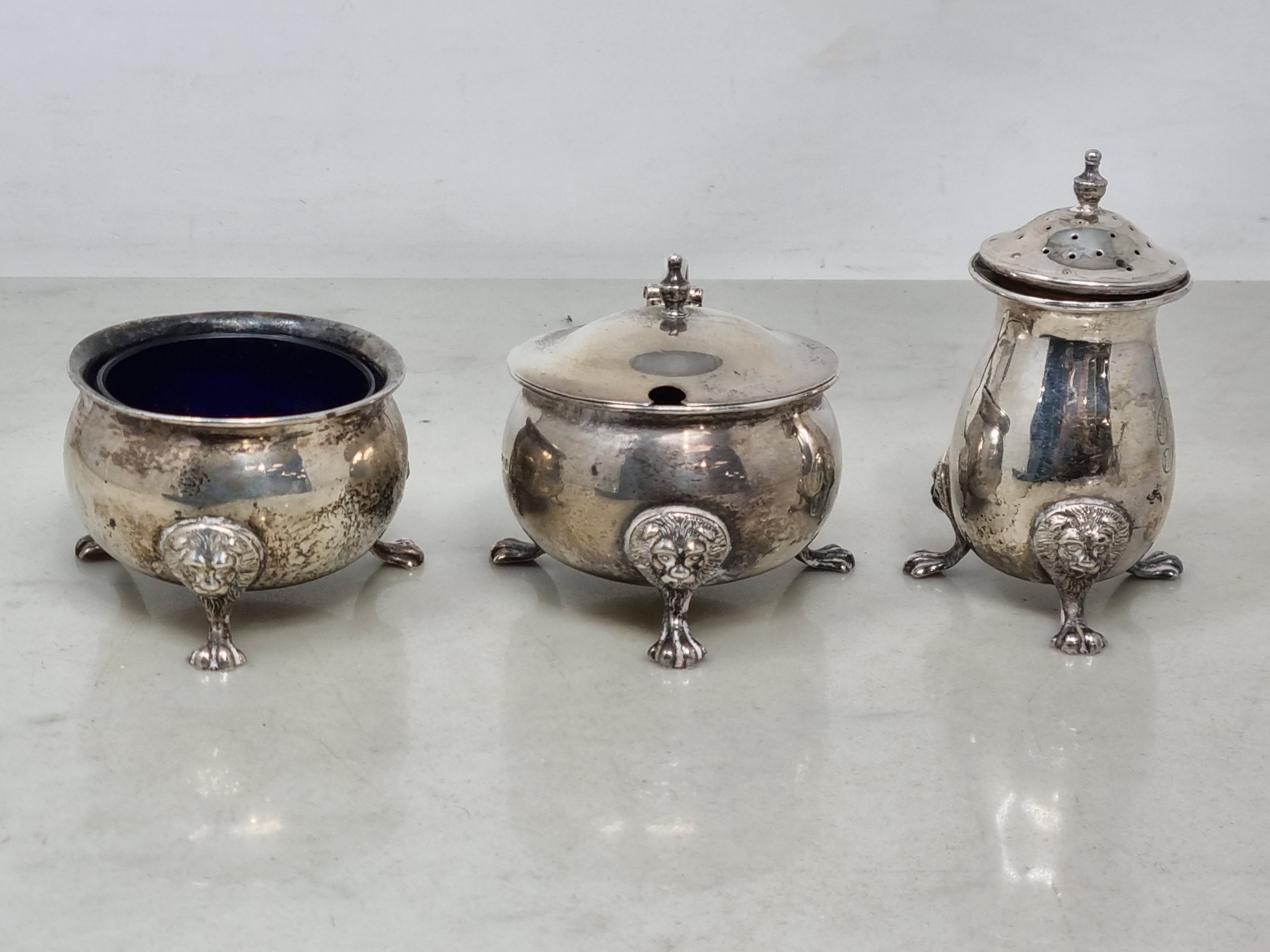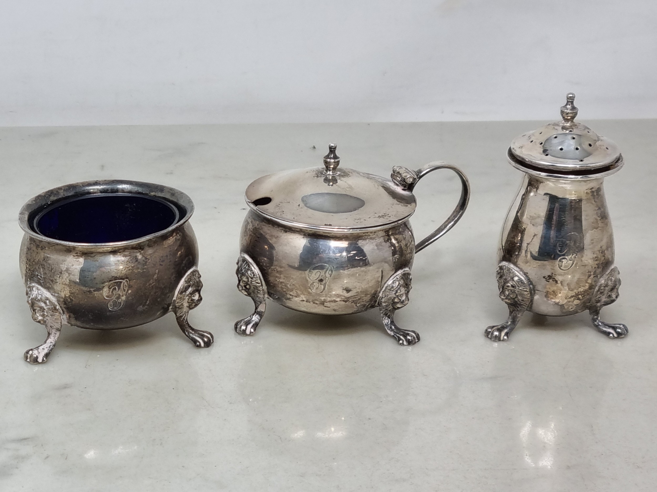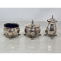 A George V three piece circular Condiment Set engraved initial raised on lion mask and paw feet, Birmingham 1920, 200gms