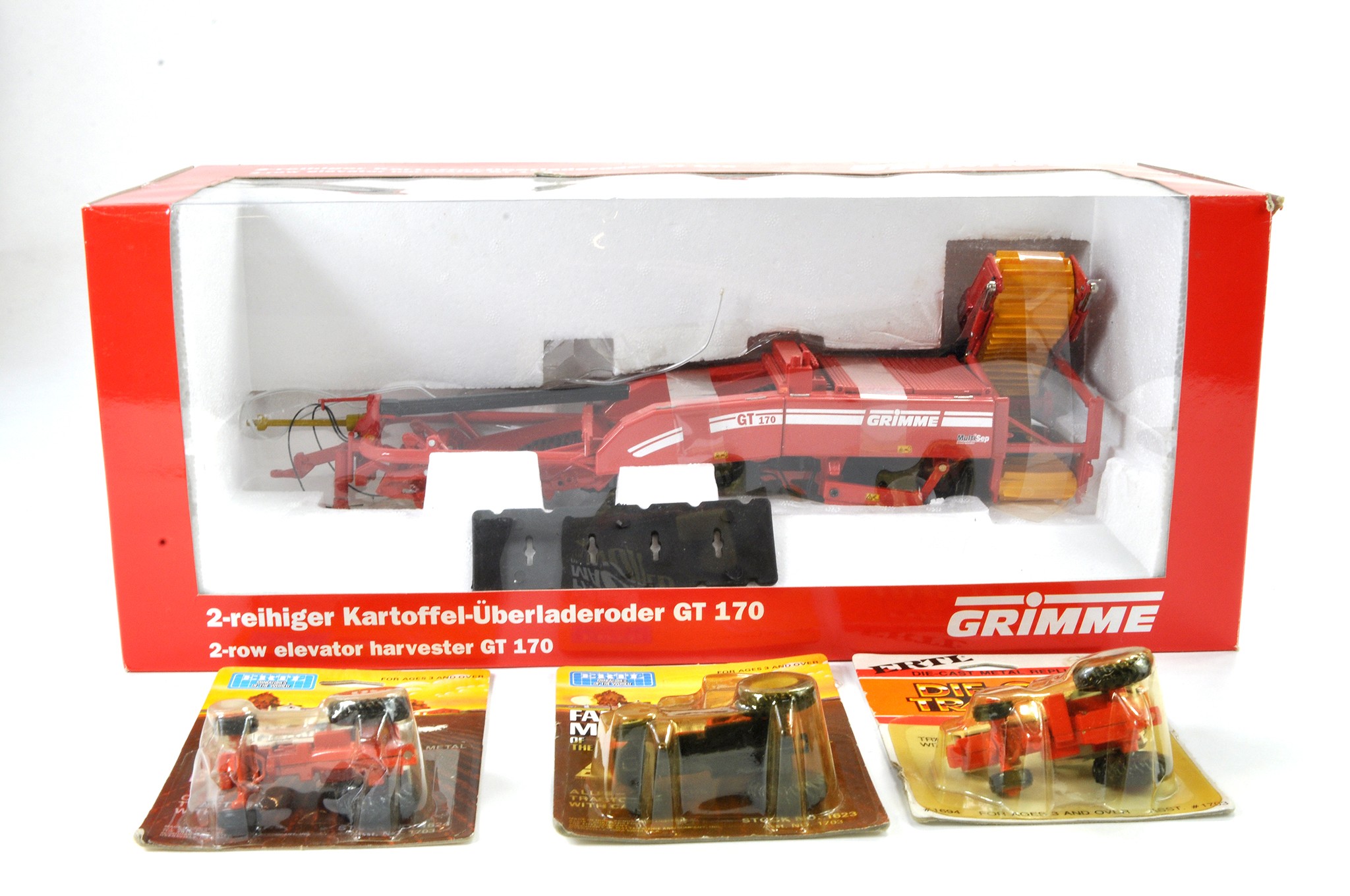 ROS 1/32 Farm Toy / Model comprising Grimme GT170 Potato Harvester. Appears excellent, with original box. Plus trio of Carded Ertl 1/64 issues.