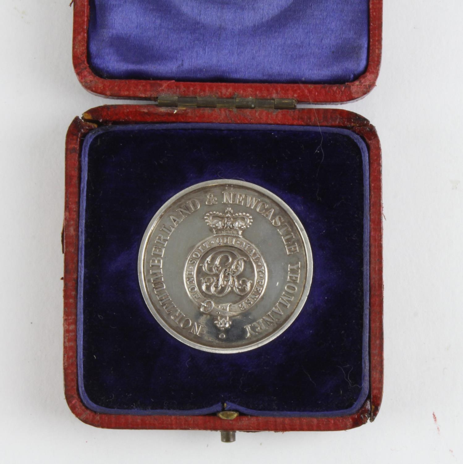 Regimental Medal of the Northumberland & Newcastle Yeomanry in silver. Reverse "Presented by Lt Col Brandling to Capt Dixon Brown (for services in connection with the organisation of the Regiment) Jan-March 1820". In its fitted Elkington case. (d.37mm, weight 29g)