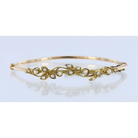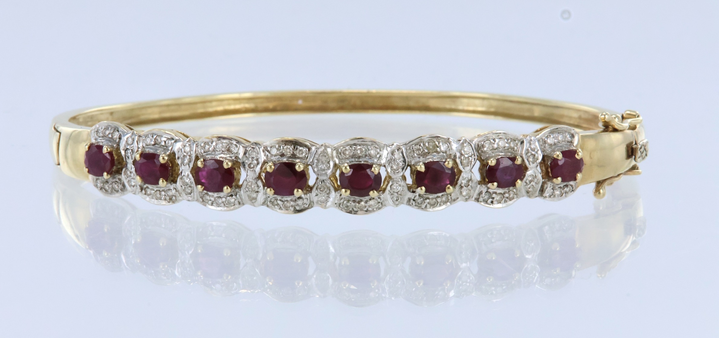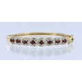 Yellow metal (tests 14ct) ruby and diamond cluster hinged bangle with box clasp and double safety catch, eight oval 5mm x 4mm rubies seventy six round brilliant cut diamonds, total diamond weight approx. 0.50ct, weight 23.0g