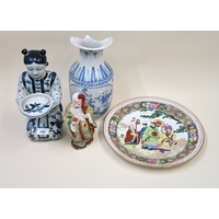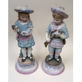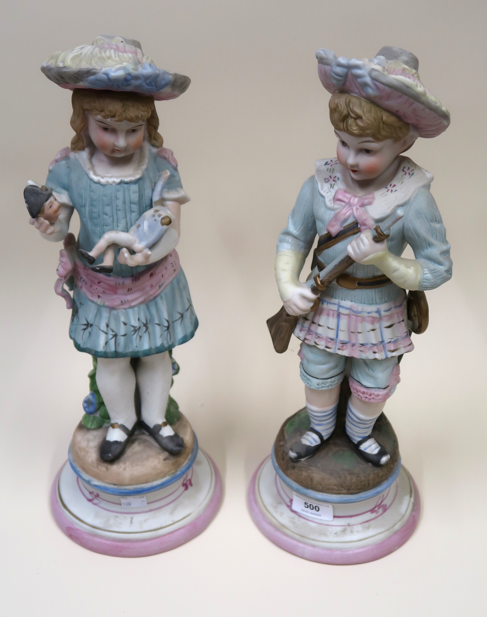 Pair of Continental bisque porcelain figures of a boy and girl holding a doll and gun, 42cm high