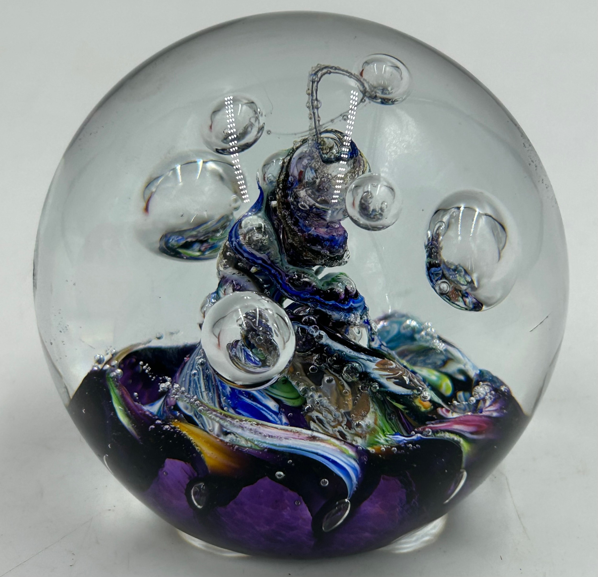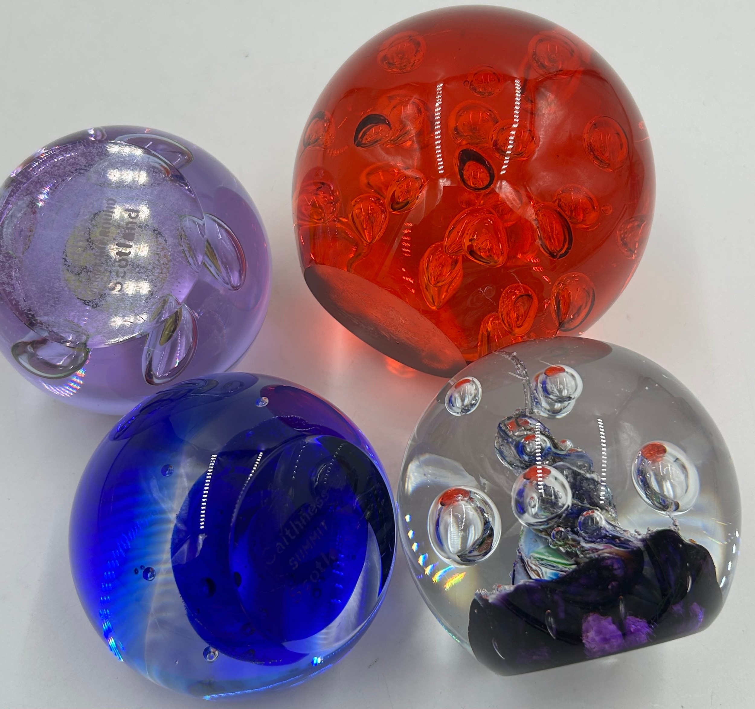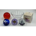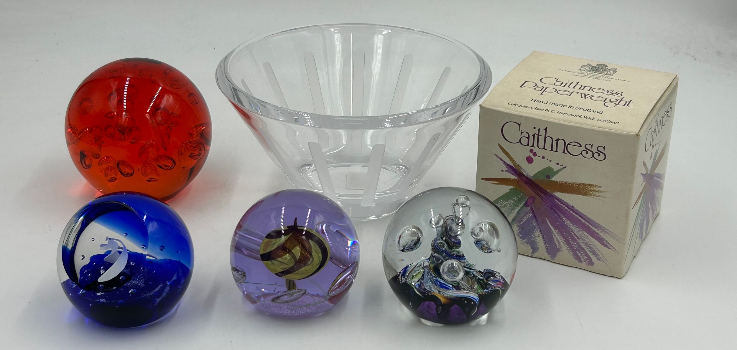 Three Caithness paperweights to include: Myriad, Merry Go Round (boxed) and Summit together with a vintage red controlled bubble paperweight and a contemporary Wedgwood Vera Wang bowl Made in Germany. (5)