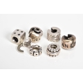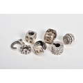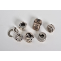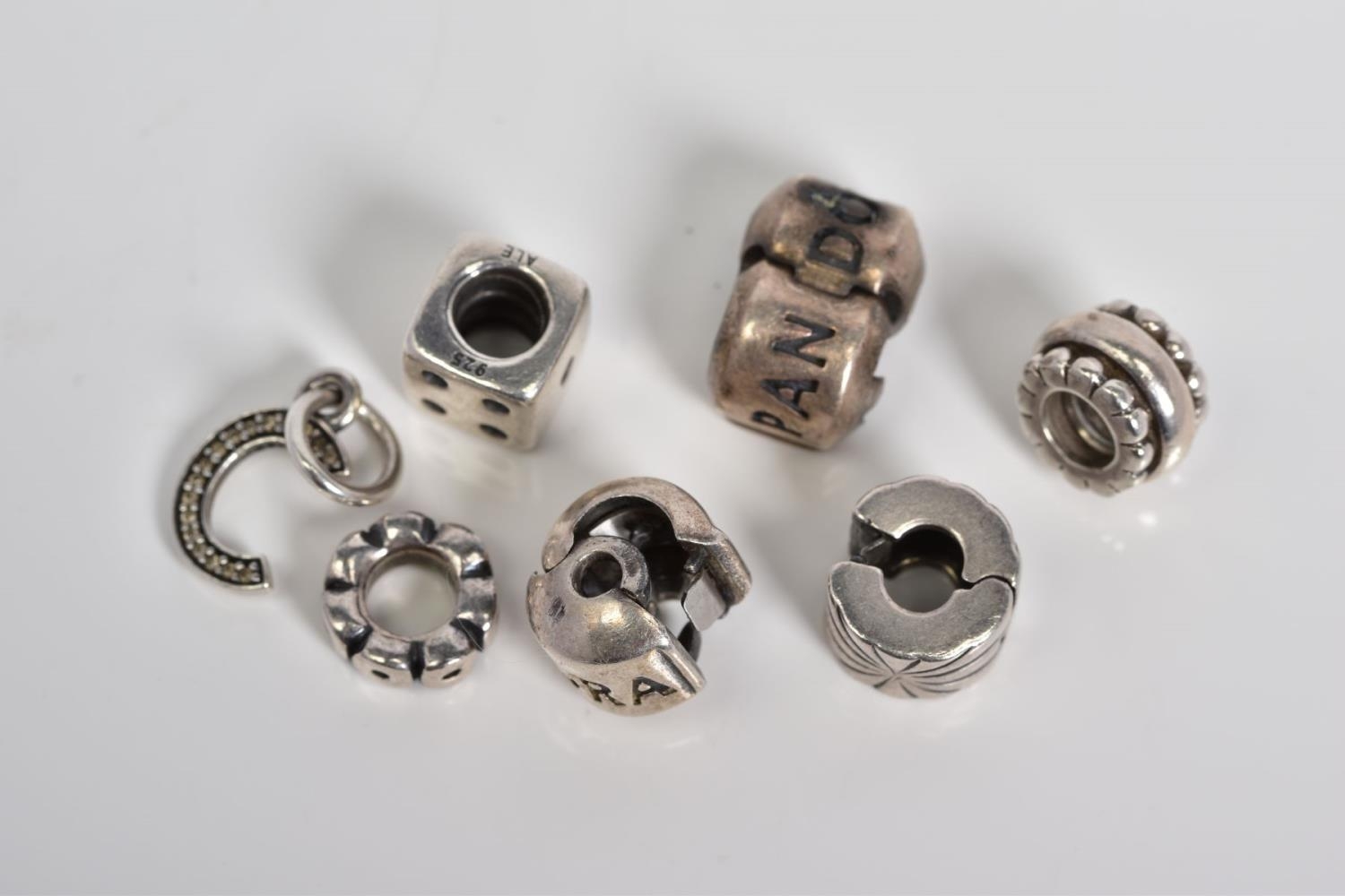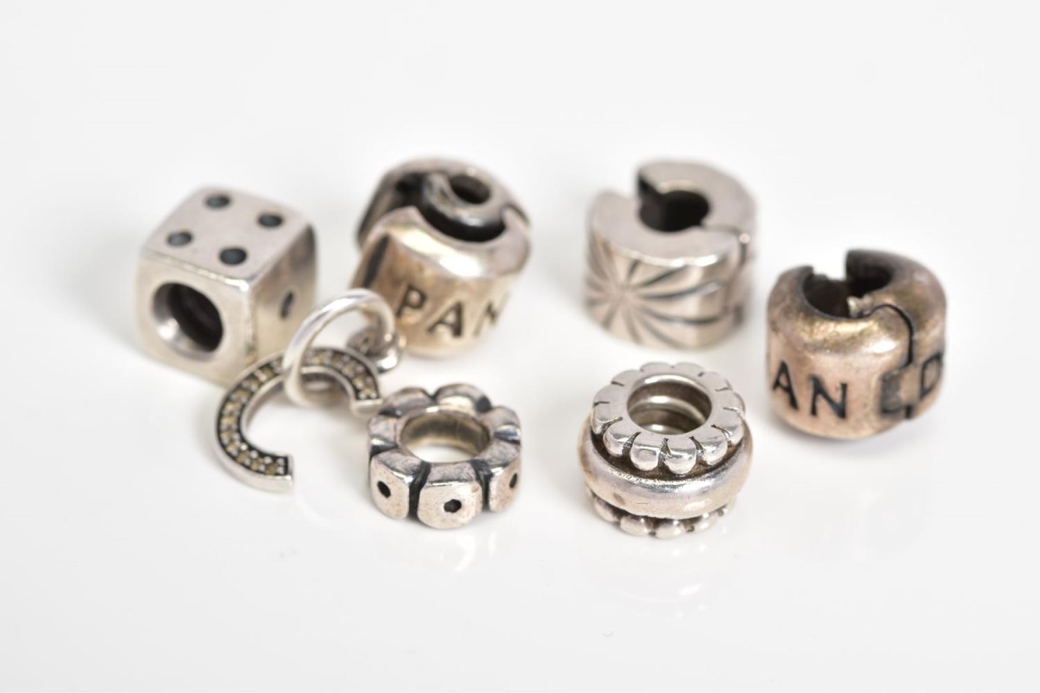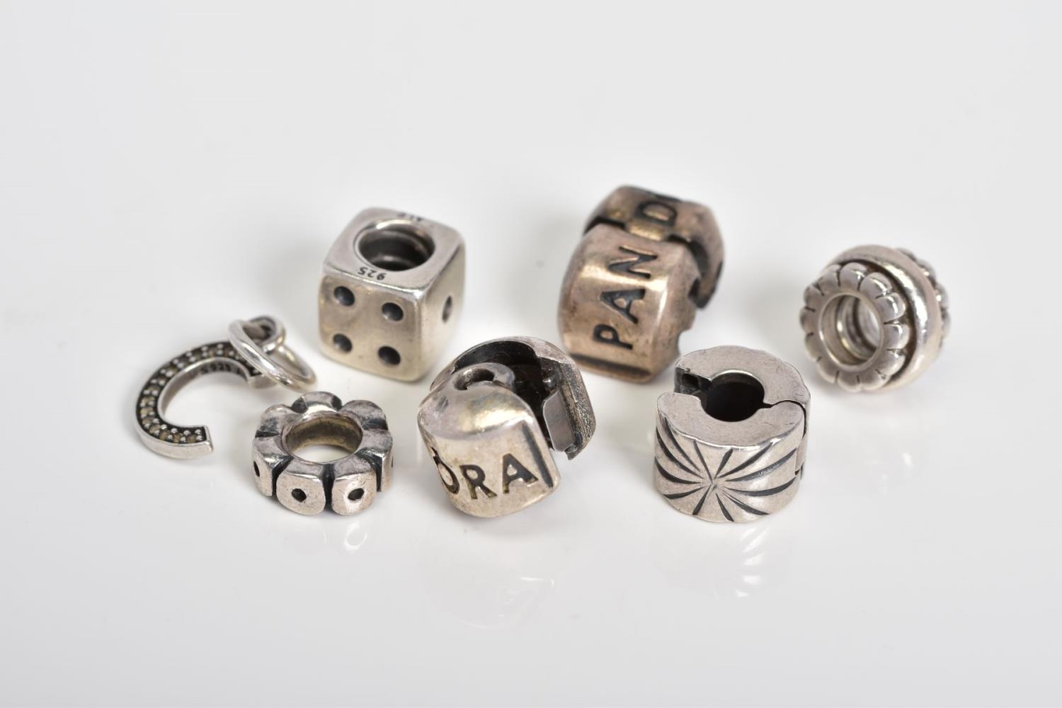 A COLLECTION OF SIX PANDORA CHARMS, to include a dice, letter C initial set with colourless paste, two Pandora hinged clasps, together with two beaded circular charms, all stamped ALE 925, approximate gross weight 14.2 grams