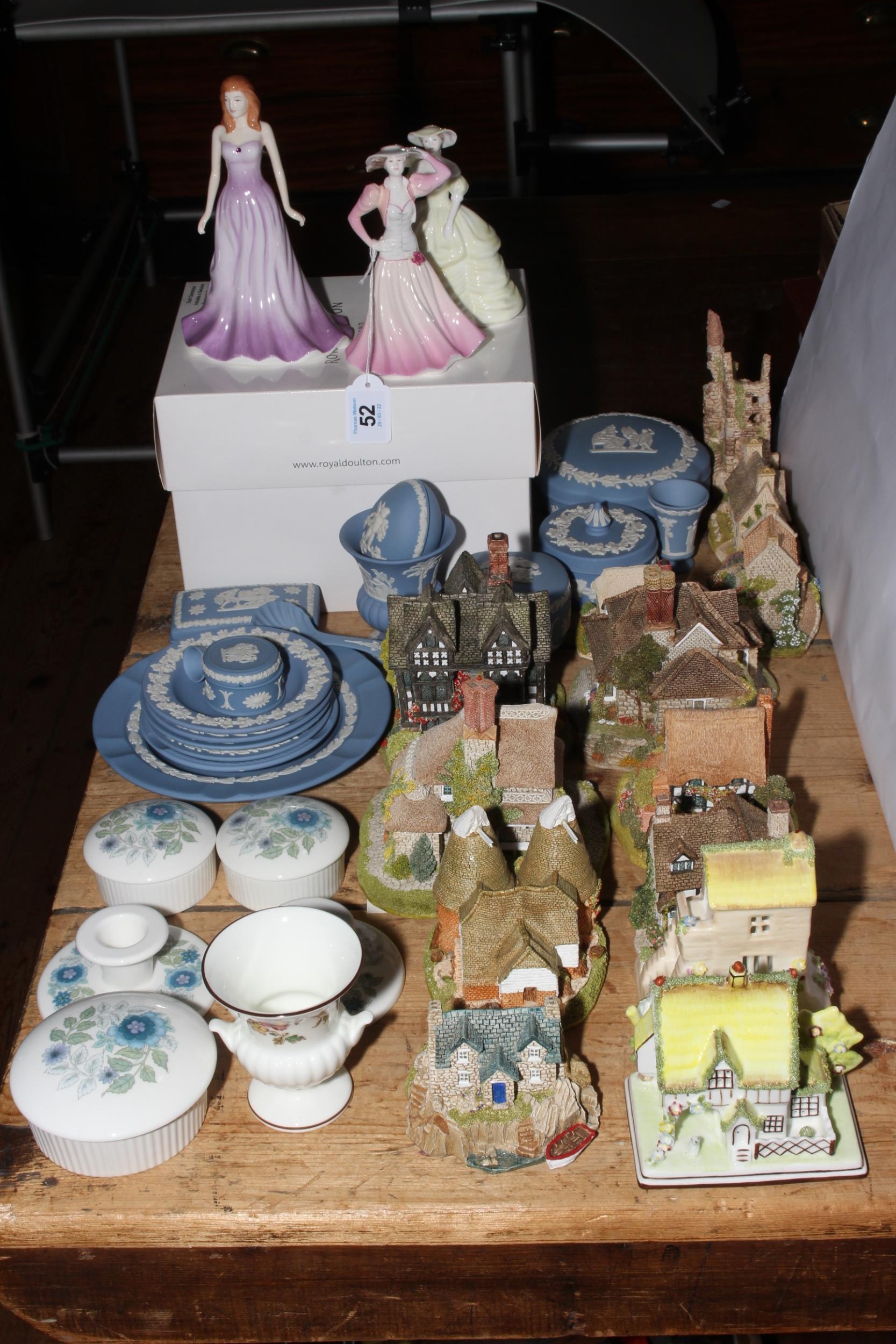 Lilliput Lane cottages, Coalport cottages, Wedgwood Blue Jasperware, Royal Doulton and Coalport figurines.