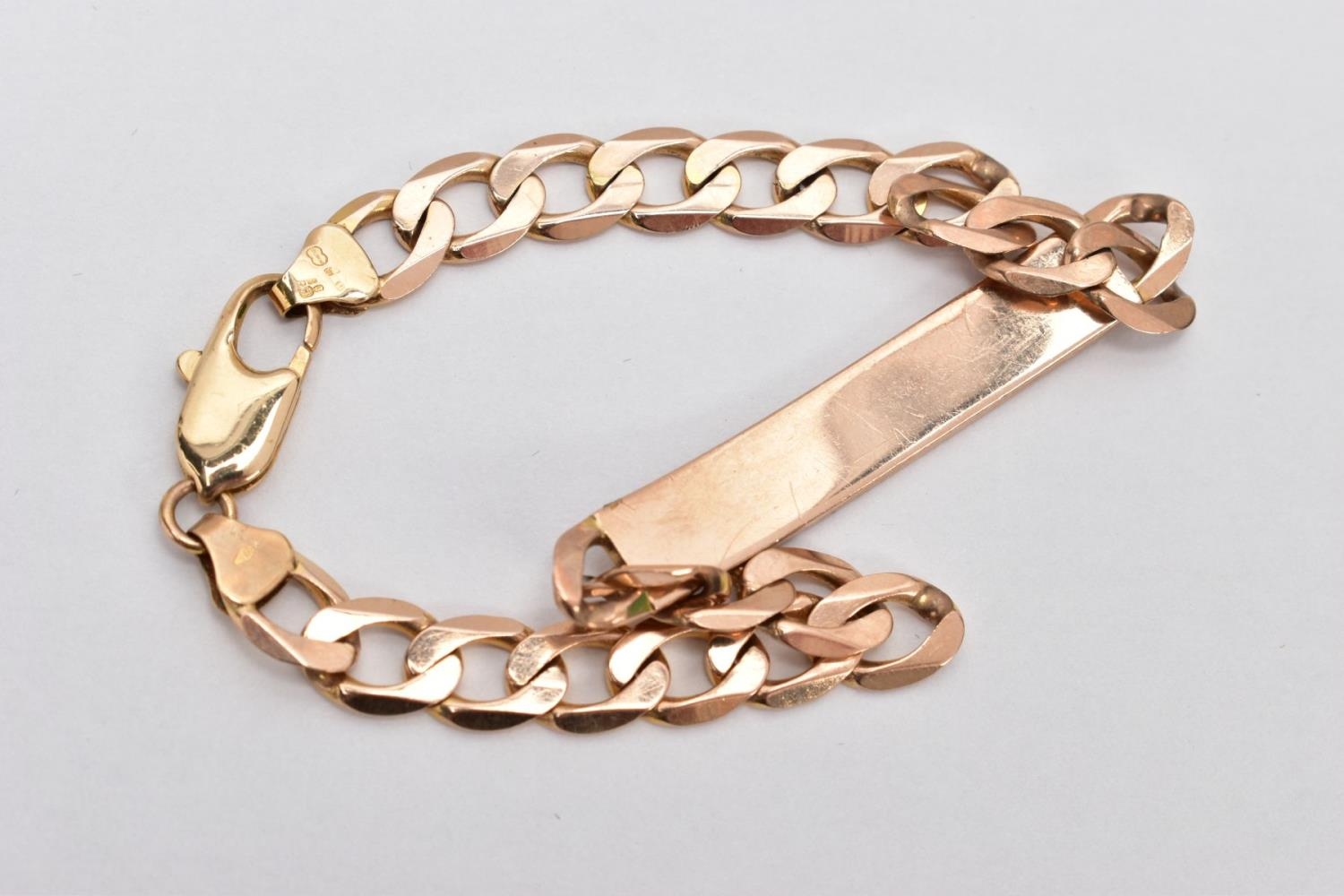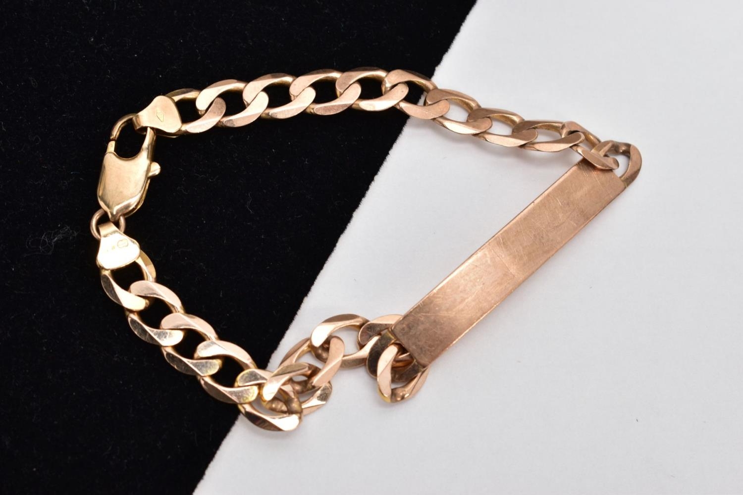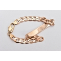 A 9CT GOLD IDENTIFICATION BRACELET, vacant identification panel, on a flat curb link bracelet fitted with a lobster claw clasp, hallmarked 9ct gold Sheffield, length 210mm, approximate gross weight 14.3 grams (condition report: general light wear, slight surface scratches in places, clasp in working condition, overall condition good)