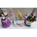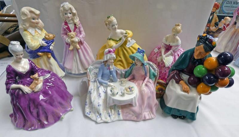SEVEN ROYAL DOULTON PORCELAIN FIGURES INCLUDING HN1315 - THE OLD BALLOON, HN1747 - AFTERNOON TEA, HN3087 - CHARITY AND OTHERS