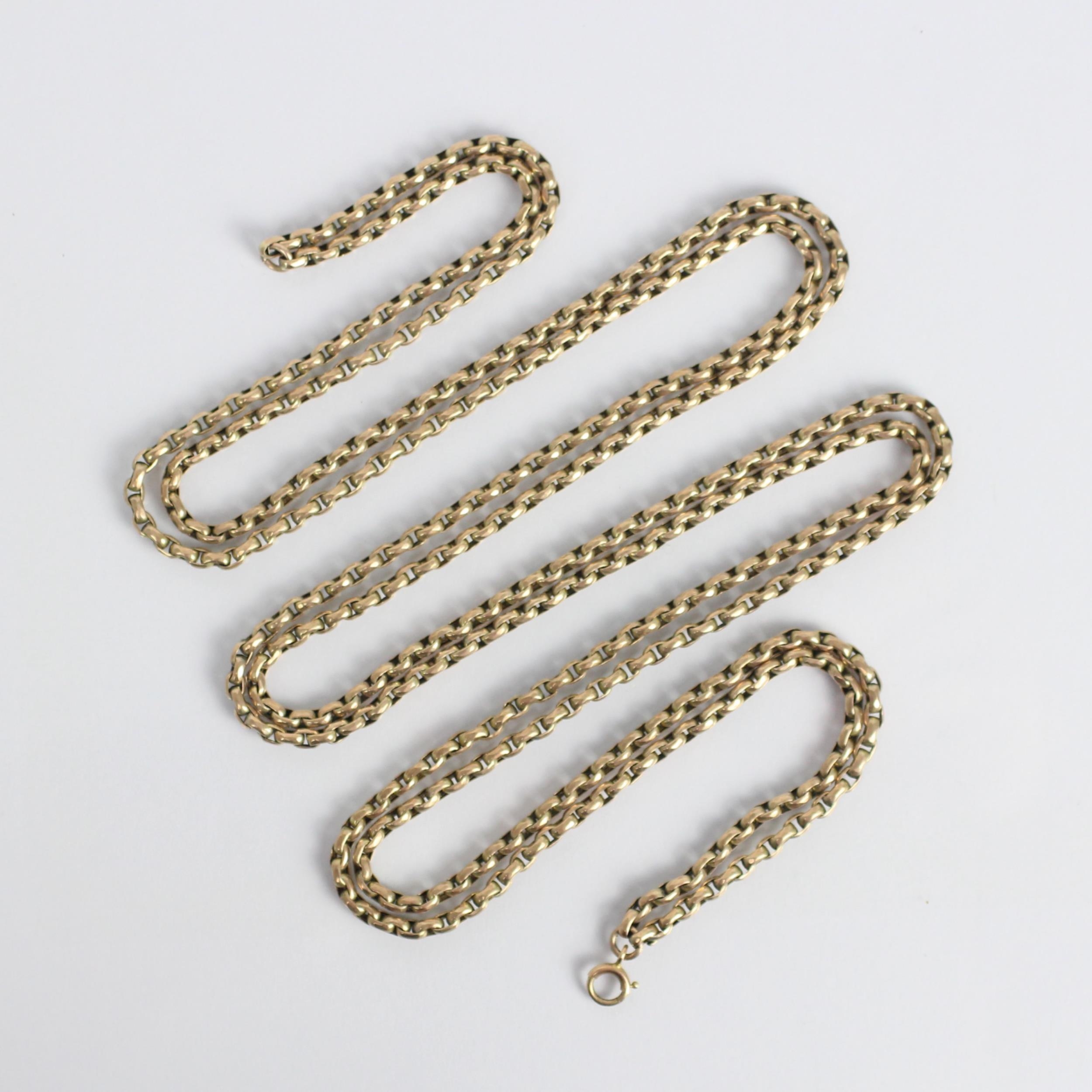 An early 20th century yellow metal long guard chain, of typical form, converted to be a double row with associated bolt ring fastening, applied '9c' pad, 79cm long, 36gms