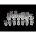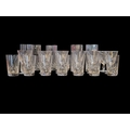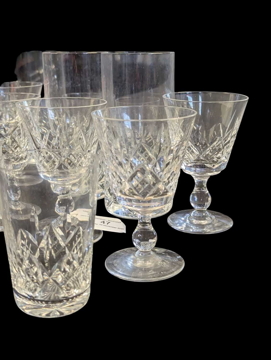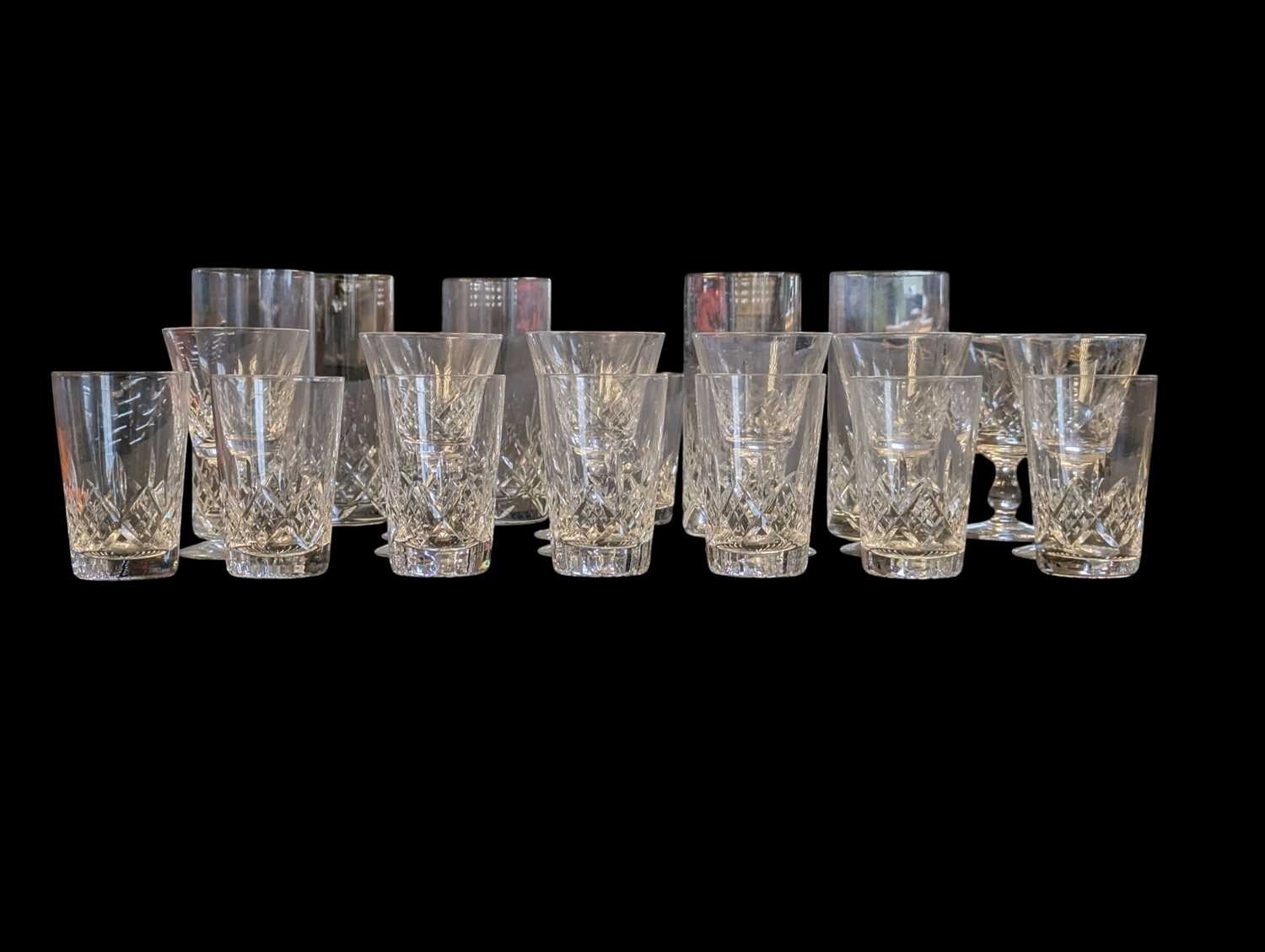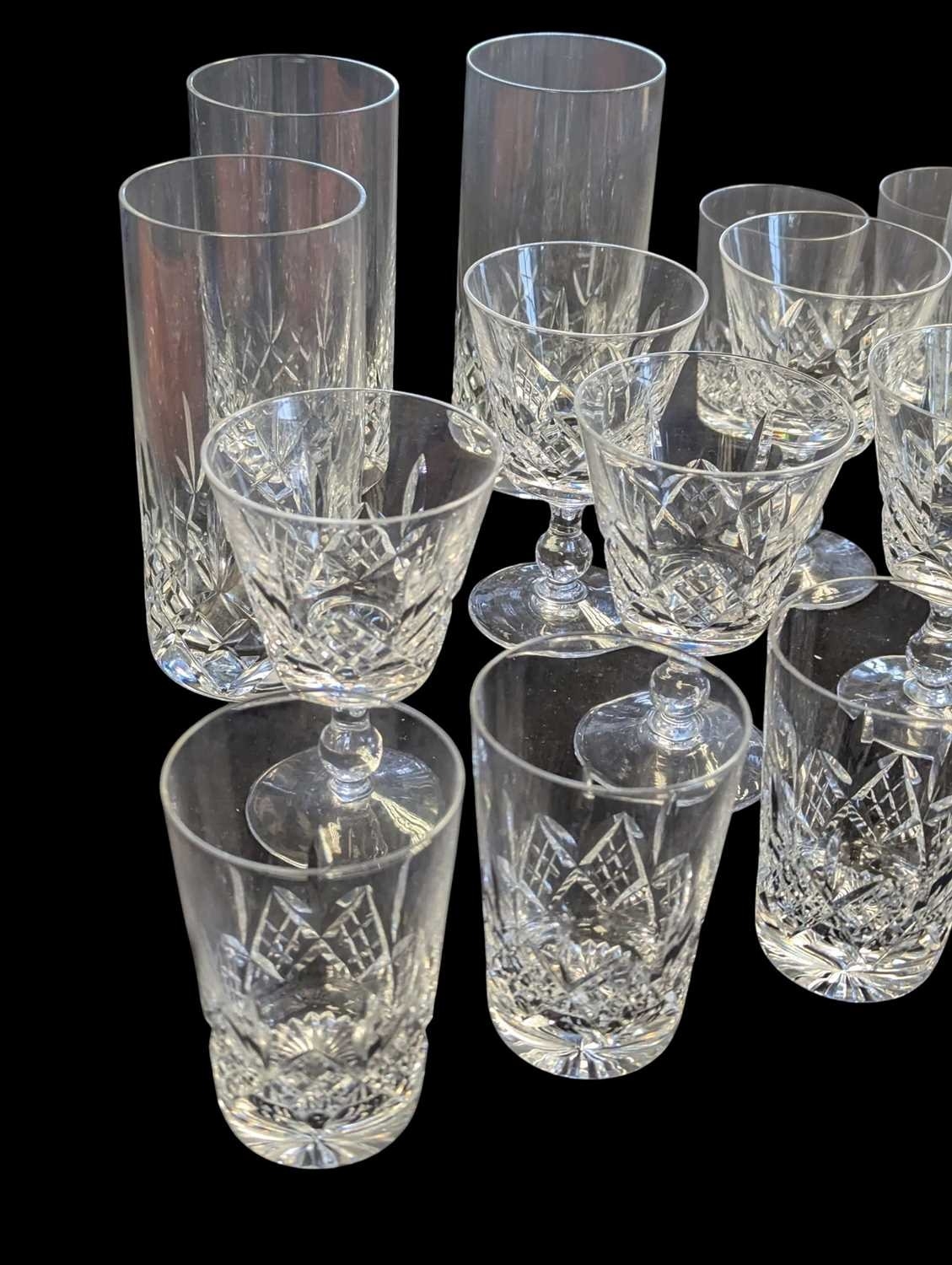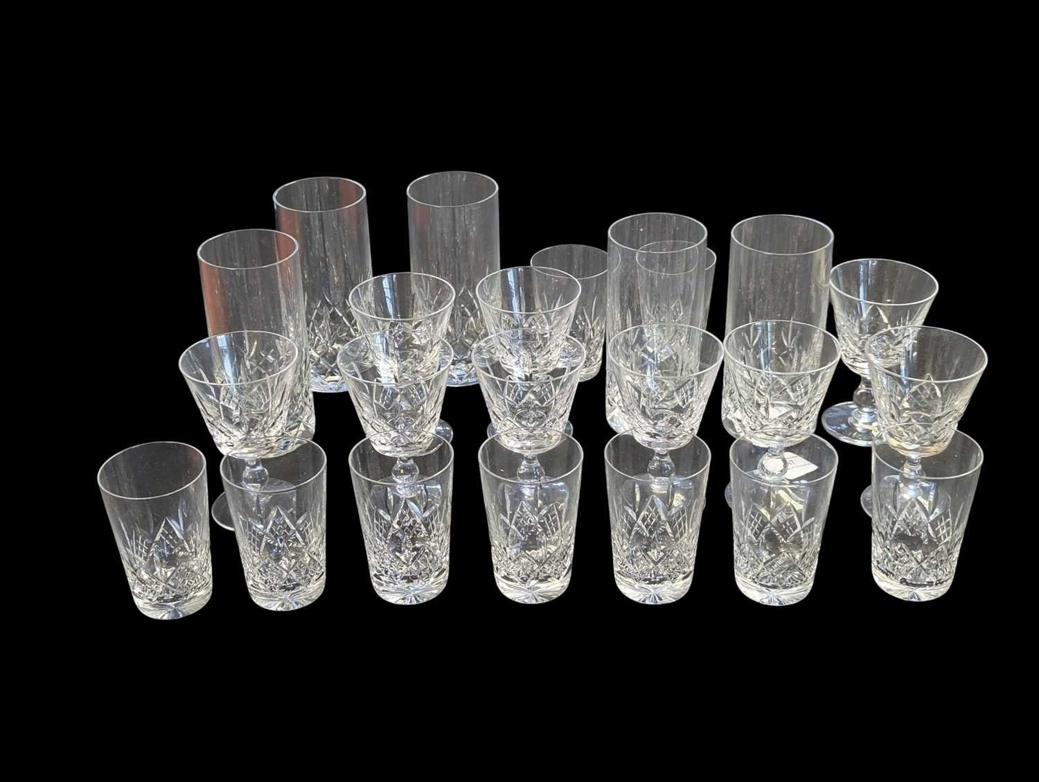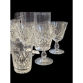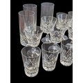 A collection of vintage 20th century crystal cut glass glasses, including 6 highball and 9 whisky tumblers plus 9 wine glasses. The wine glasses with circular foot on a stem, all with Lismore manner pattern to it.