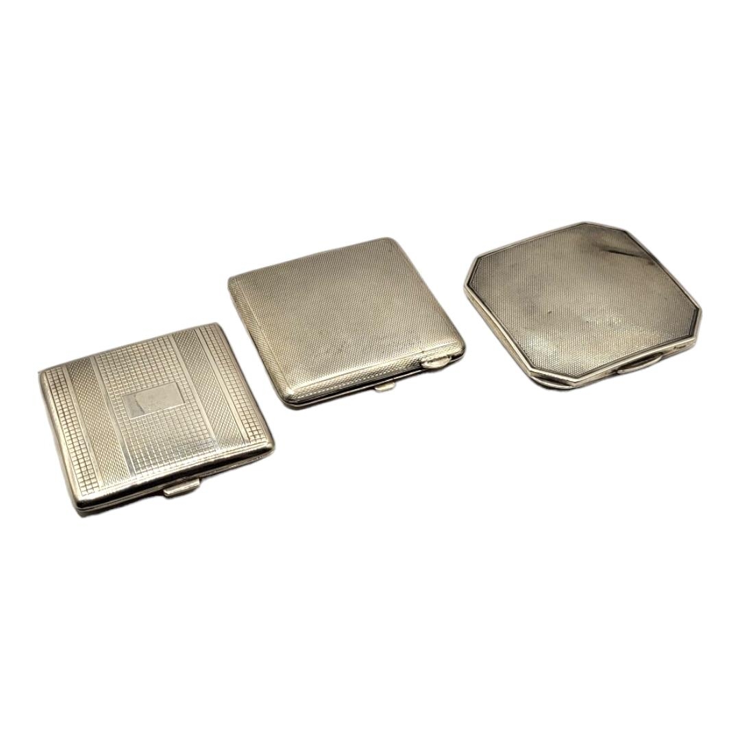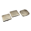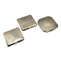Comprising square form silver compact, hallmarked Harman Brothers, Birmingham, 1946 and square form with chamfered corners, hallmarked William Neale & Son Ltd, Birmingham, 1936, all having varying engine turned decoration to both sides.