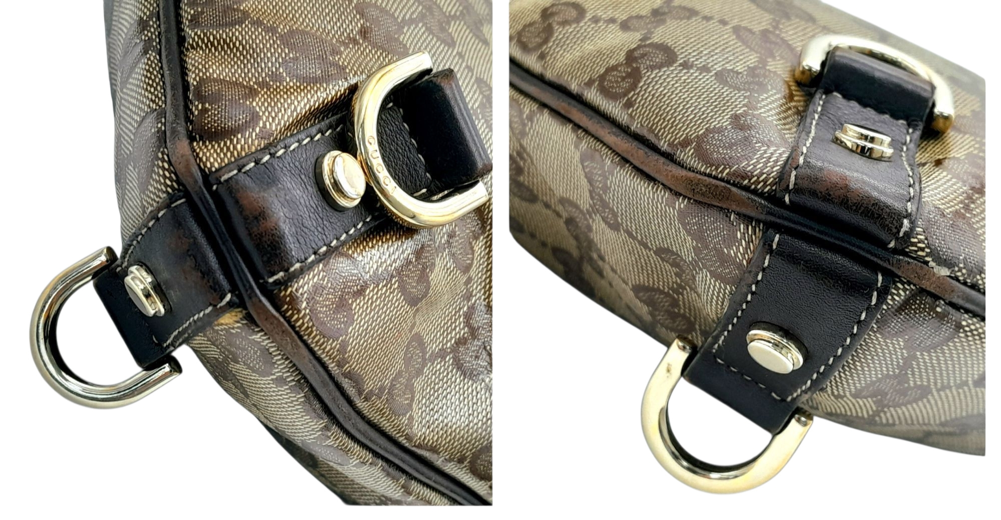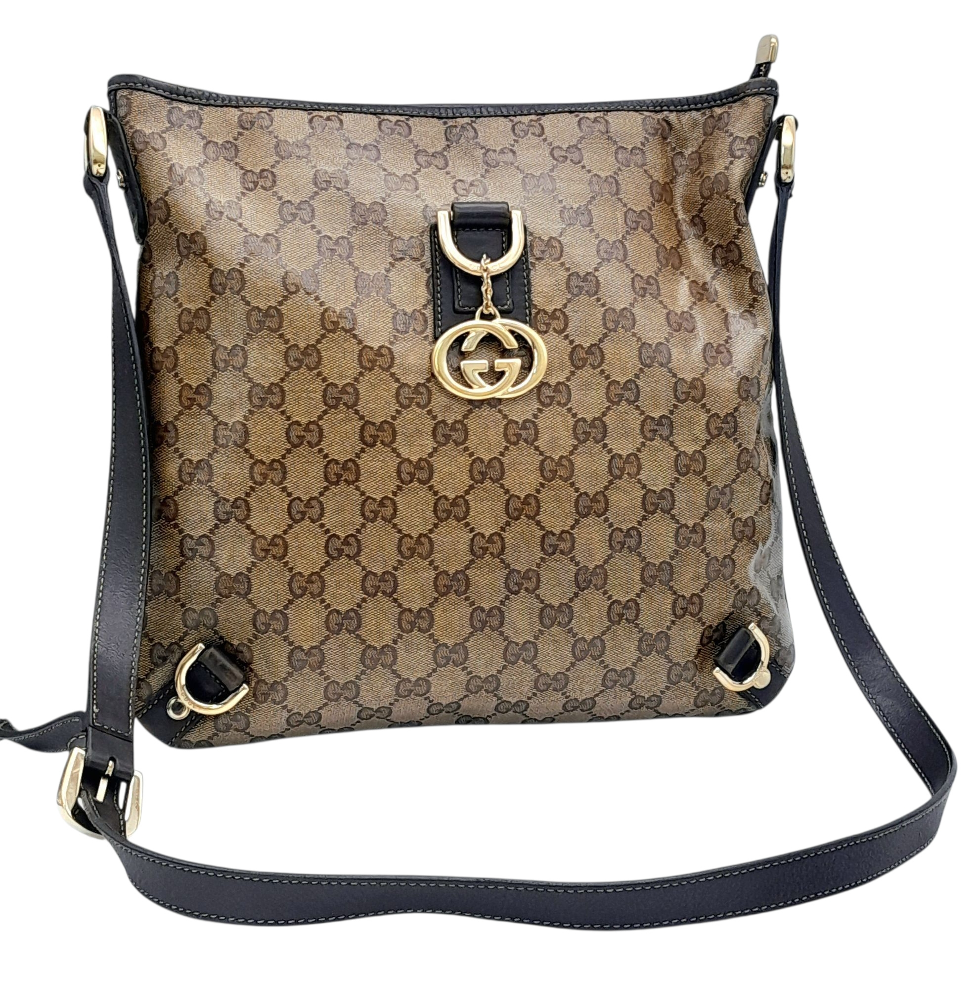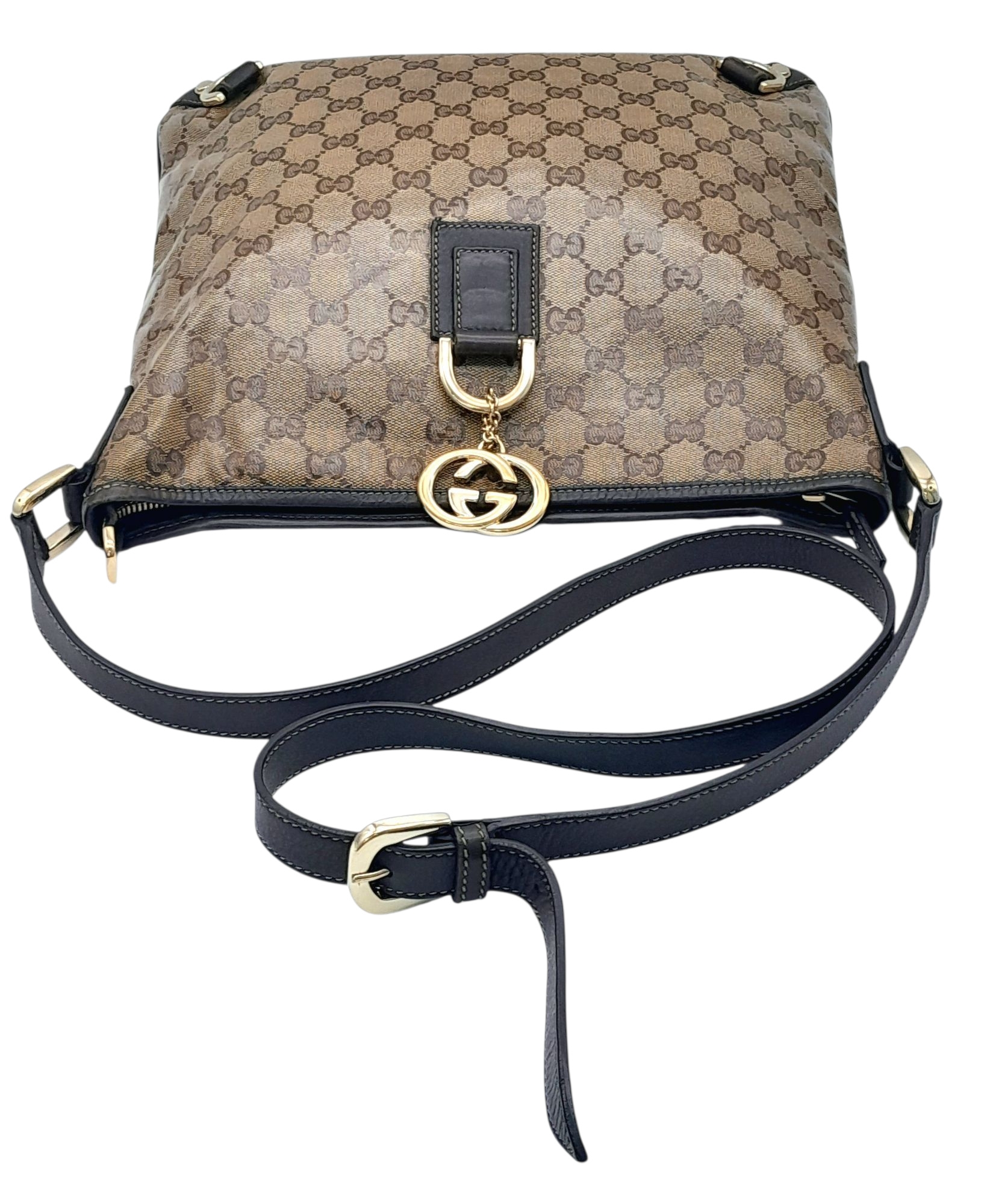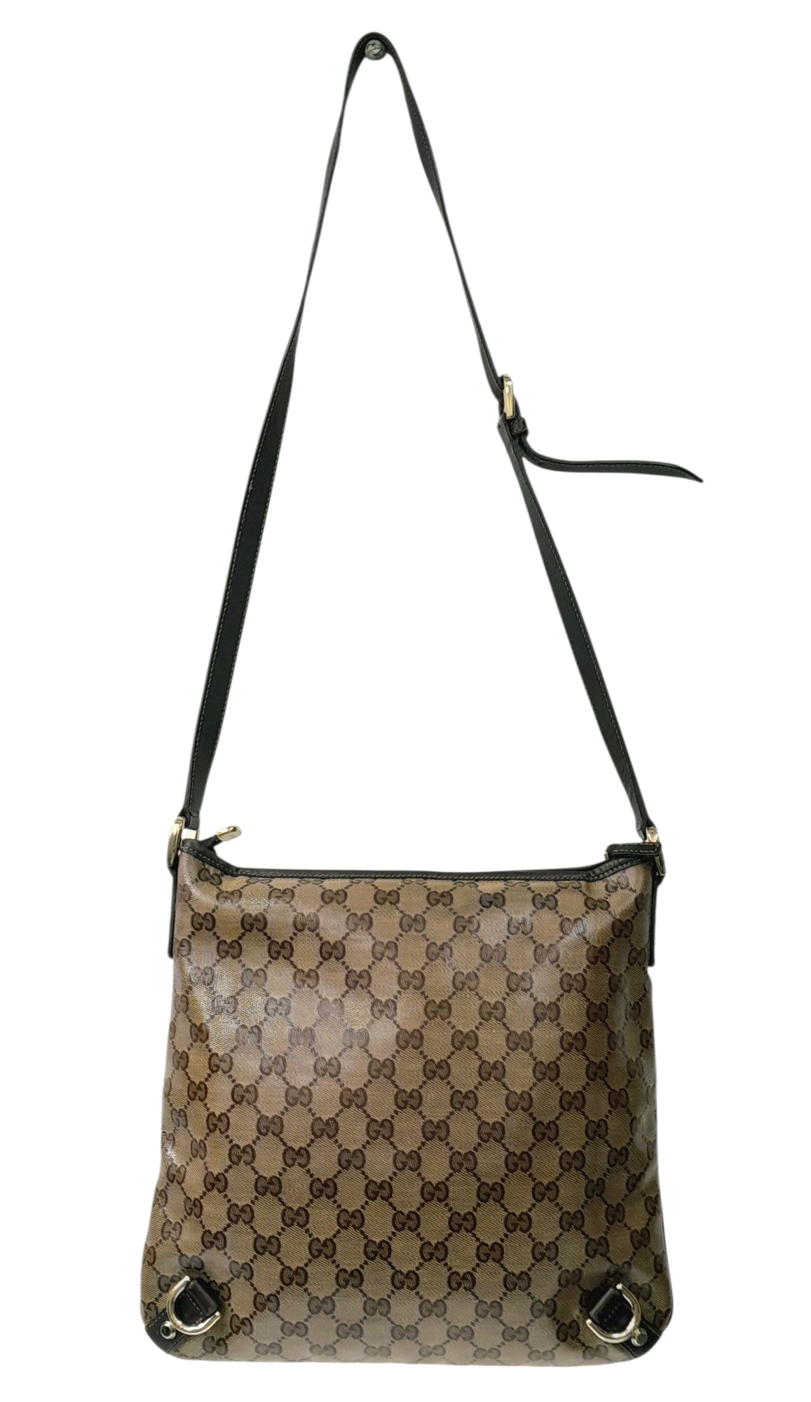 A Gucci Brown GG Monogram Canvas Crossbody Bag. Brown GG monogram canvas exterior with gold-toned hardware, an adjustable leather shoulder straps, and zipped top closure. Brown textile interior with one main compartment and a zipped inner side pocket. Some signs of wear to the exterior canvas and scratches to hardware. Approx 33cm length x 27cm height. Please see photos or request a condition report. Ref: STK022900