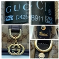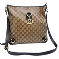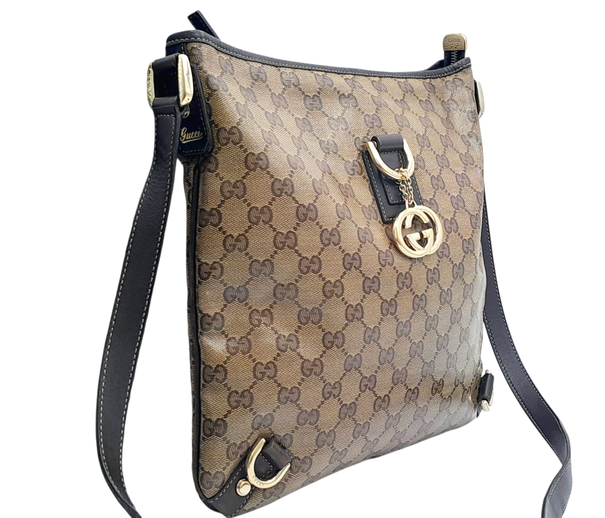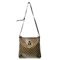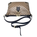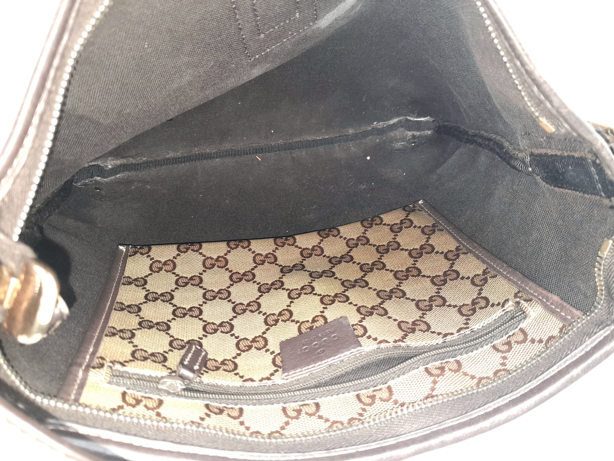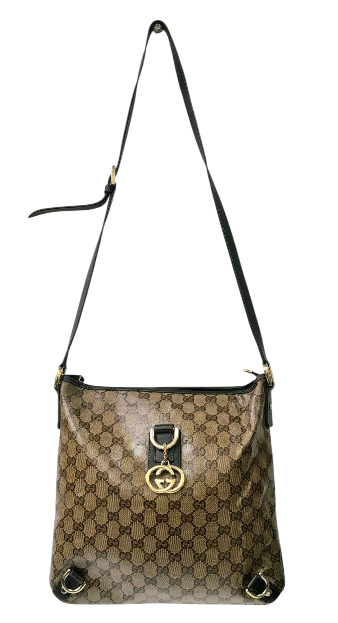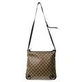 A Gucci Brown GG Monogram Canvas Crossbody Bag. Brown GG monogram canvas exterior with gold-toned hardware, an adjustable leather shoulder straps, and zipped top closure. Brown textile interior with one main compartment and a zipped inner side pocket. Some signs of wear to the exterior canvas and scratches to hardware. Approx 33cm length x 27cm height. Please see photos or request a condition report. Ref: STK022900