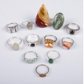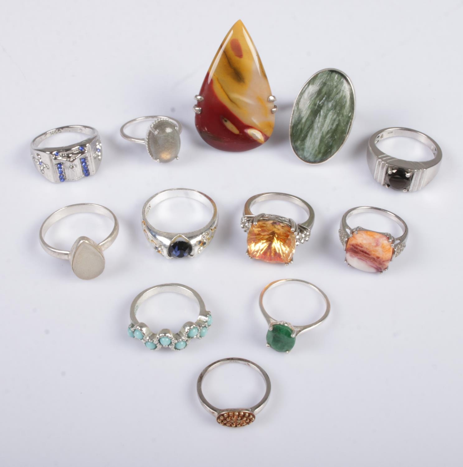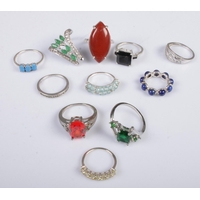 Twelve silver dress rings. Includes coloured paste stone examples, etc. 62g.