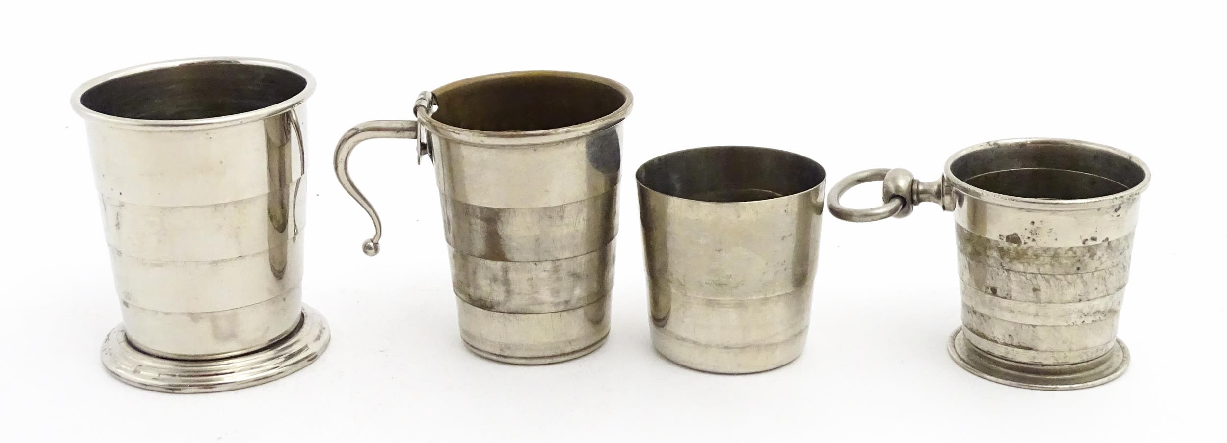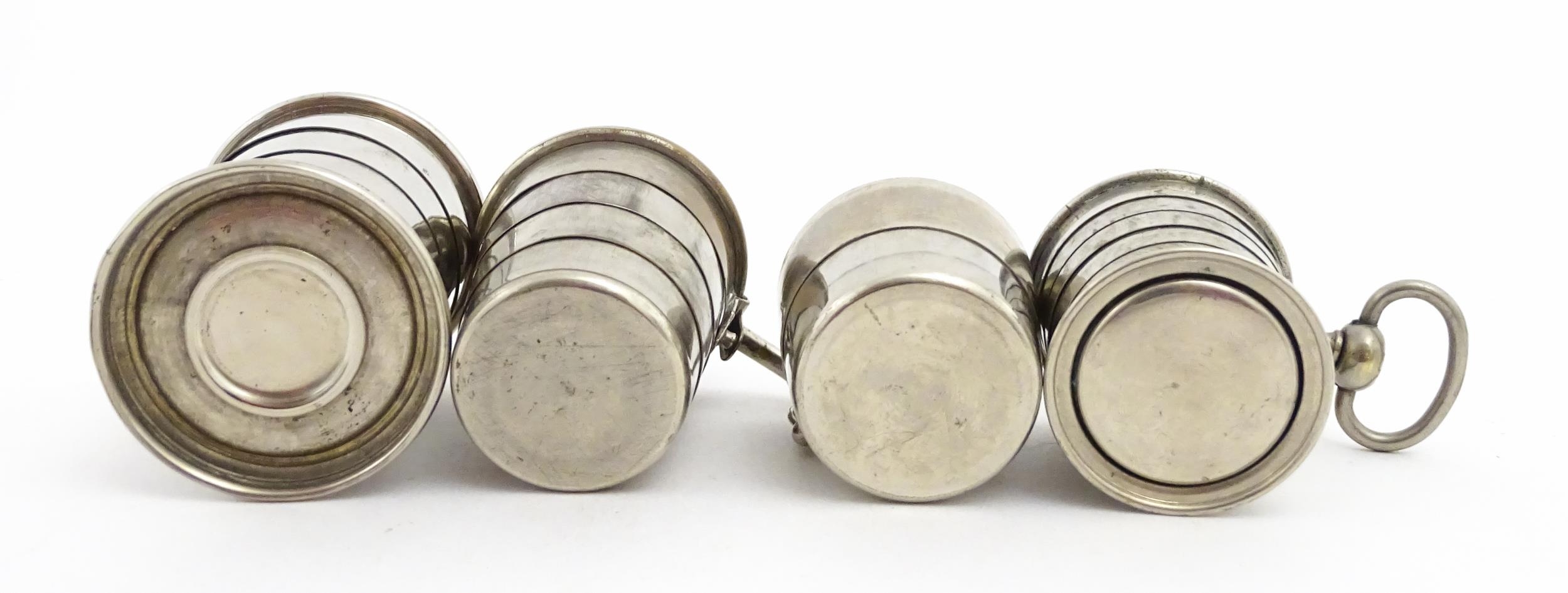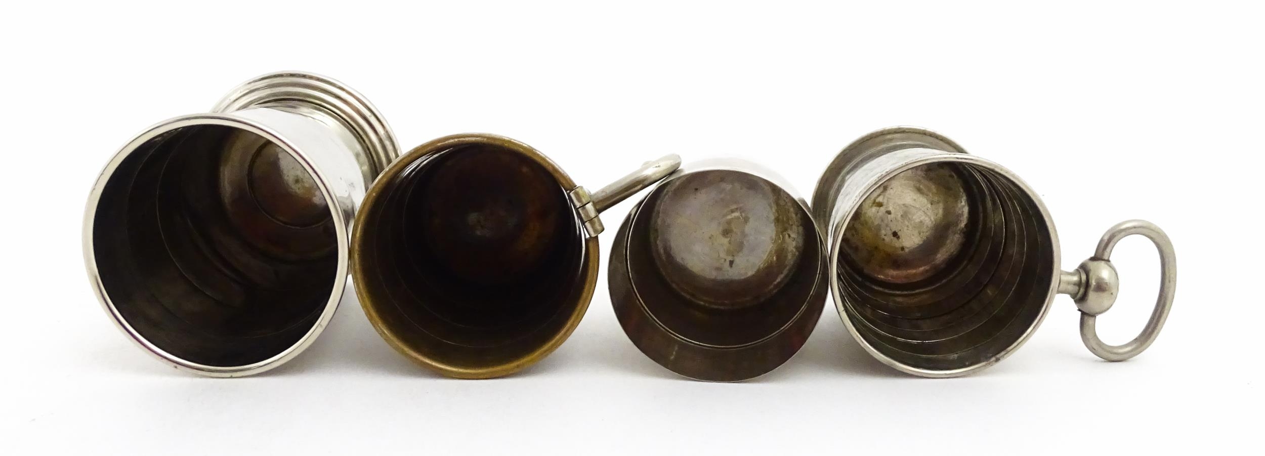 Four early 20thC silver plate collapsible stirrup cups, to include one of novelty pocket watch form. Largest approx. 2" wide (4)