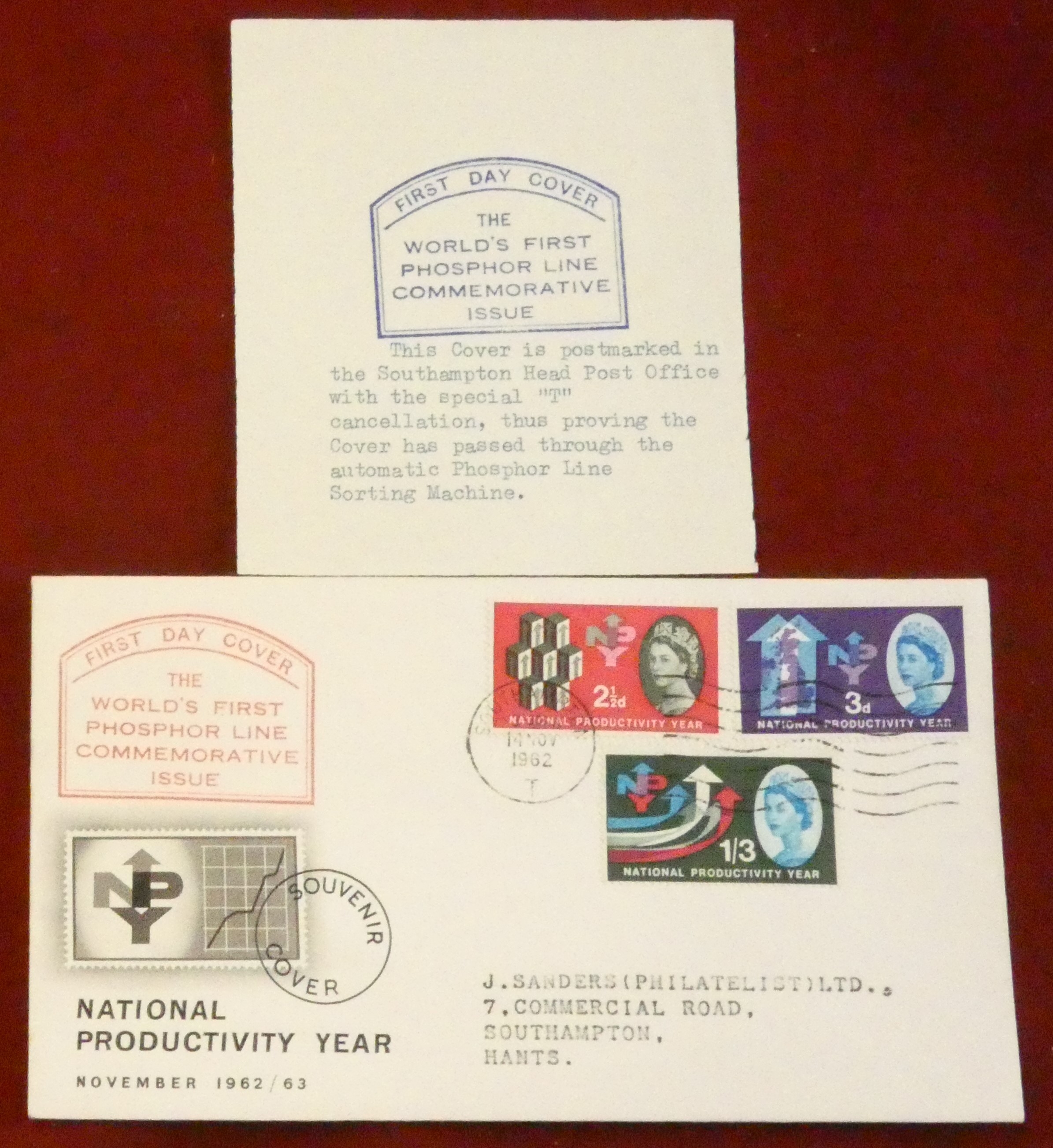 Great Britain 1962 National Productivity Year F.D.C World's first Phosphor line commemmorative issue with special "T" Southampton Head Post Office cancel.