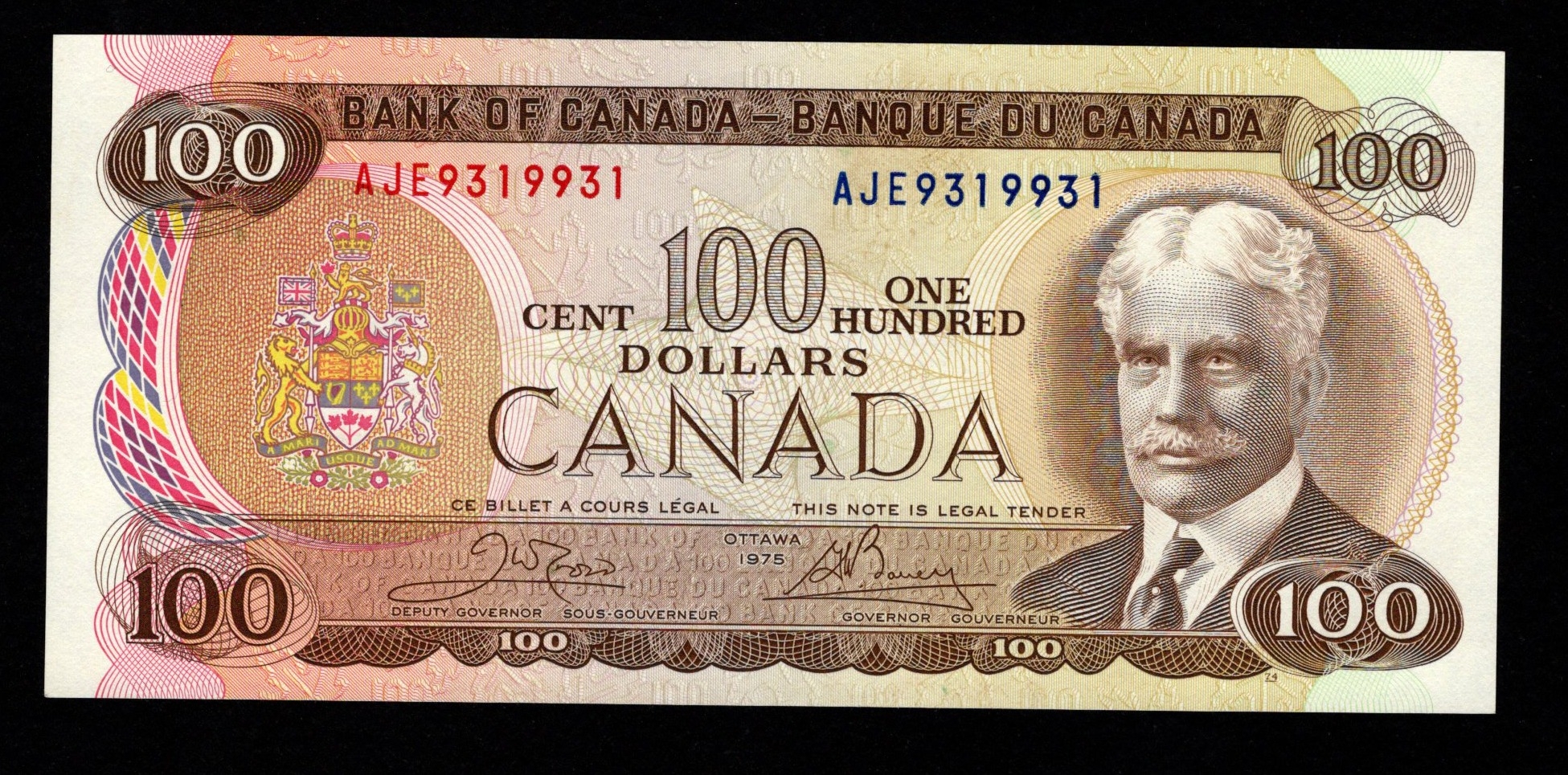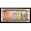Canada 100 Dollars dated 1975, signed Crow & Bouey, serial AJE 9319931 (BNB B354a, Pick91b) Uncirculated