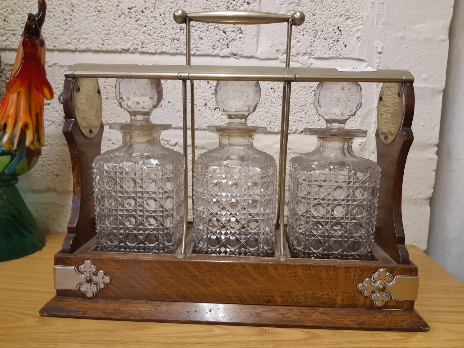 An early 20th century oak Tantalus featuring silver plated corner supports, carry handles and escutcheon, holding three cut lead crystal decanters of square form with matching stoppers