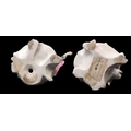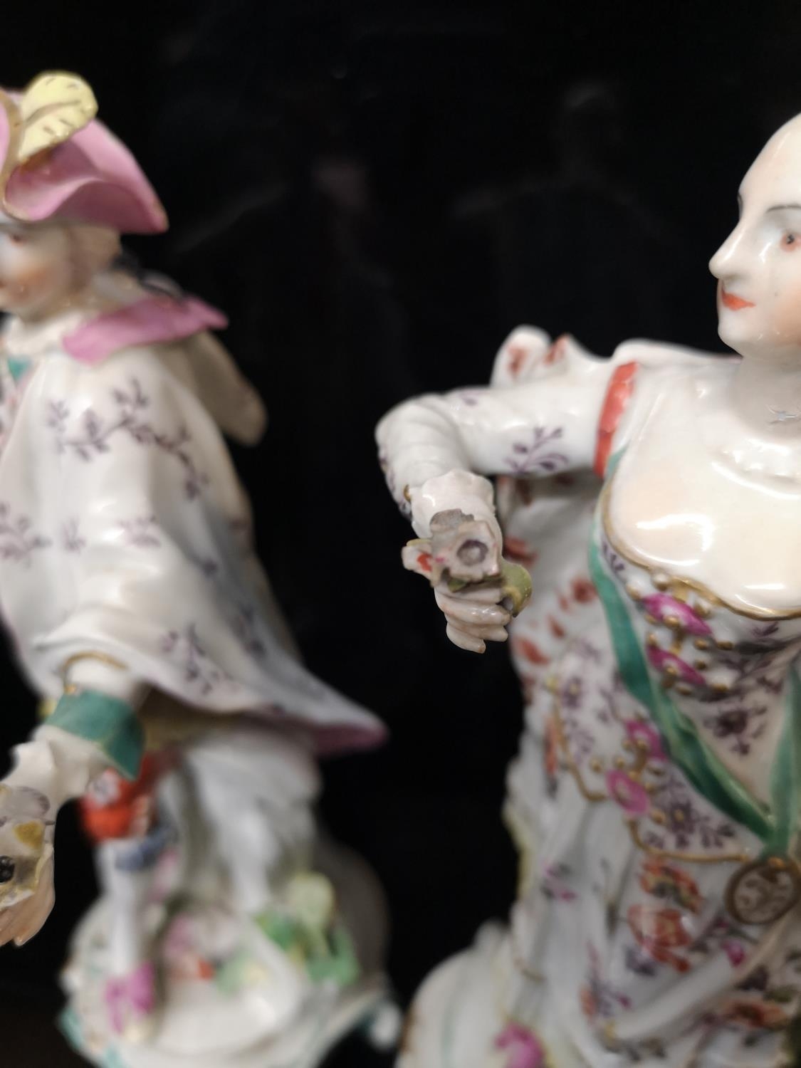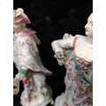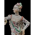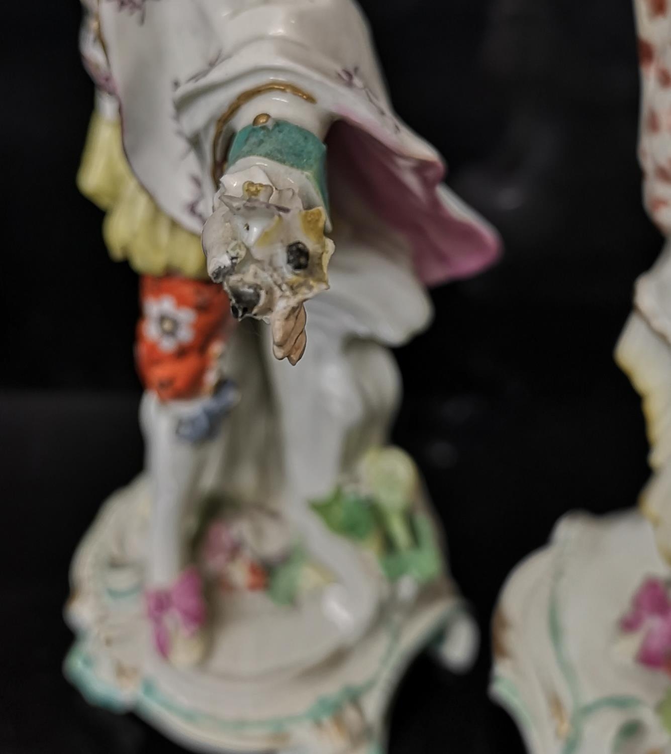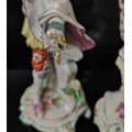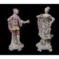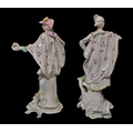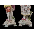 Both with an arm extended and holding a posy of flowers, attired in floral decorated costume and standing upon scroll moulded bases.