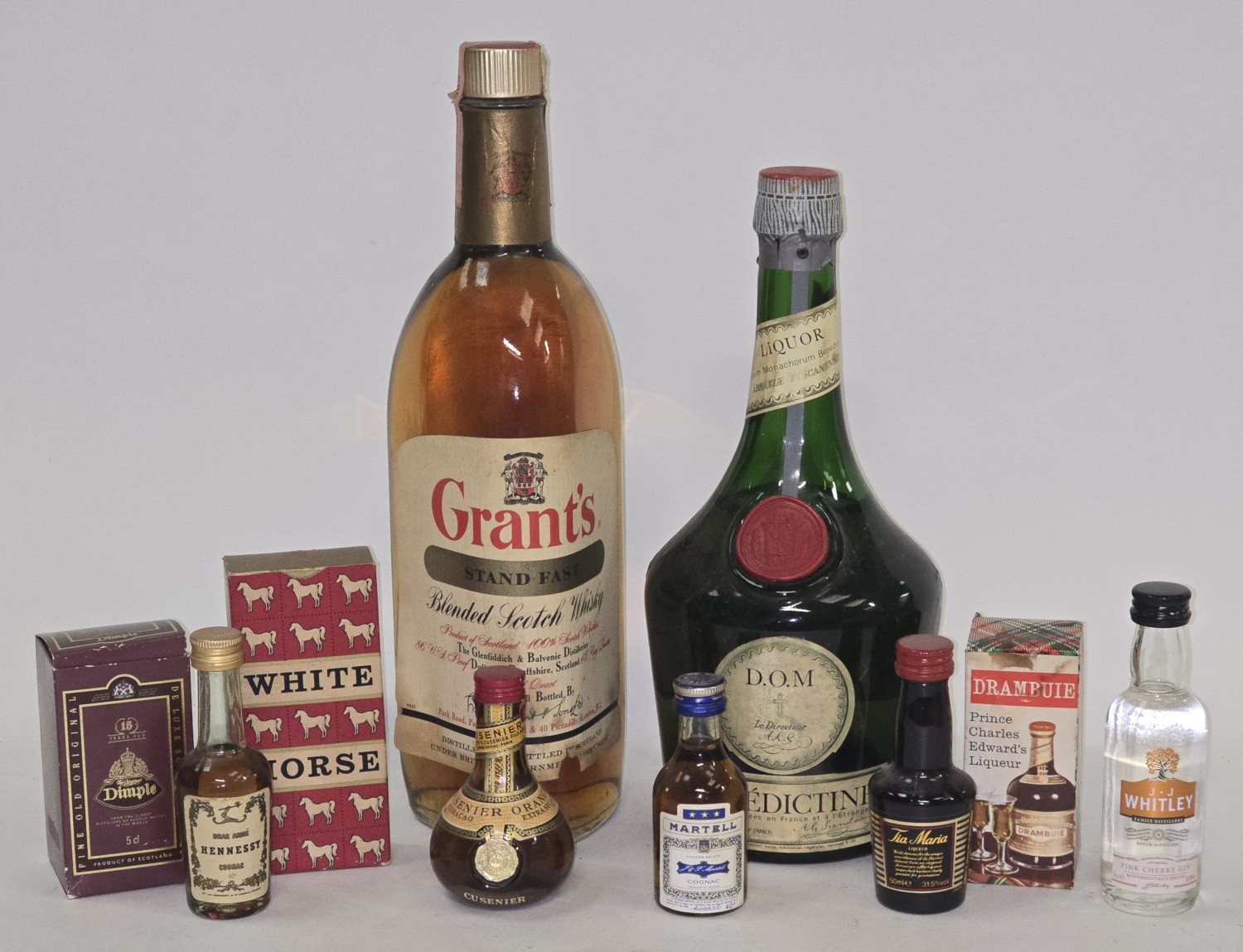 Quantity of misc. alcohol to include Grant's Blended Whisky , Benedictine Liqueur and an assortment of miniatures. Some vintage.
