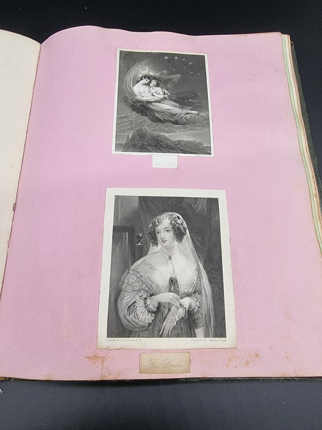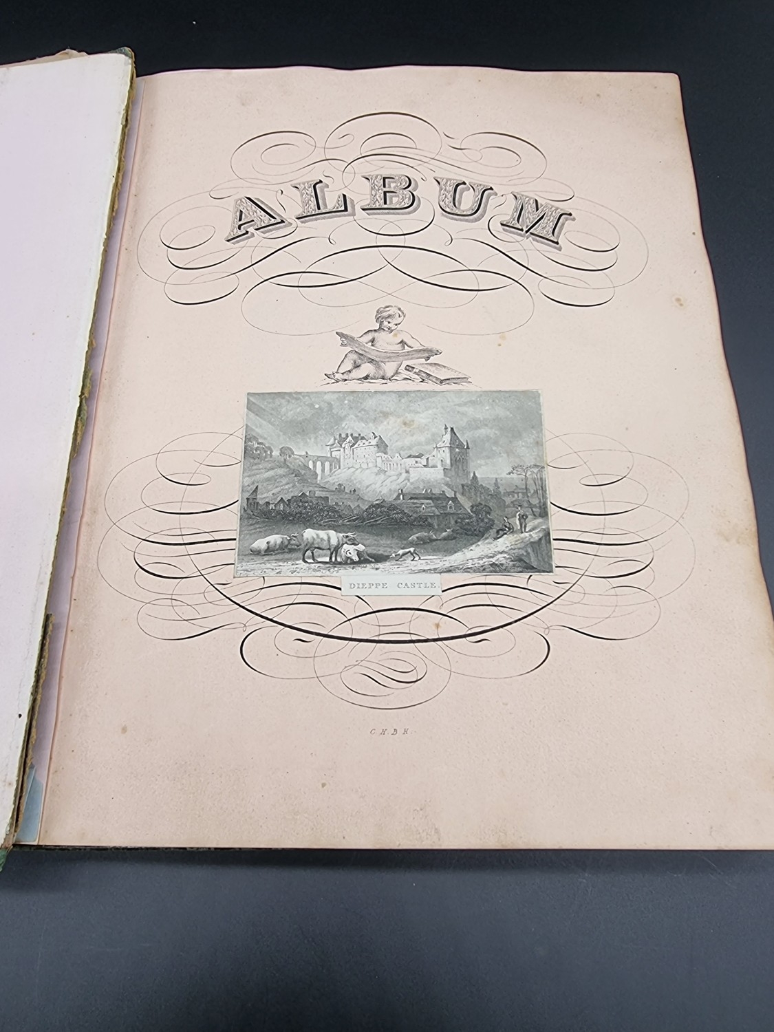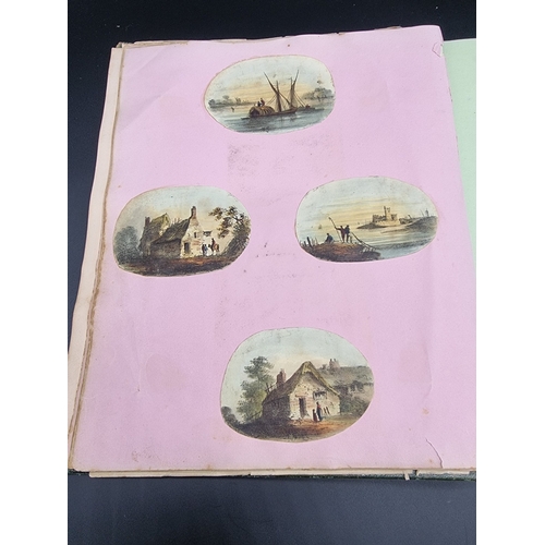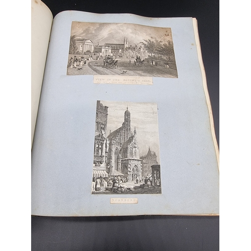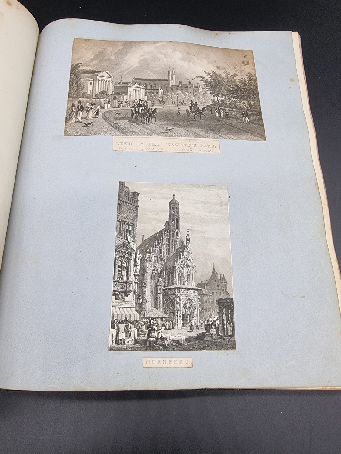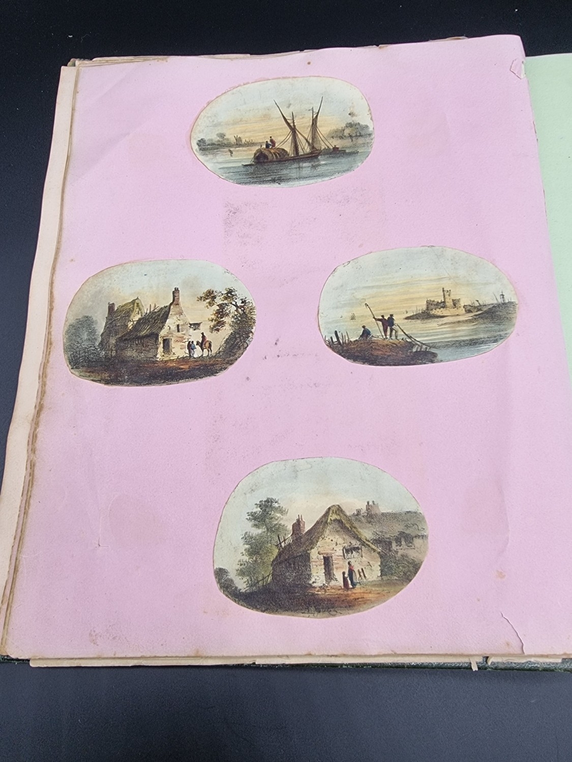SCRAP ALBUM, MID 19thC: an attractively composed album of engravings, pencil drawings (8) and watercolours (4), to include landscapes and flowers, together with a large cut silhouette of a lady in period dress heightened in gilt (loosely inserted), period album with embossed green calf covers by De la Rue & Co, aeg, front board and end papers detached, 4to. (1)