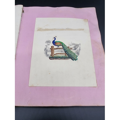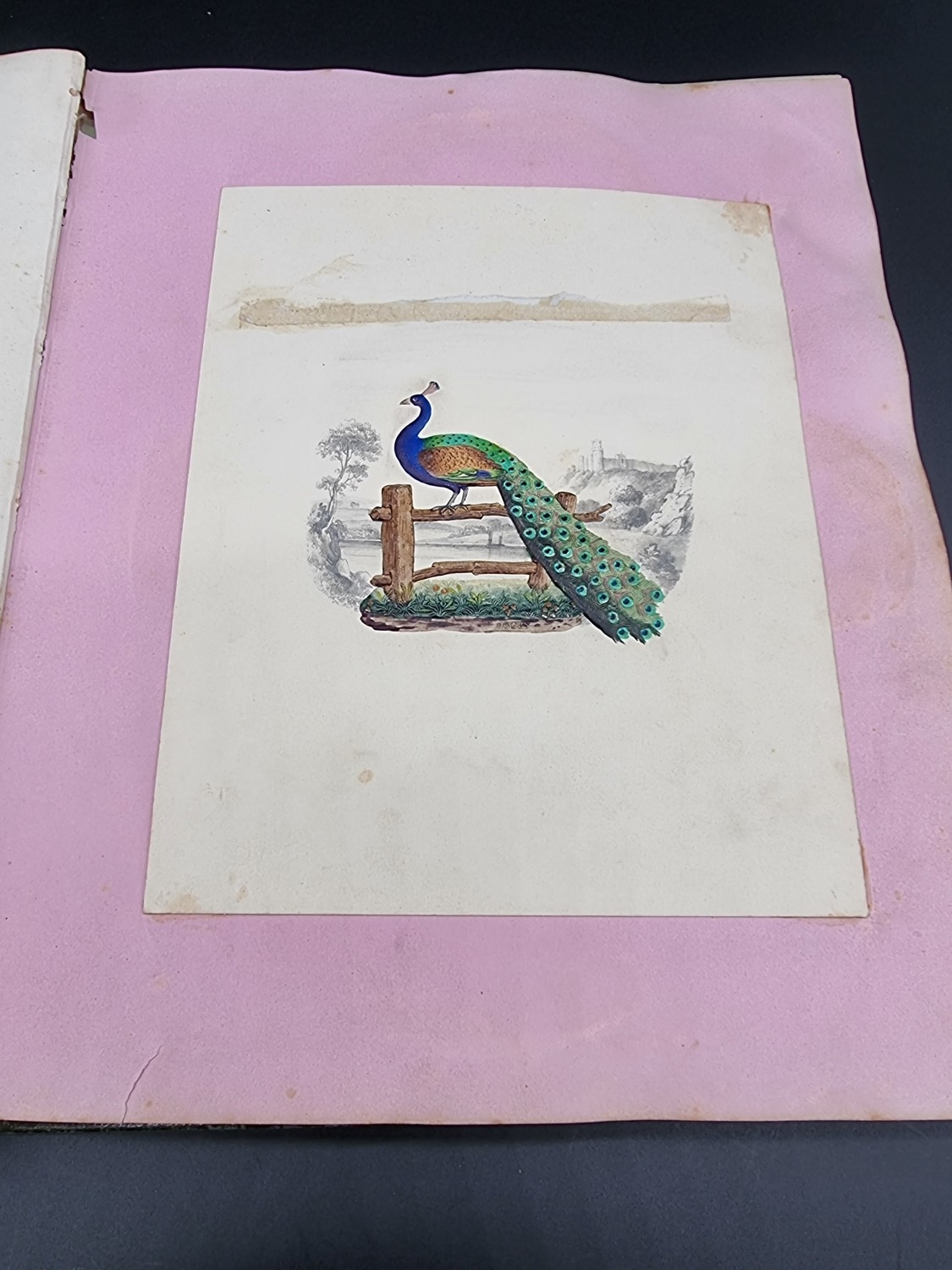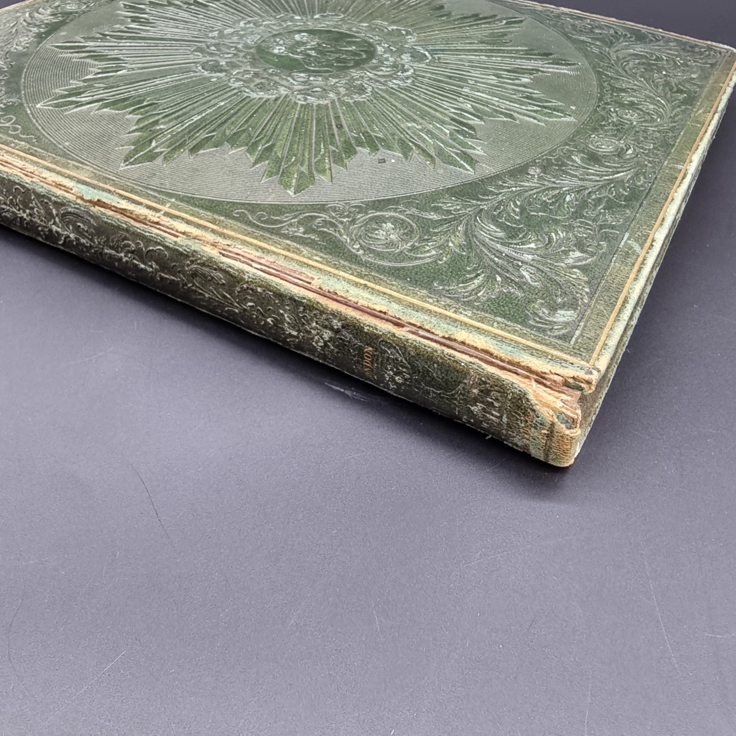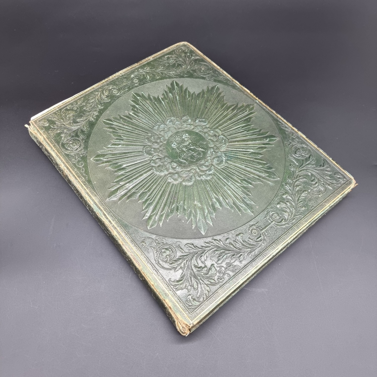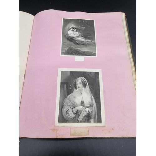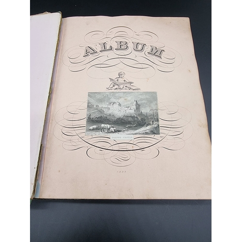 SCRAP ALBUM, MID 19thC: an attractively composed album of engravings, pencil drawings (8) and watercolours (4), to include landscapes and flowers, together with a large cut silhouette of a lady in period dress heightened in gilt (loosely inserted), period album with embossed green calf covers by De la Rue & Co, aeg, front board and end papers detached, 4to. (1)