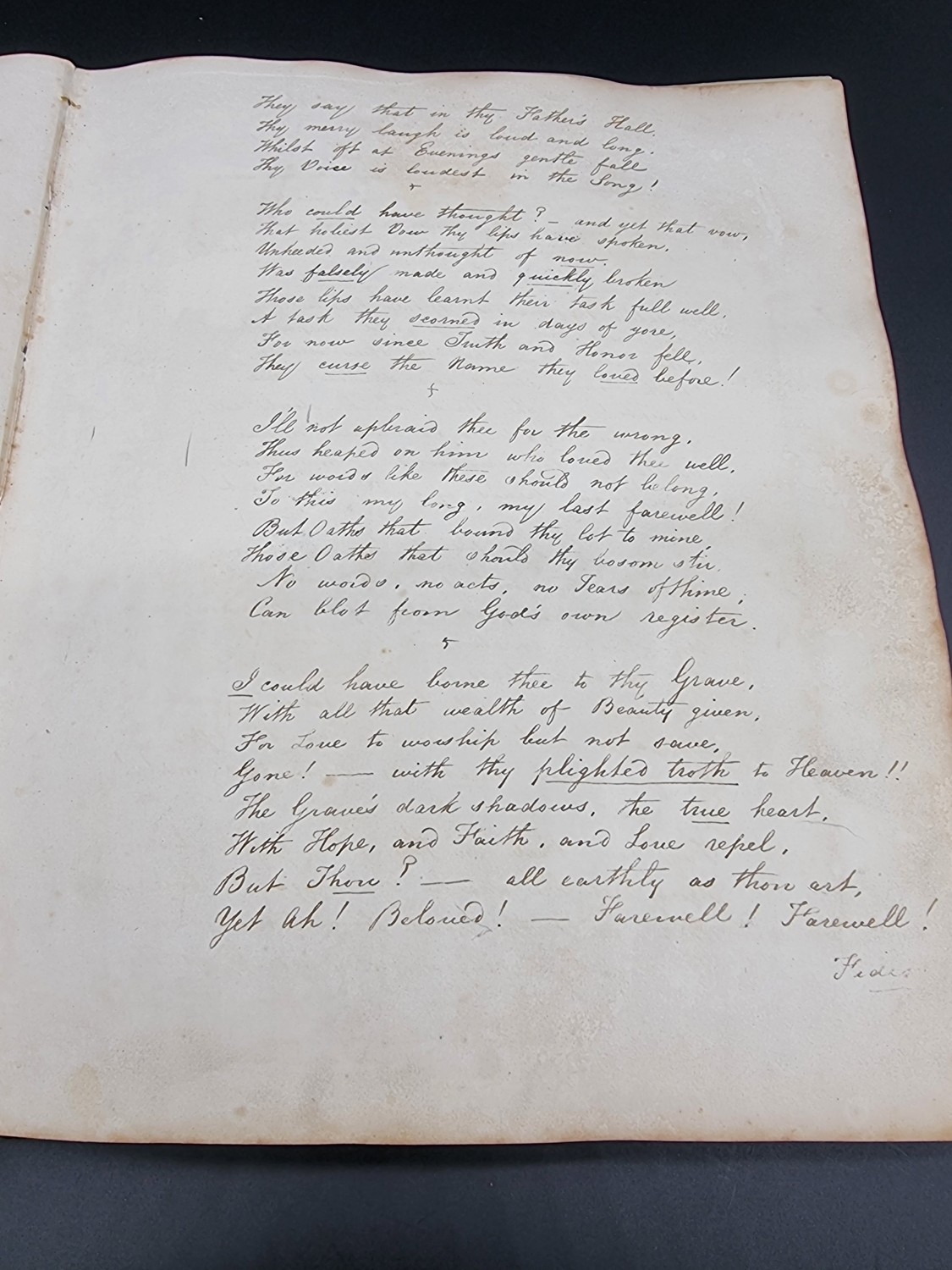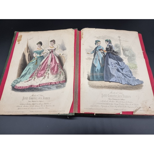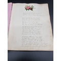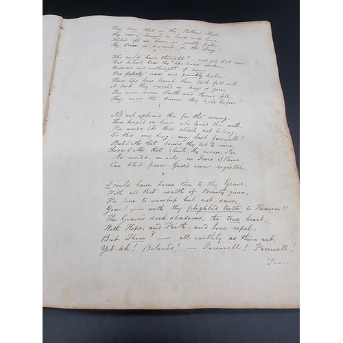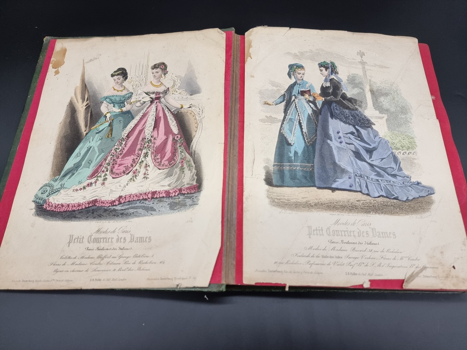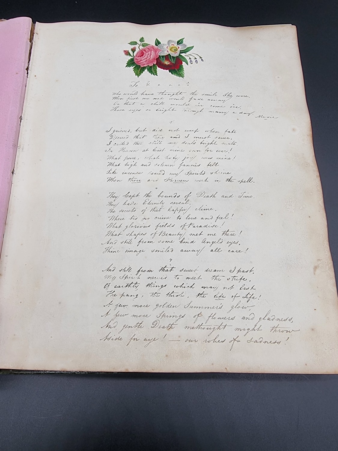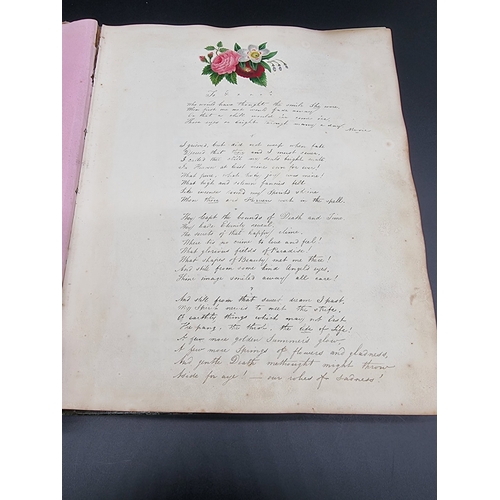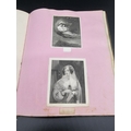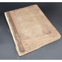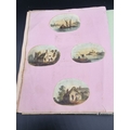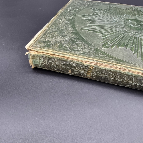 SCRAP ALBUM, MID 19thC: an attractively composed album of engravings, pencil drawings (8) and watercolours (4), to include landscapes and flowers, together with a large cut silhouette of a lady in period dress heightened in gilt (loosely inserted), period album with embossed green calf covers by De la Rue & Co, aeg, front board and end papers detached, 4to. (1)