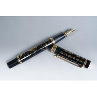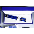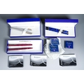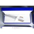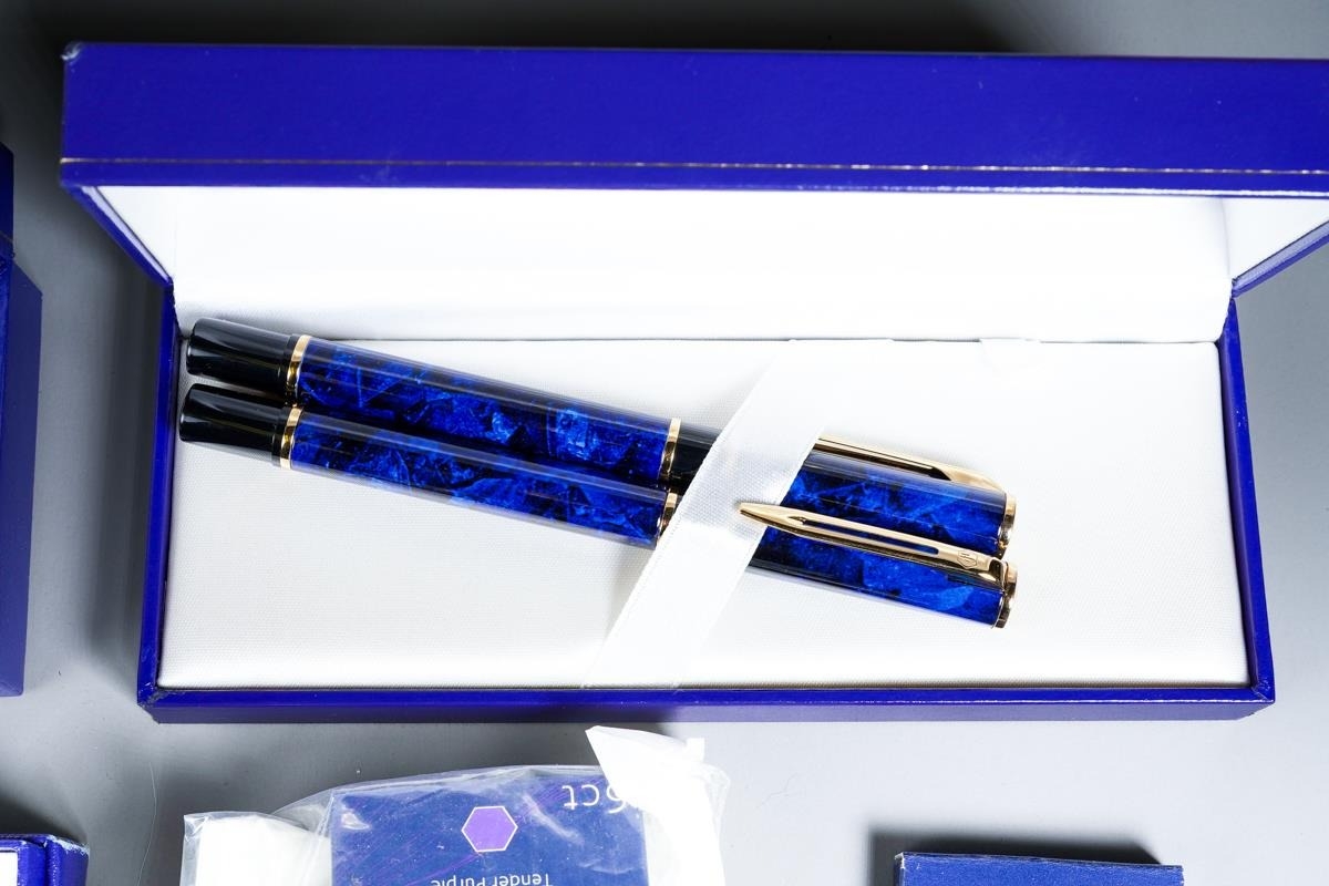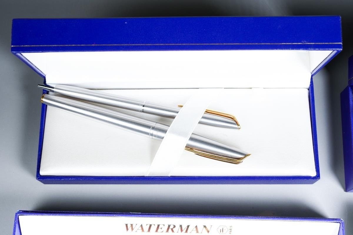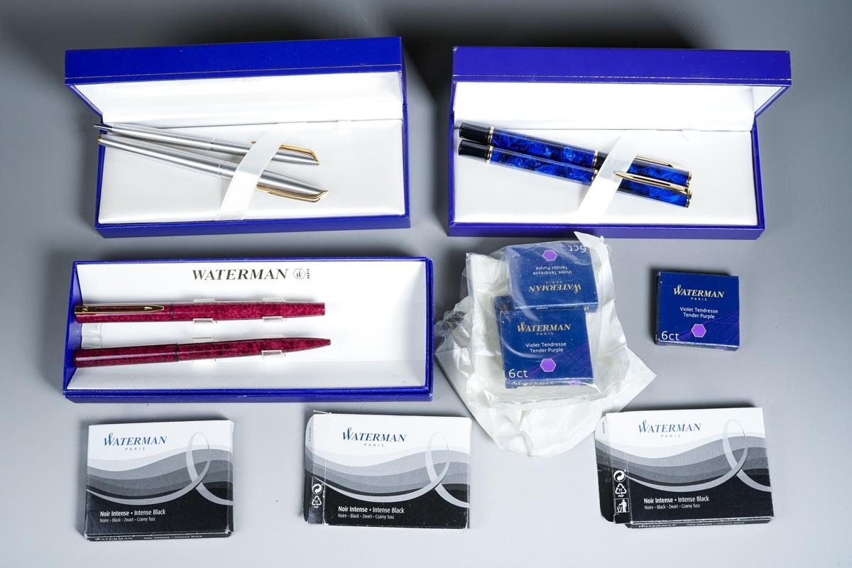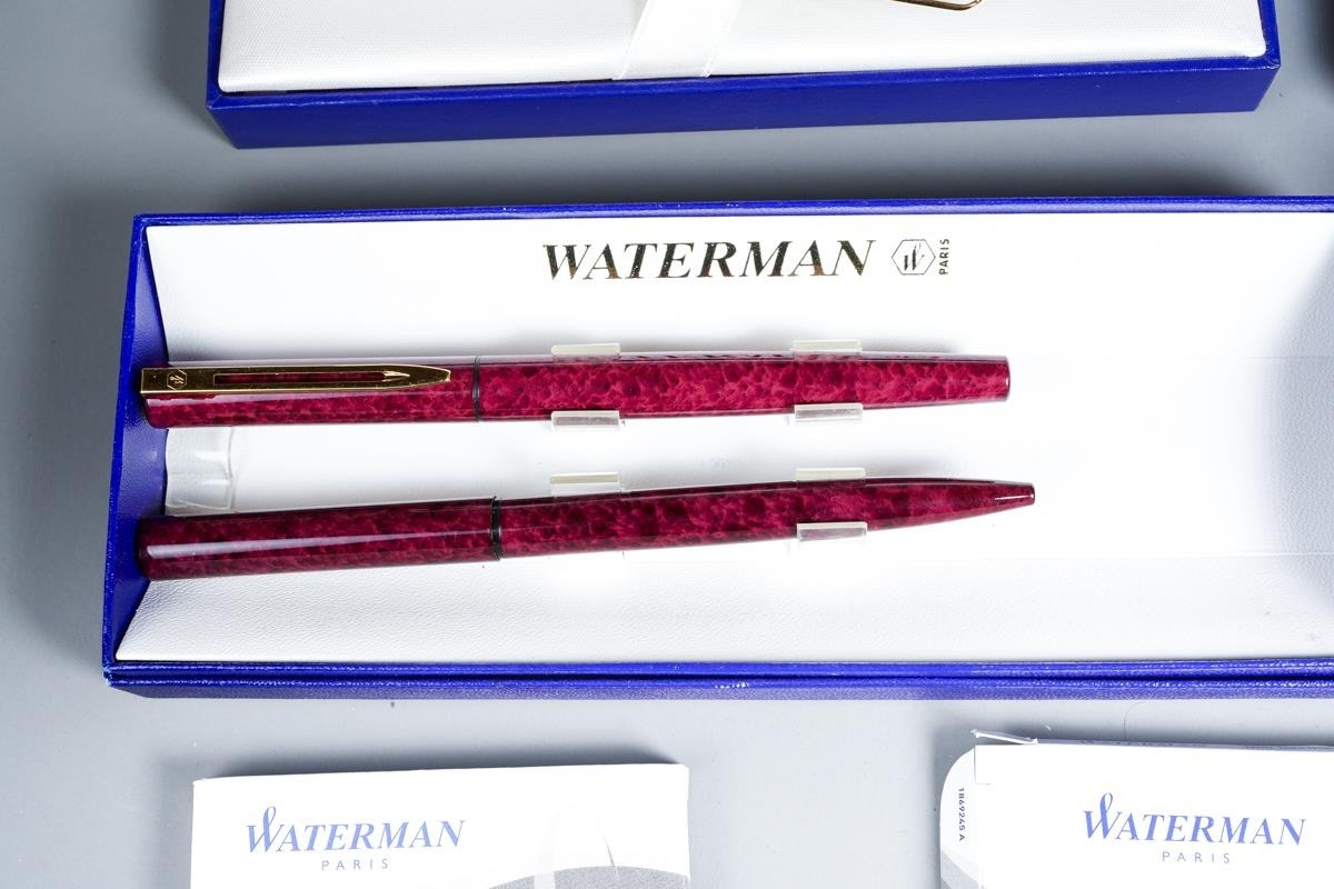 Three cased Waterman duo sets comprising blue mottled and gilt fountain pen and ballpoint, gilt nib stamped; a red mottled fountain pen and ballpoint pen and a steel and gilt set, the fountain pen with 18K stamped nib and various boxed Waterman cartridges [1]