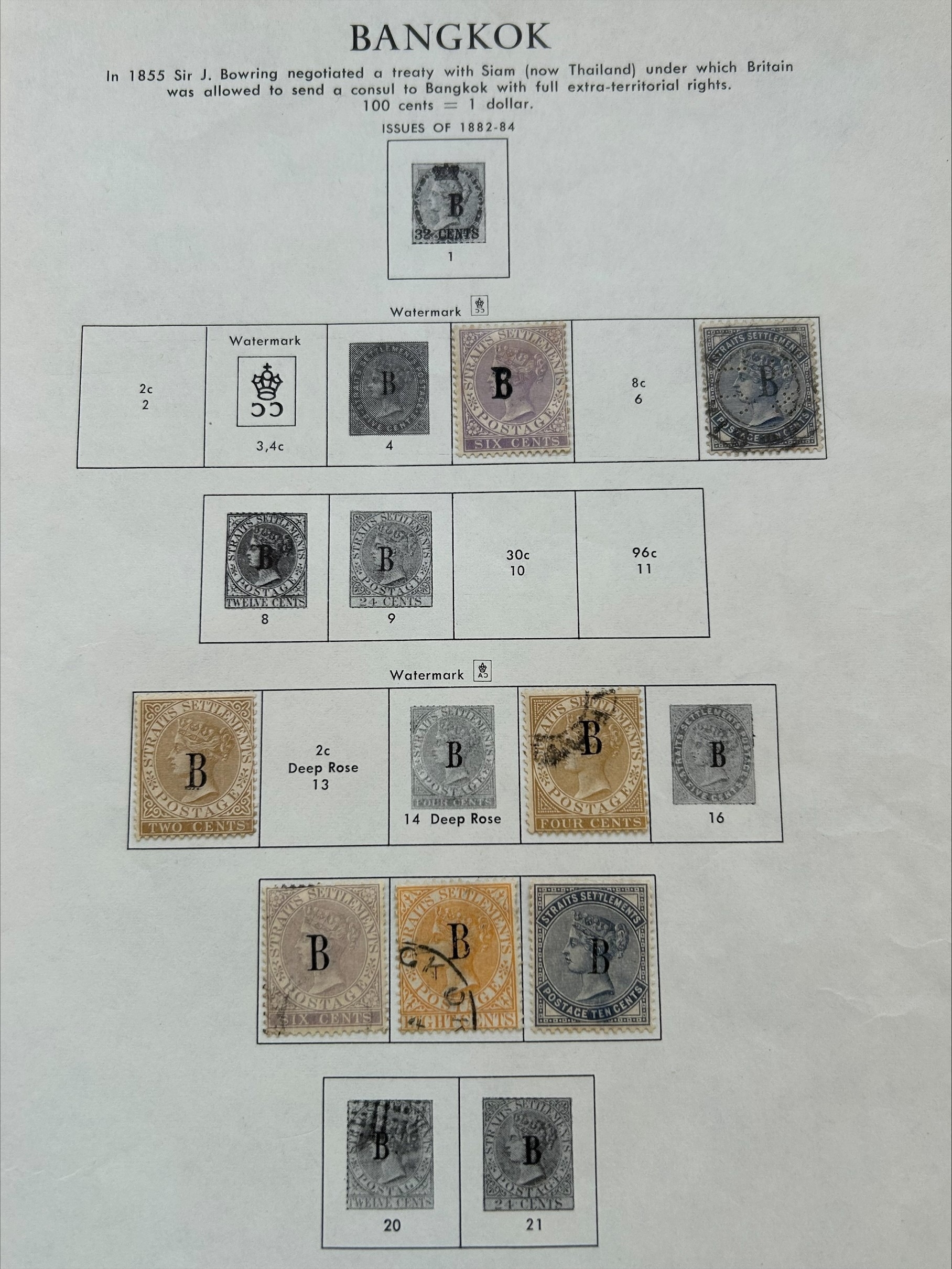 British POs in Siam 1882-5 CC 6c mint (doubtful) 10c perfin, CA 2c, brown M, 4c brown U, 6c U, 8c U & 10c M. STC £1550 enchanting SG 4