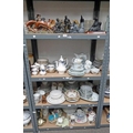 SELECTION OF VARIOUS ITEMS INCLUDING DECORATIVE FIGURES, DINNERWARE, COMMEMORATIVE WARE AND OTHERS OVER FOUR SHELVES