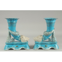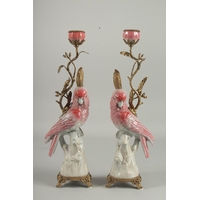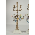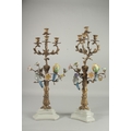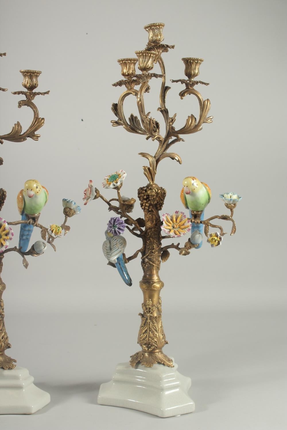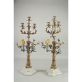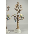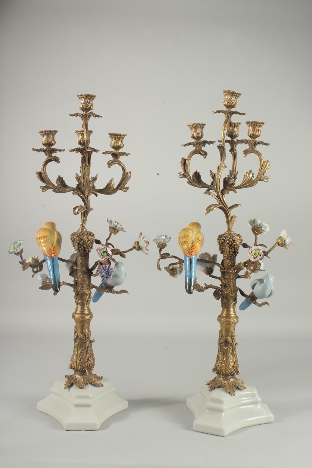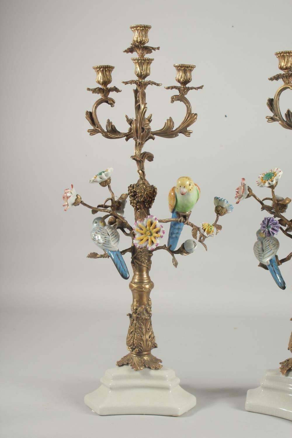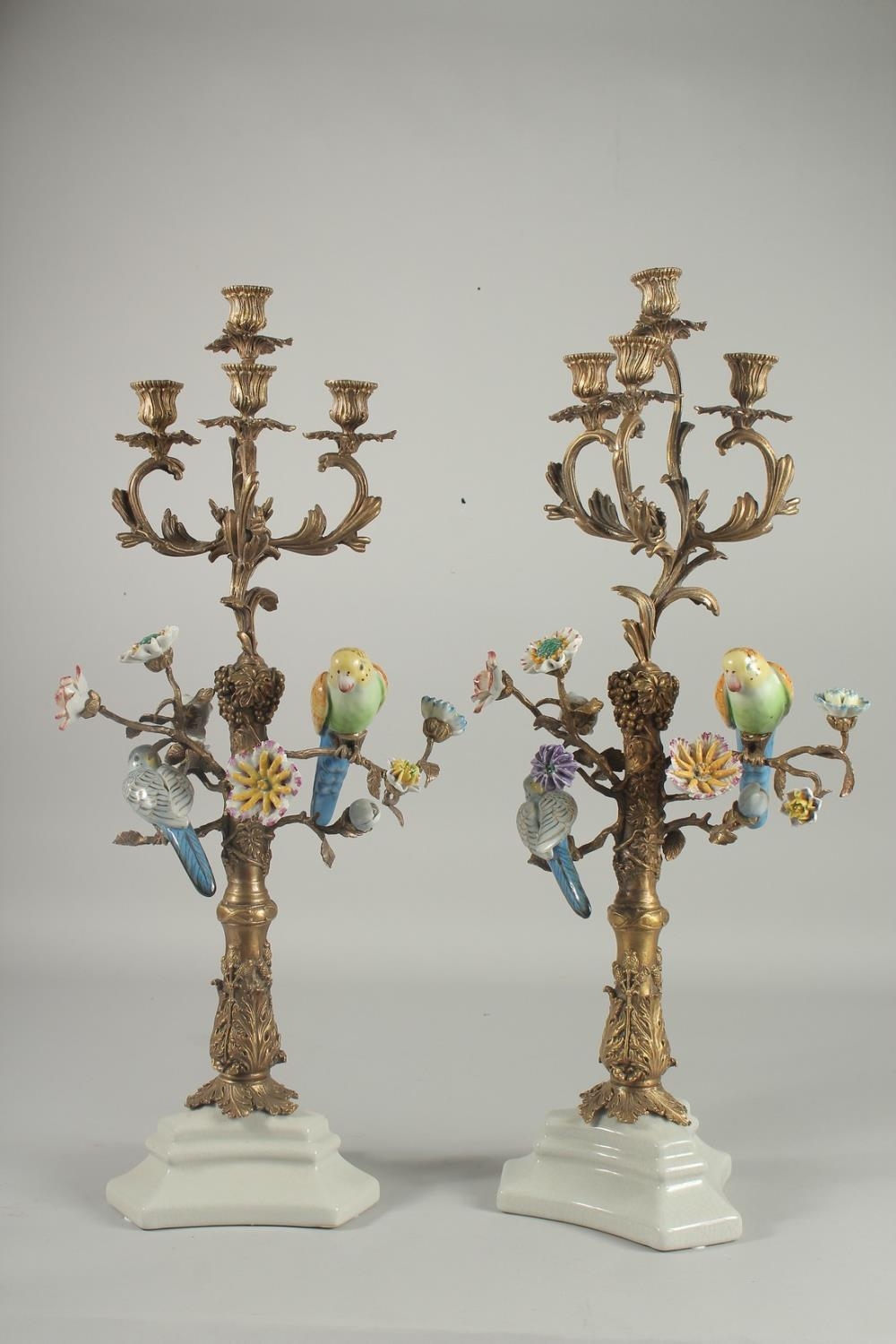 A VERY GOOD PAIR OF SEVRES DESIGN GILT CANDLESTICKS with porcelain birds and flowers on white bases.
