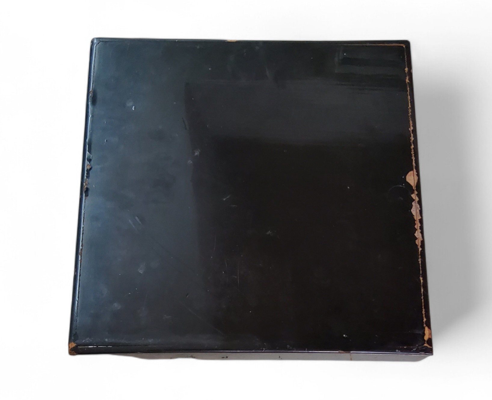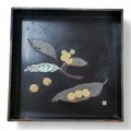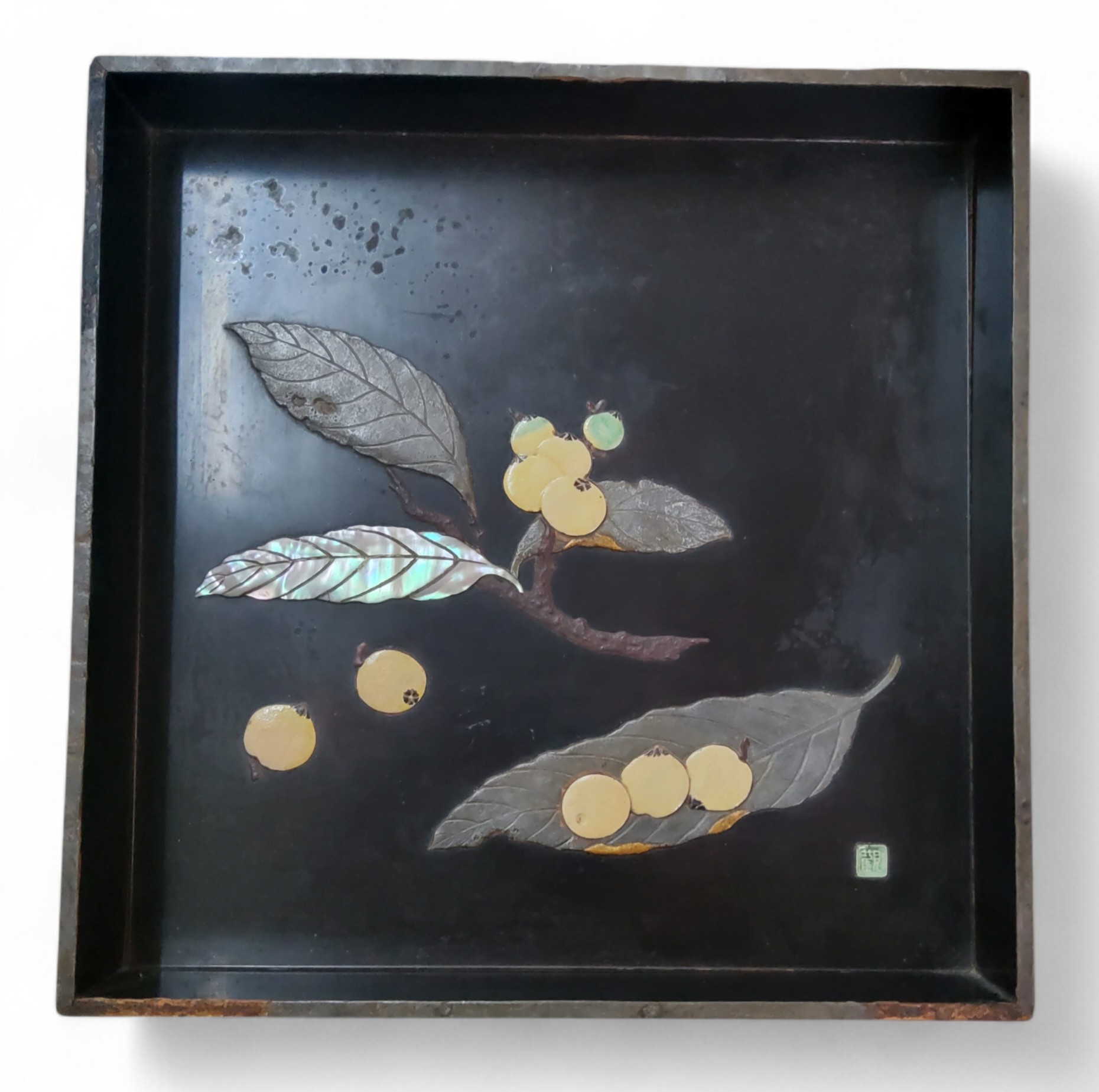 A Japanese inlaid lacquered square tray, Edo period, 18th/19th century, in the manner of Ogawa Haritsu, Ritsuo, 1663 - 1747, decorated with berries, mother-of-pearl and pewter leaves, 28cm square, seal mark