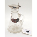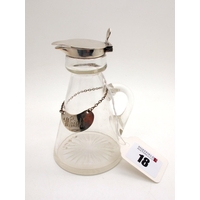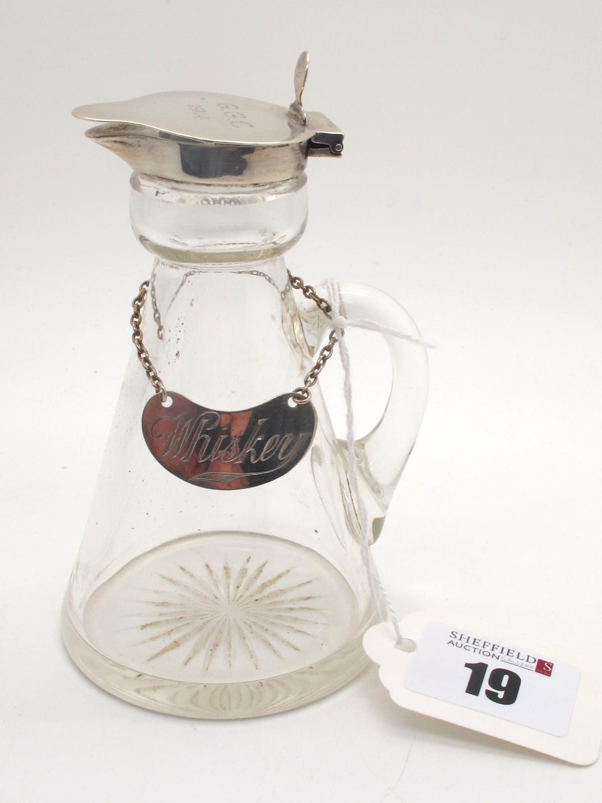 A Hallmarked Silver Mounted Glass Whiskey Noggin, Hukin & Heath, Birmingham 1913, the hinged lid engraved "G.G.C. 1914", complete with hallmarked silver "Whiskey" label, Hukin & Heath, Birmingham 1927.