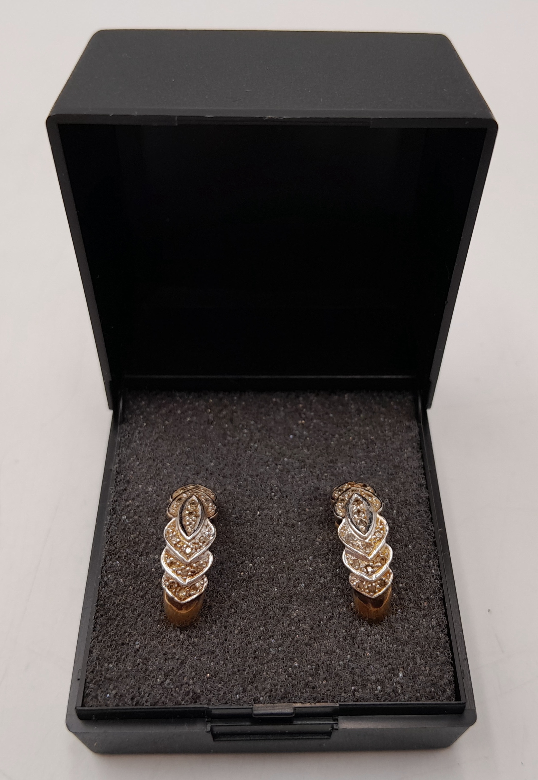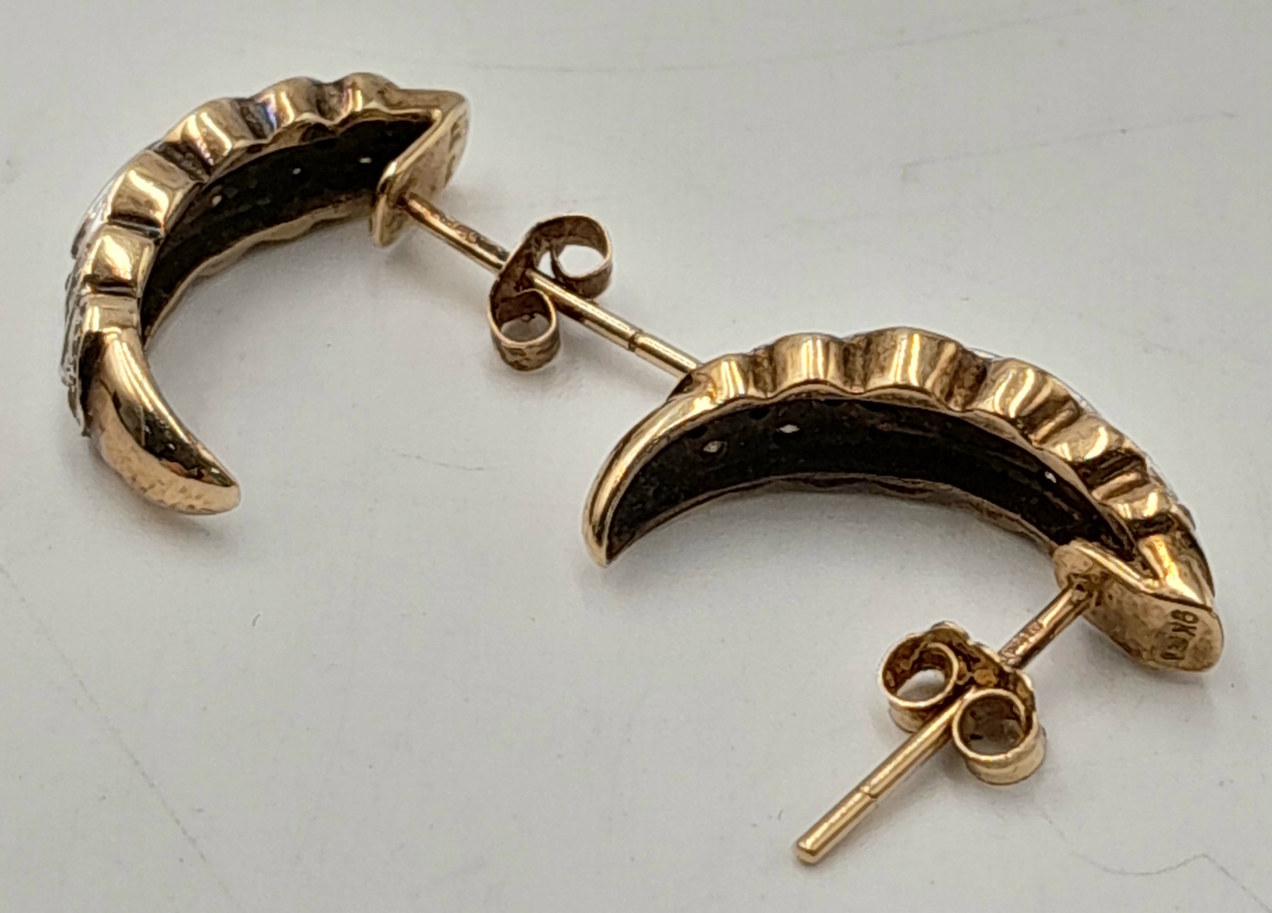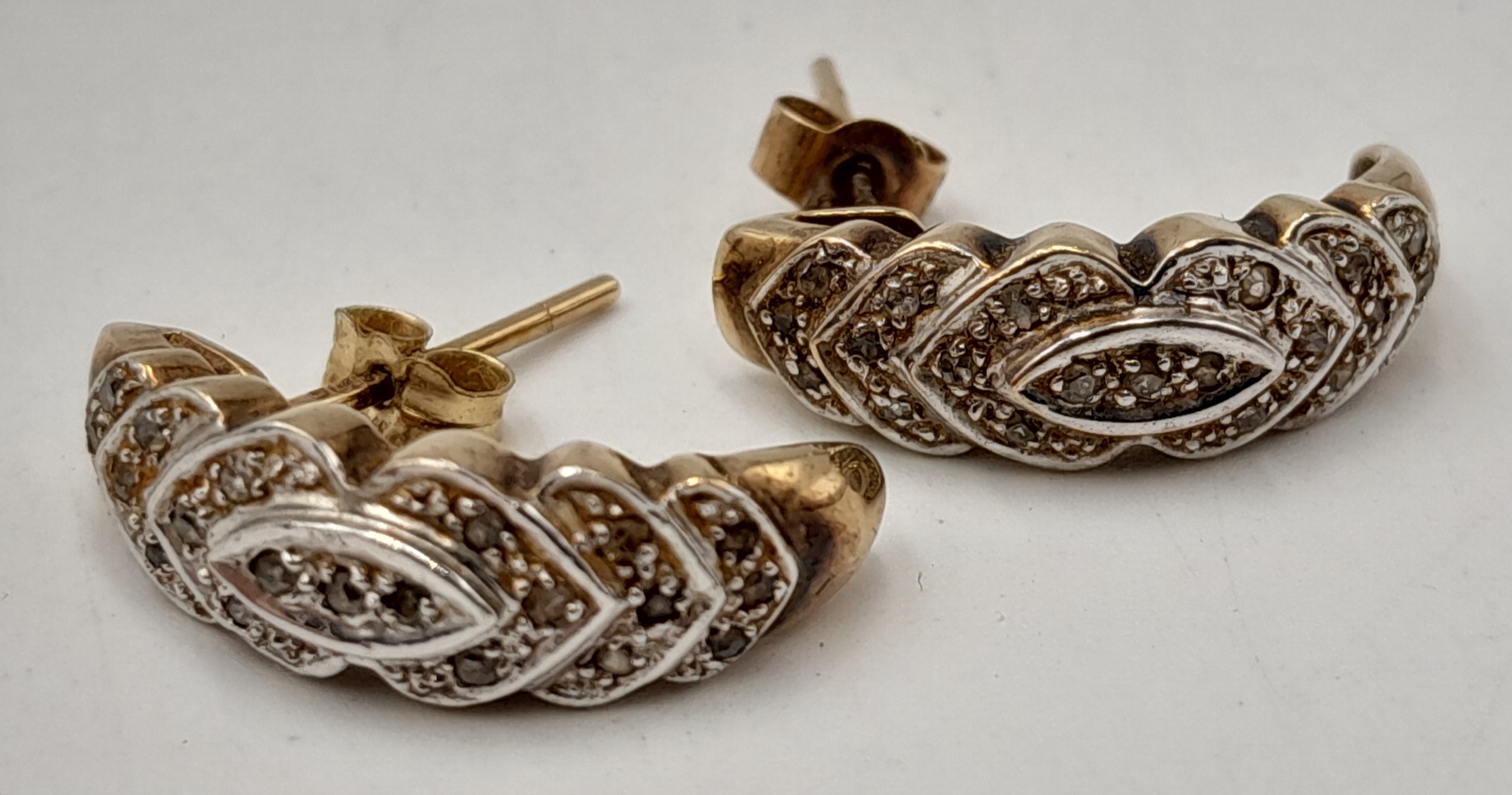 Fully hallmarked 9 CARAT GOLD DIAMOND CLUSTER EARRINGS. Complete with Gold Backs. Suitable for Pierced Ears. 3.0 Grams. Elegant Half Moon Style. Please see pictures.