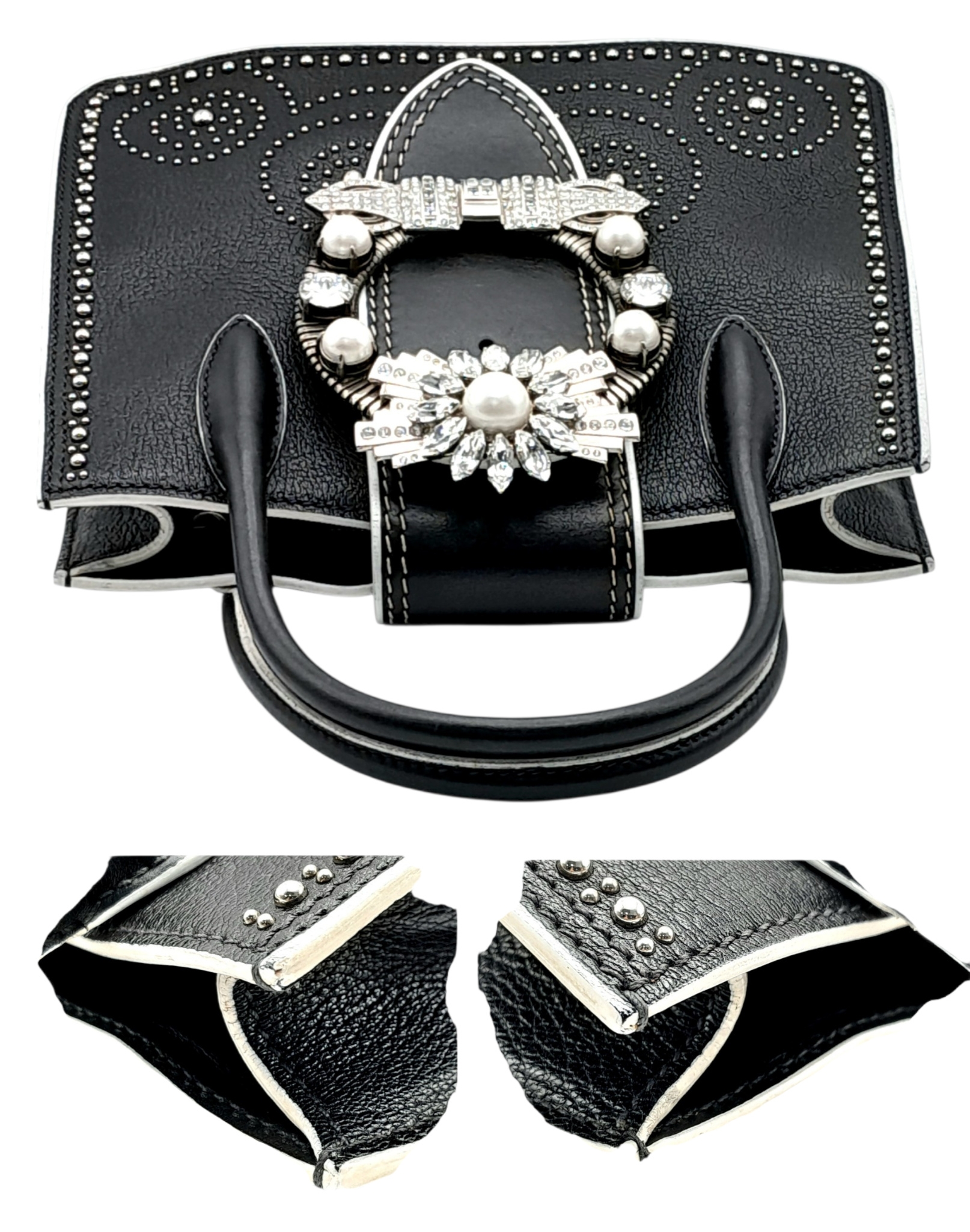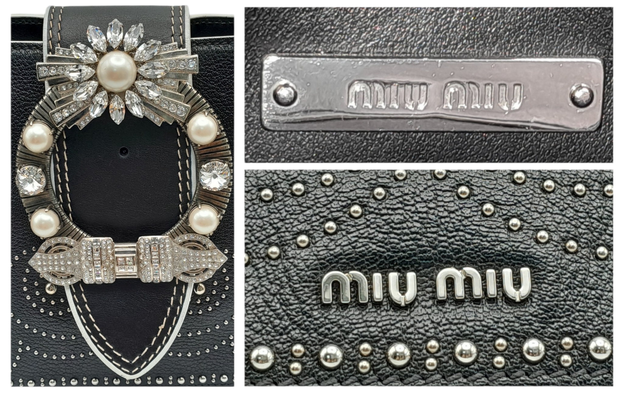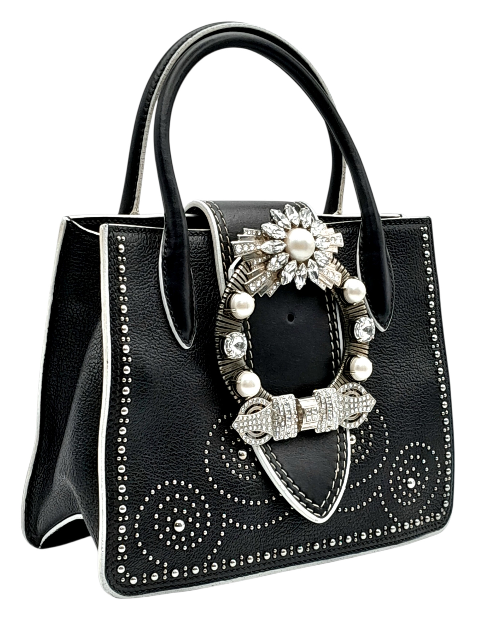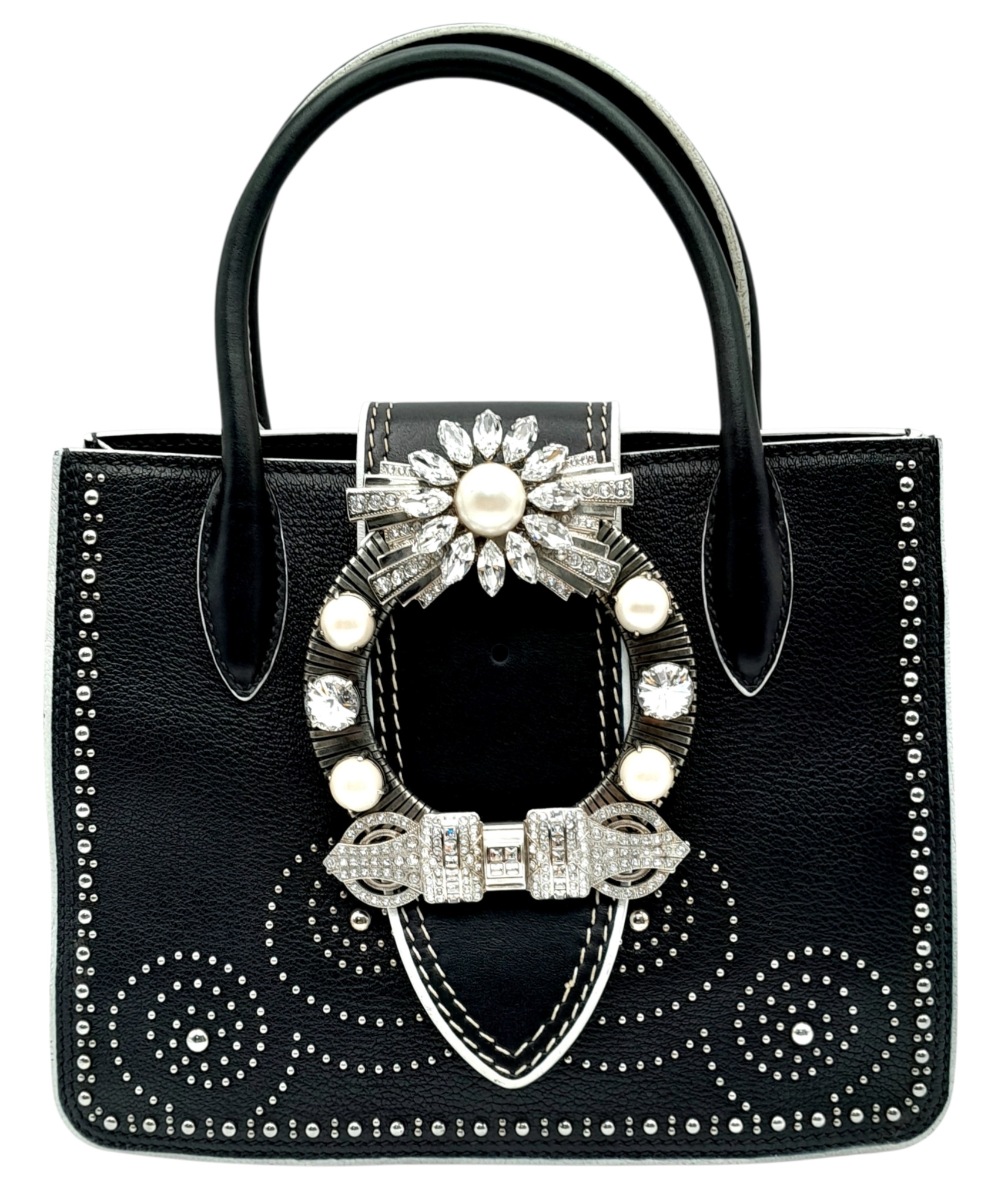 A Miu Miu Black Embellished Handbag. Leather exterior with white stone, faux pearl and stud embellishments, two rolled leather handles and magnetic closure. Black textile interior with a zipped side pocket and an open pocket. Comes with dust cover and detachable chain strap. Approximately 25cm length x 19cm height. Some light wear to the corners, otherwise in good condition overall. Please see photos for conditions or request a condition report. Ref: 13326