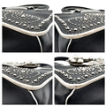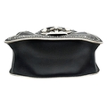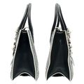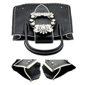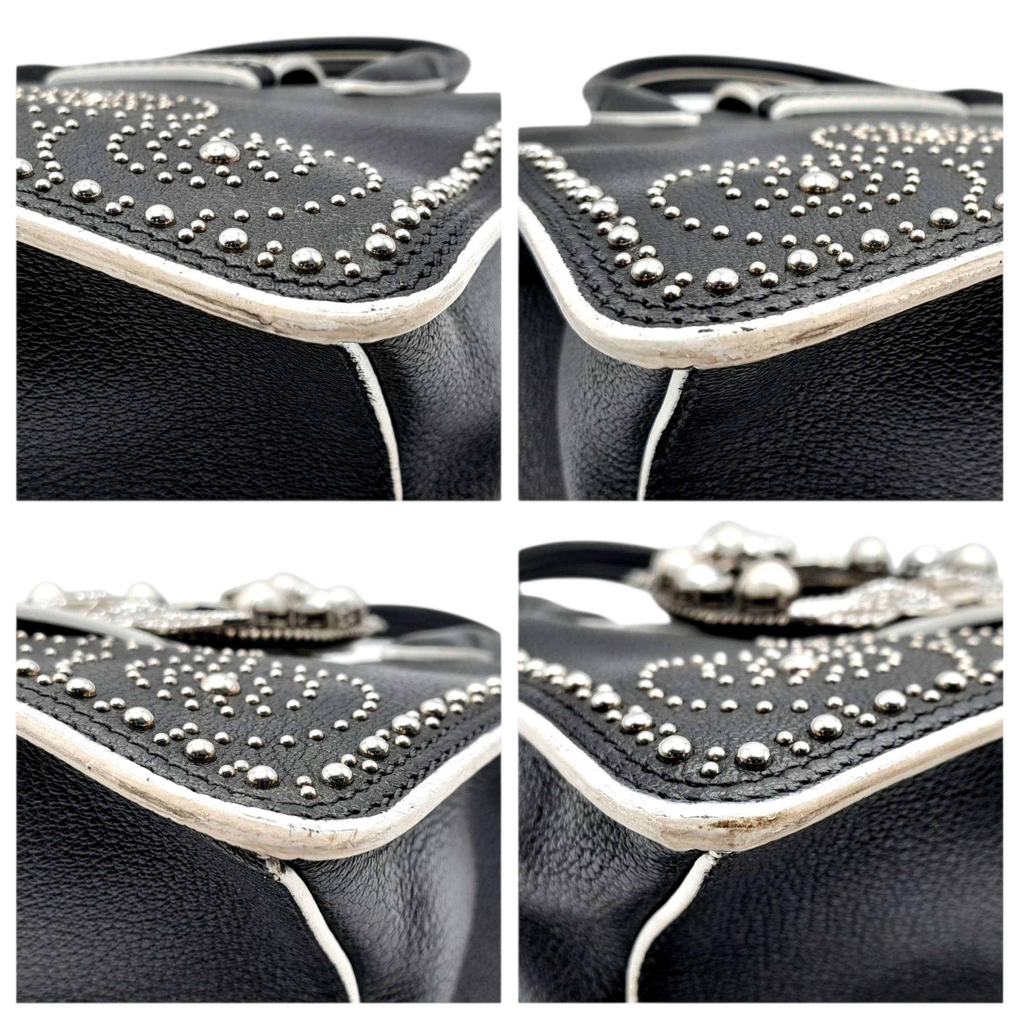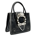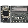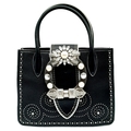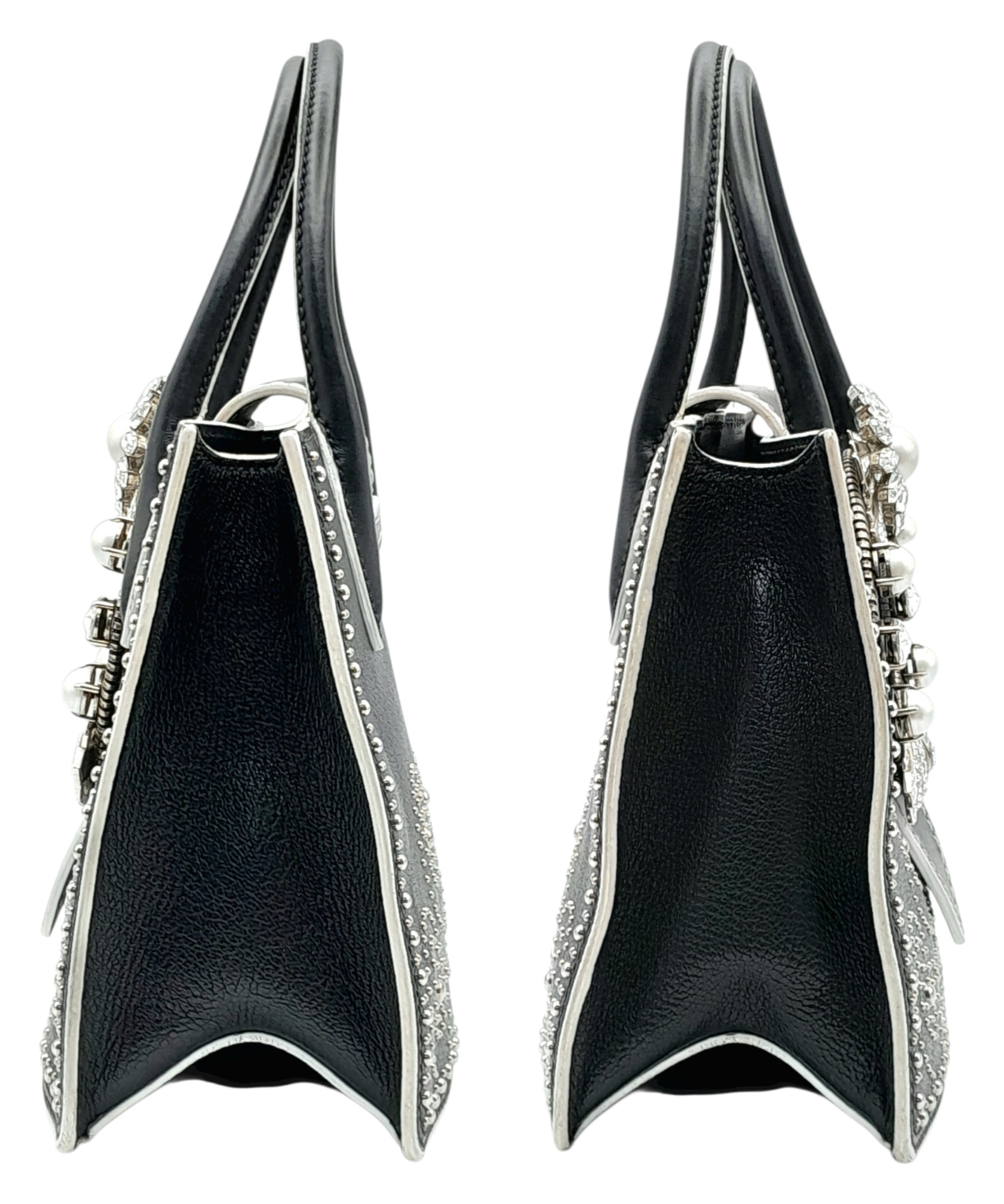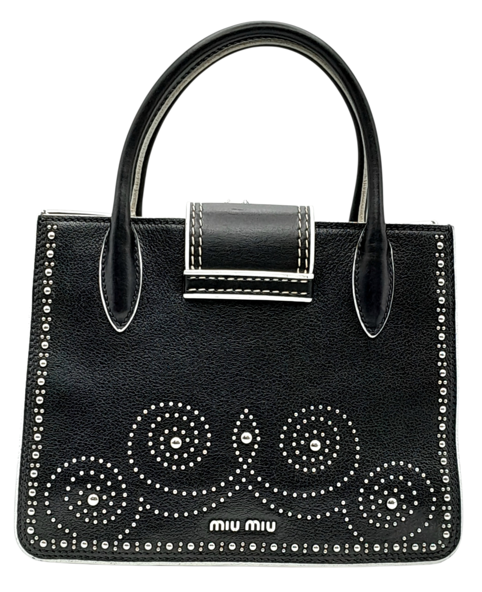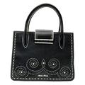 A Miu Miu Black Embellished Handbag. Leather exterior with white stone, faux pearl and stud embellishments, two rolled leather handles and magnetic closure. Black textile interior with a zipped side pocket and an open pocket. Comes with dust cover and detachable chain strap. Approximately 25cm length x 19cm height. Some light wear to the corners, otherwise in good condition overall. Please see photos for conditions or request a condition report. Ref: 13326