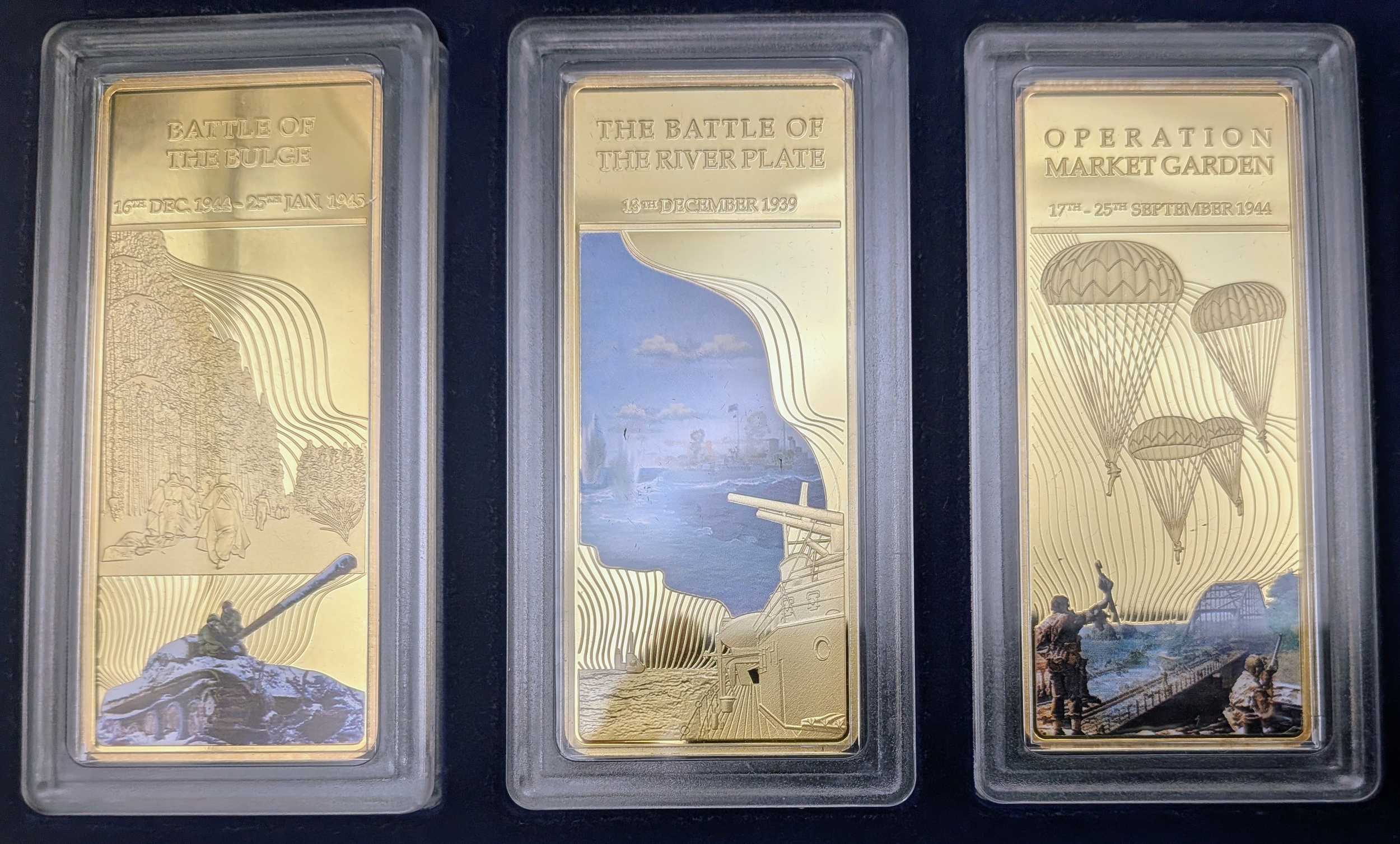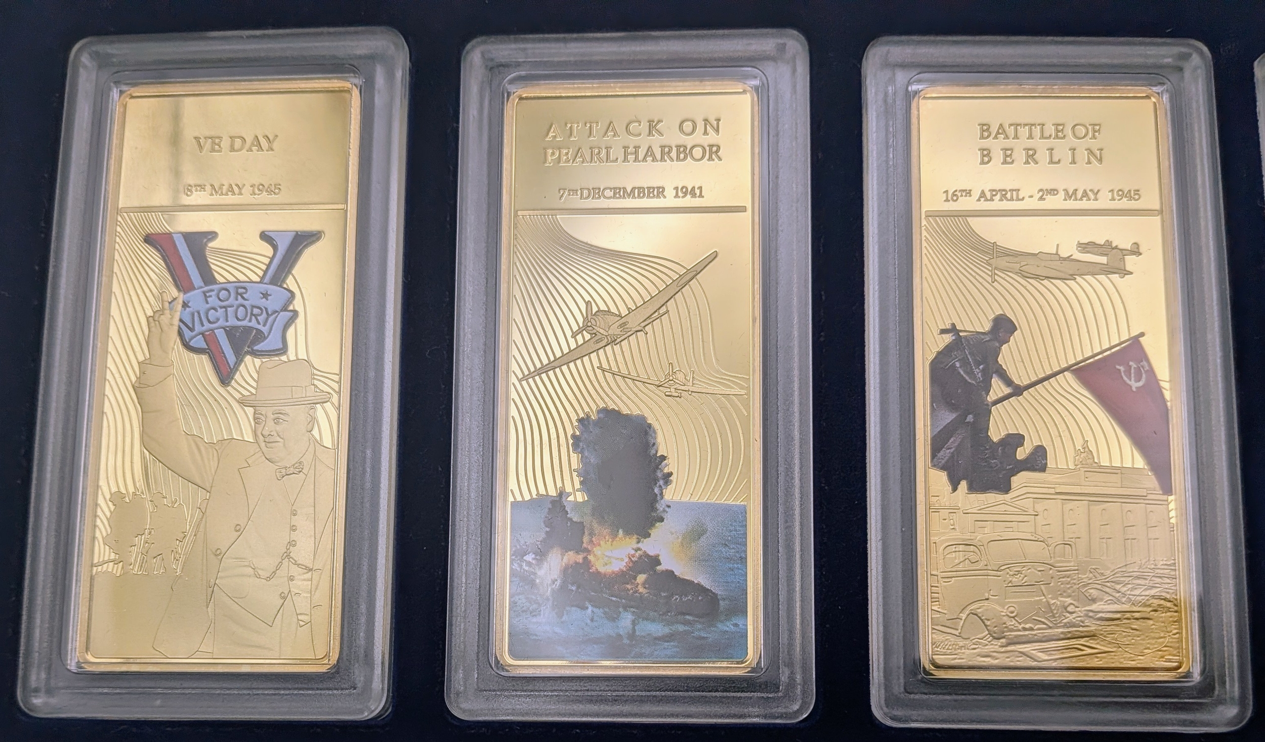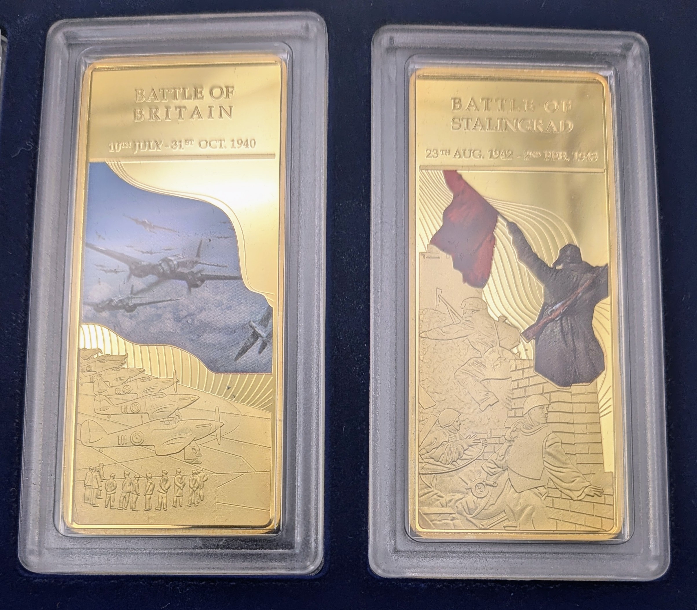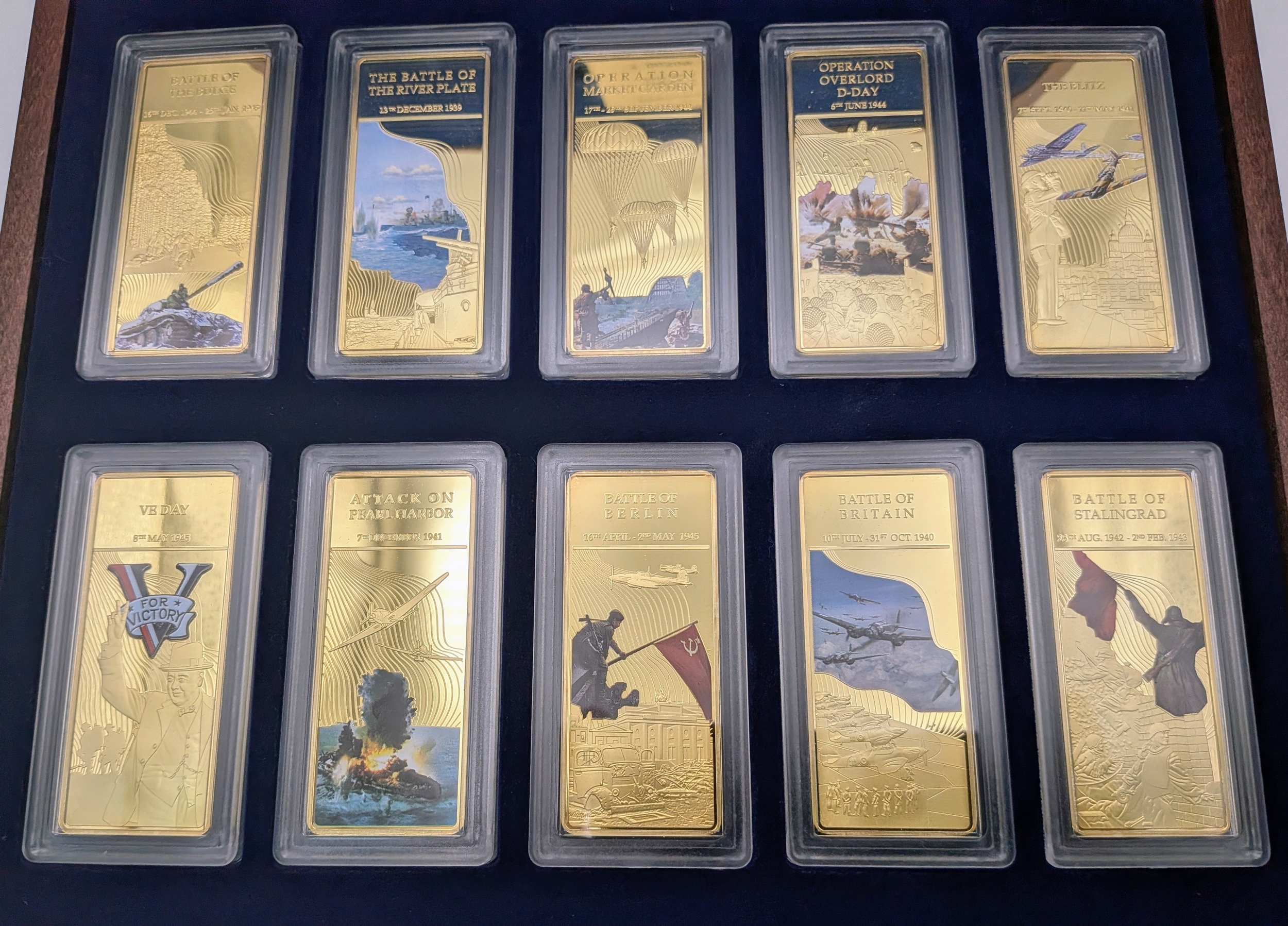 A Collection of Ten Gold Plated Ingots - Commemorative WW2 Battles. Comes with COA and case.