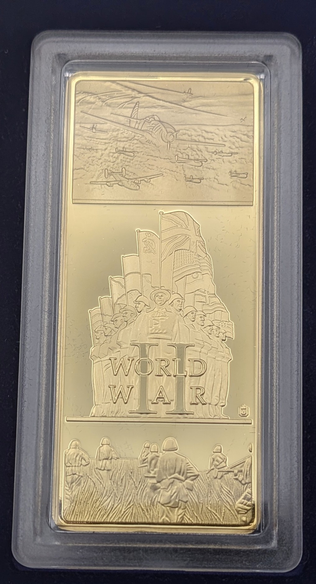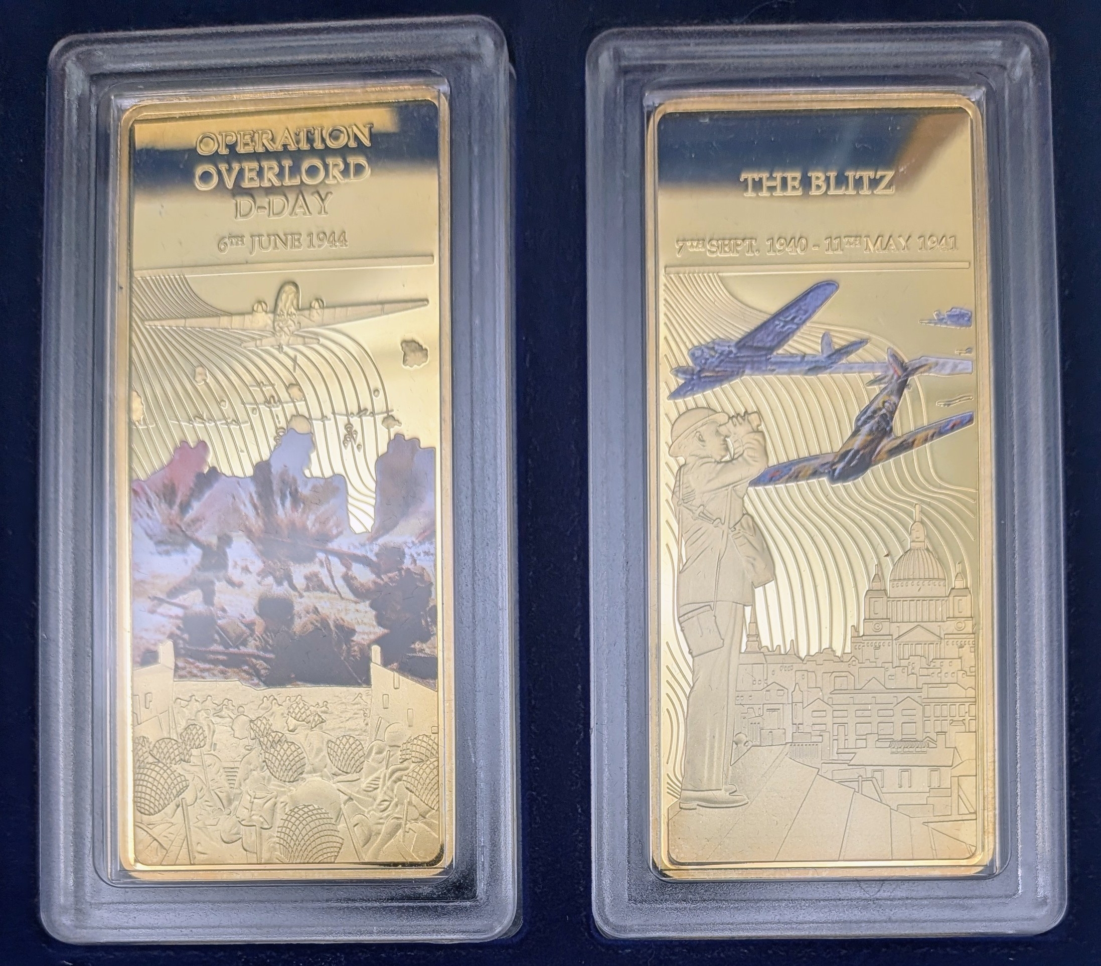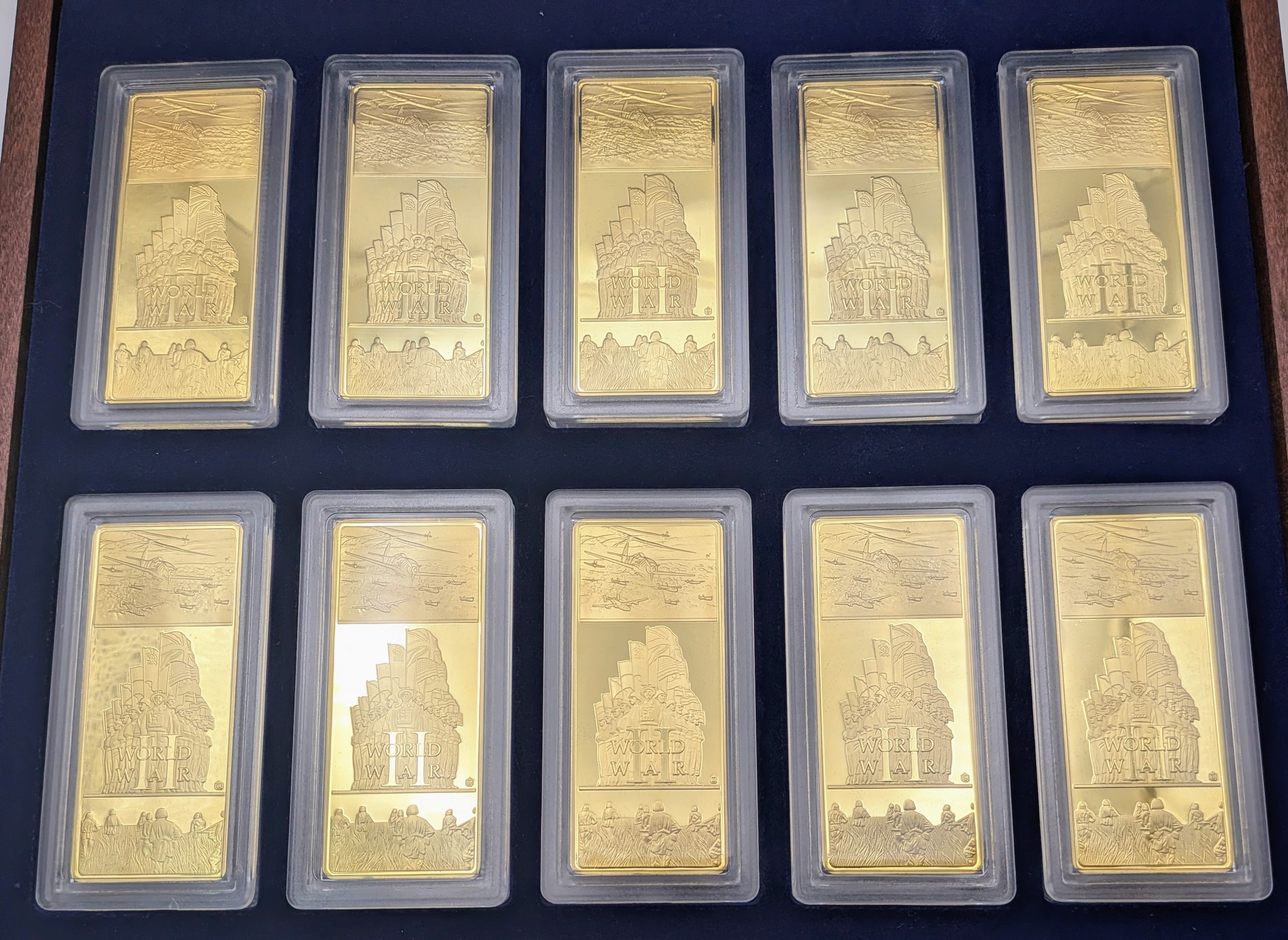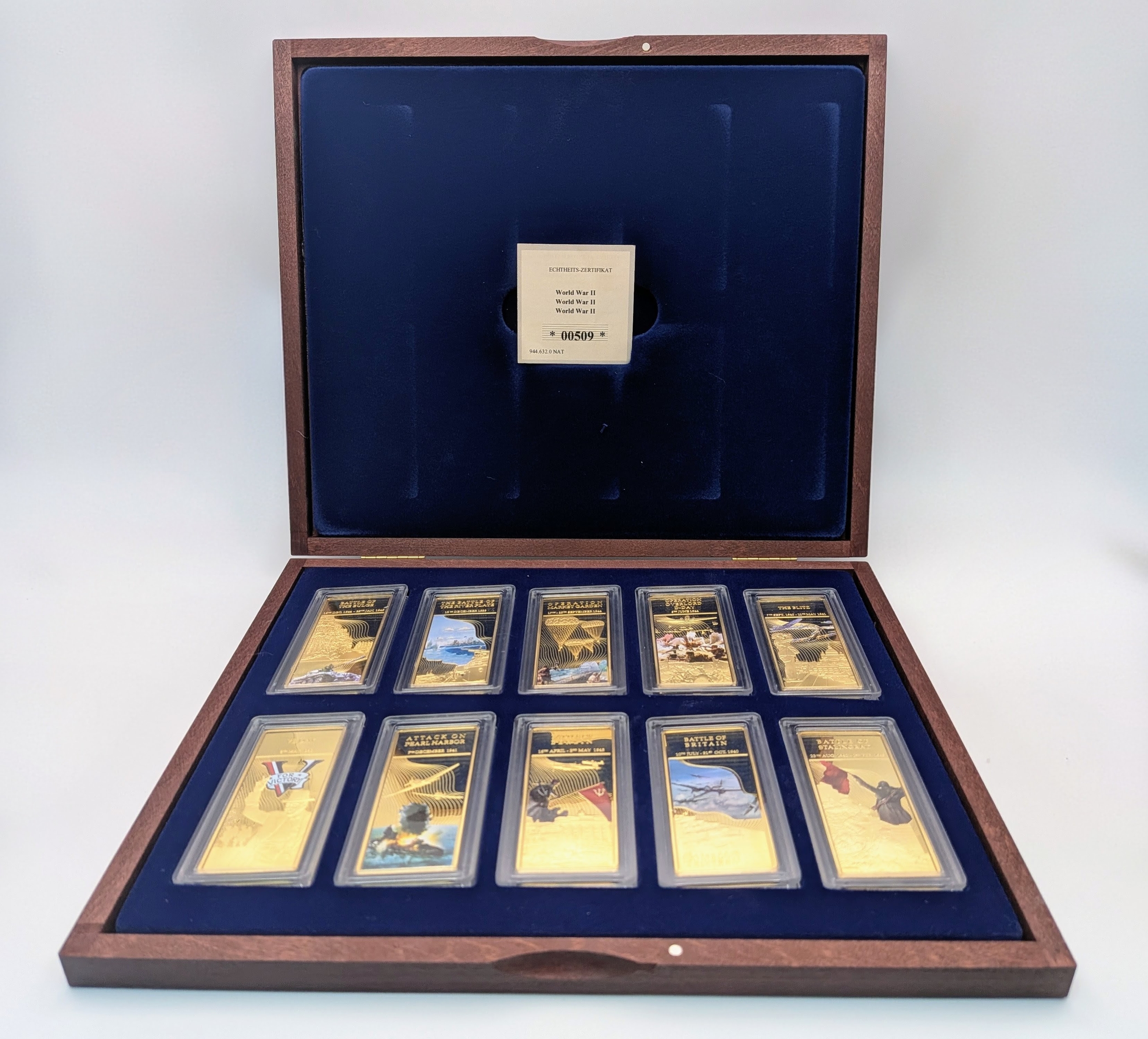 A Collection of Ten Gold Plated Ingots - Commemorative WW2 Battles. Comes with COA and case.