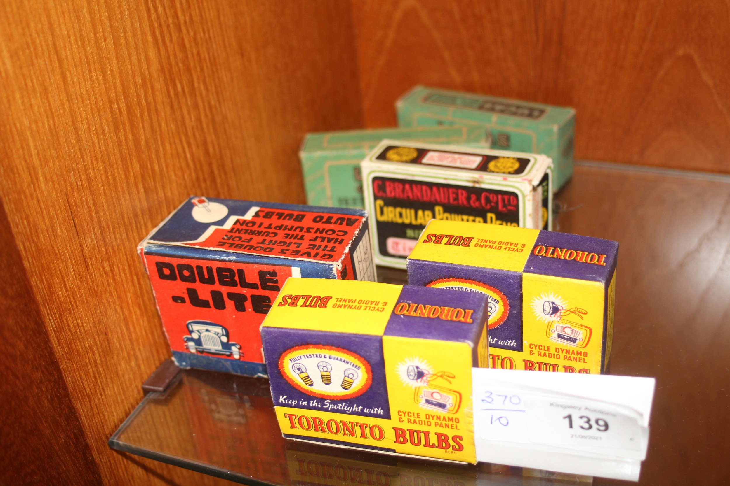 Six Advertising Cardboard Boxes: Double Lite Auto Bulbs (full), 2 x Toronto Bulbs (full), 2 x Lucas Spare Bulbs (full), Pen Nibs Box (no Nibs)