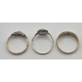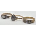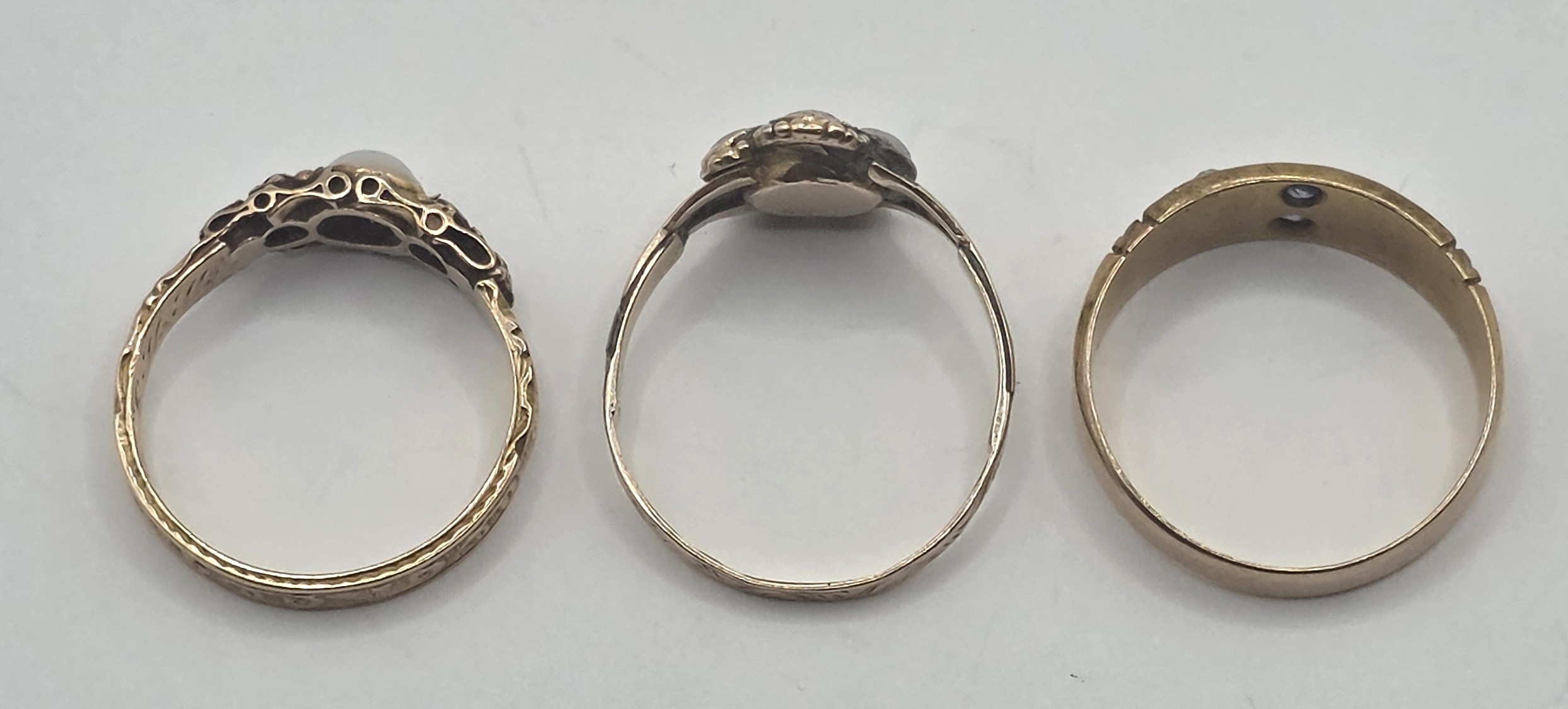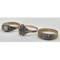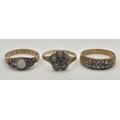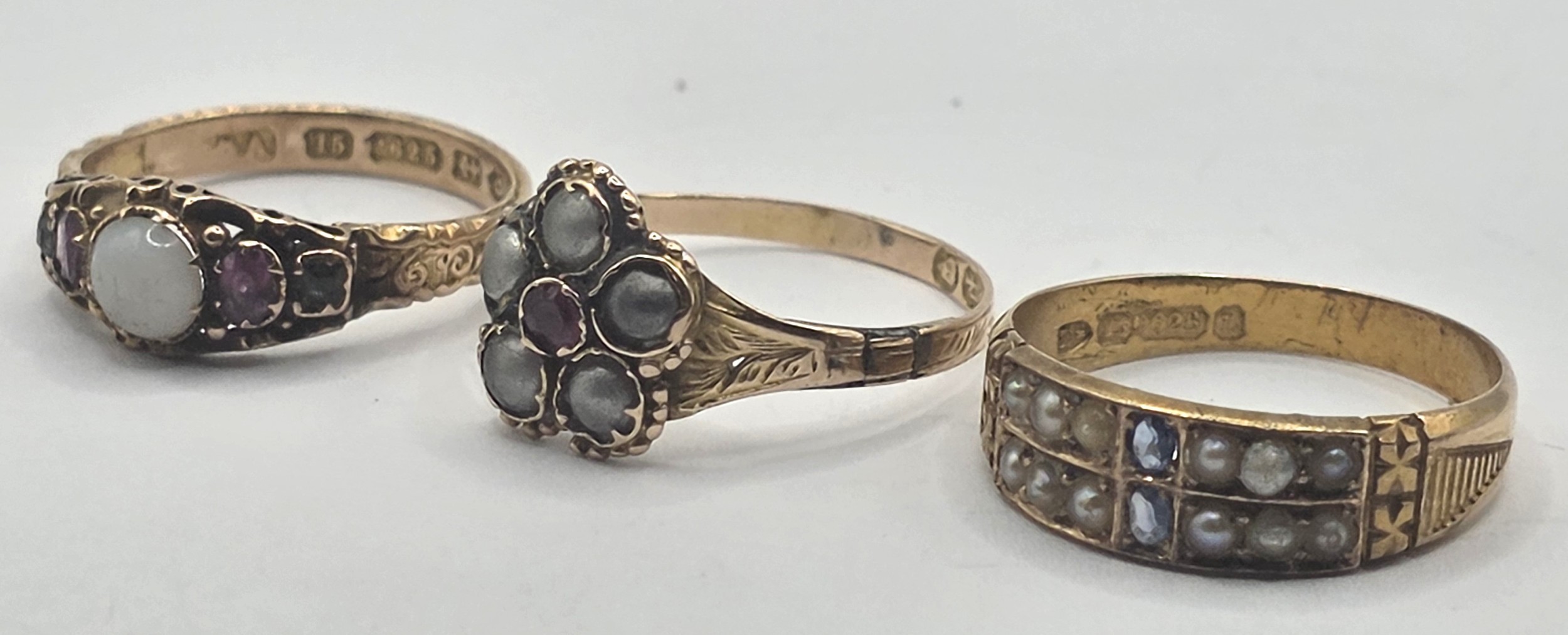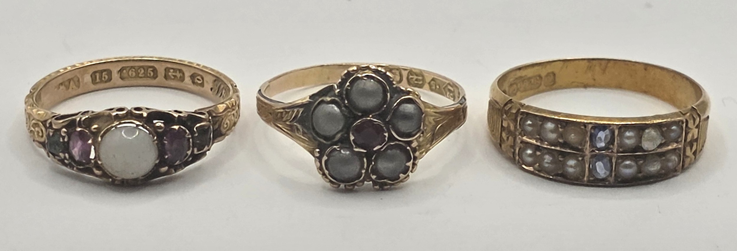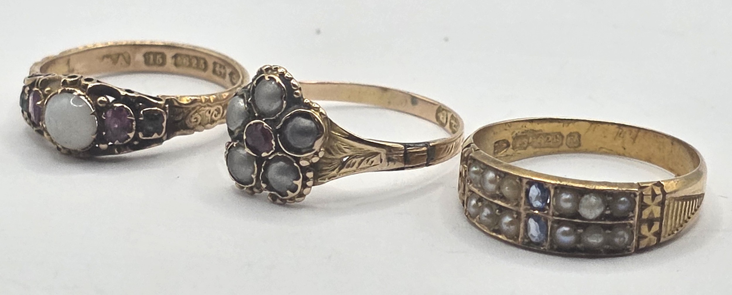 An early 20th century 15ct gold, ruby and opal ring, ring size L, an early 20th century seed pearl and sapphire ring, ring size N, and a Victorian 12ct gold, pearl and sapphire ring, ring size N