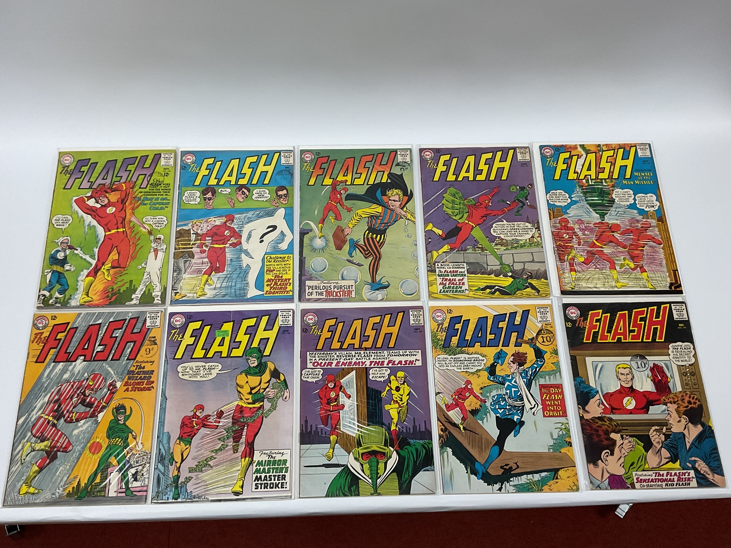 Ten Silver Age The Flash Comics by DC. Comprising of issues #140 Key Issue First appearance and origin of Heatwave, #141, #142, #143, #144, #145, #146, #147, #148, #149. Conditions vary. All with faults.