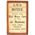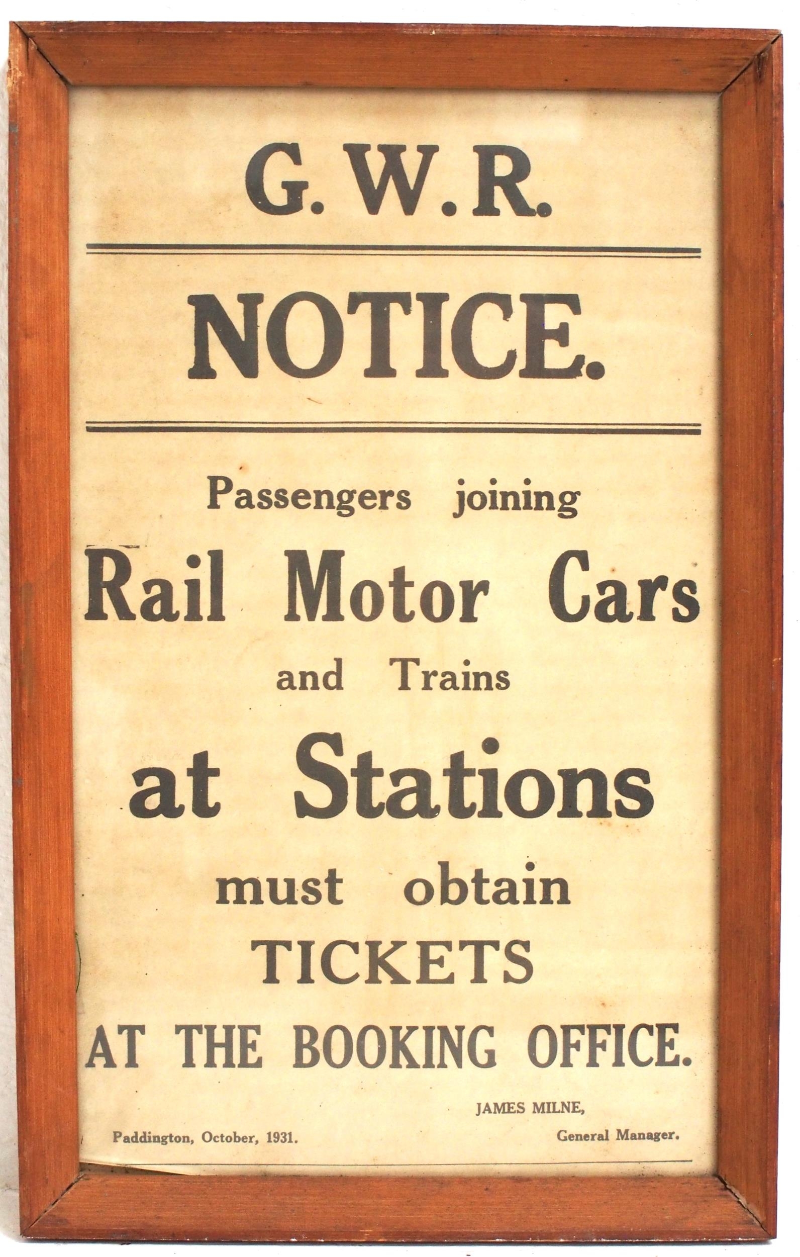 GWR paper notice (framed) "G.W.R. NOTICE PASSENGERS JOINING RAIL MOTOR CARS etc" 8½"x 13¾", dated 1931, good condition, these notices were exhibited at stations & in the carriage. (D1) (Dispatch by Mailboxes/Collect from Banbury Depot)