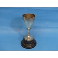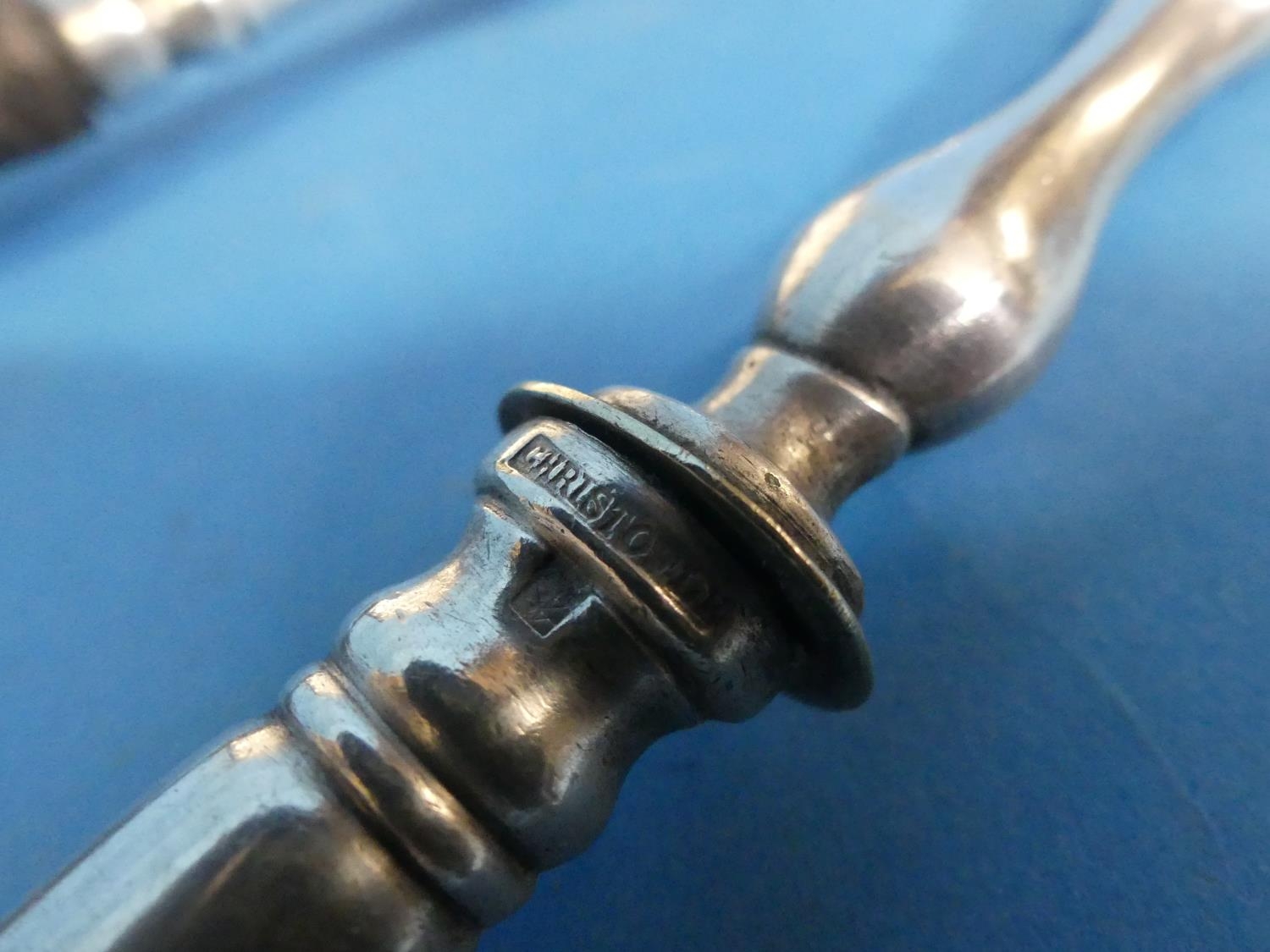 A pair of vintage French Christofle silver-handled Serving Spoons, with horn bowls,11½in (29cm) long, together with a continental gold-plated pocket watch, signed Victor Jeannot. Geneve, watch not working, and a cased set of sixteen silver medallions, Plata de Ley, Perfiles de Cantabra 1997 (a lot)