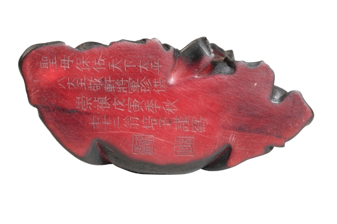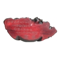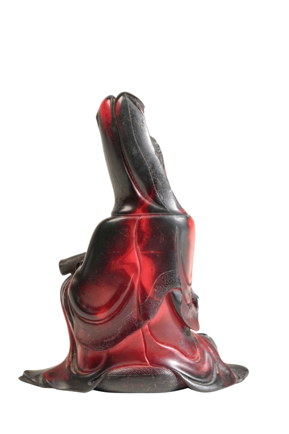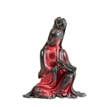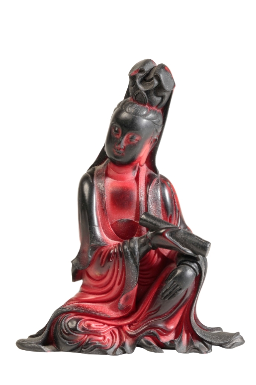 A CHINESE RED 'LACQUER' SEATED GUANYIN the underside with seal marks and inscription, 11cm high