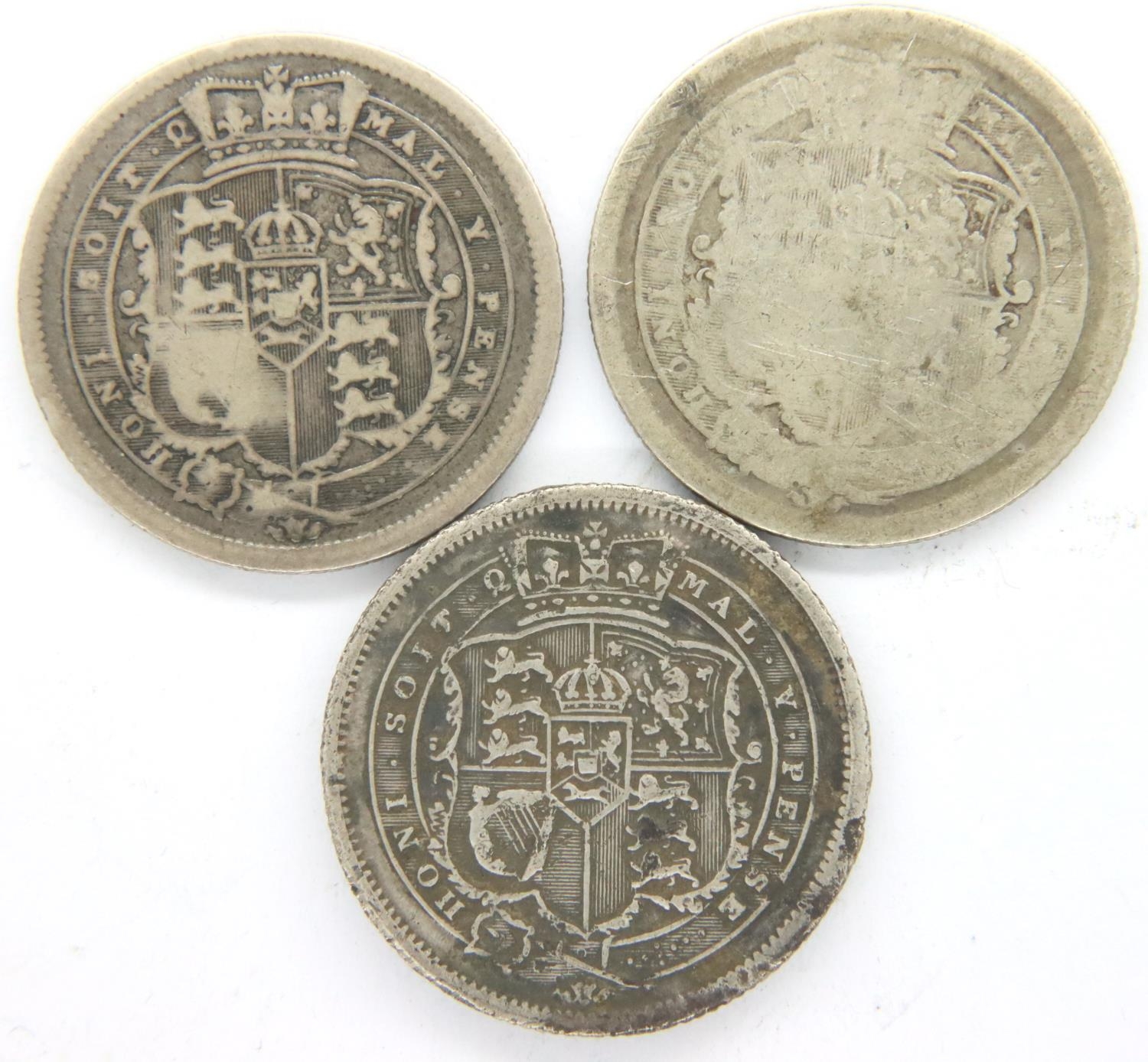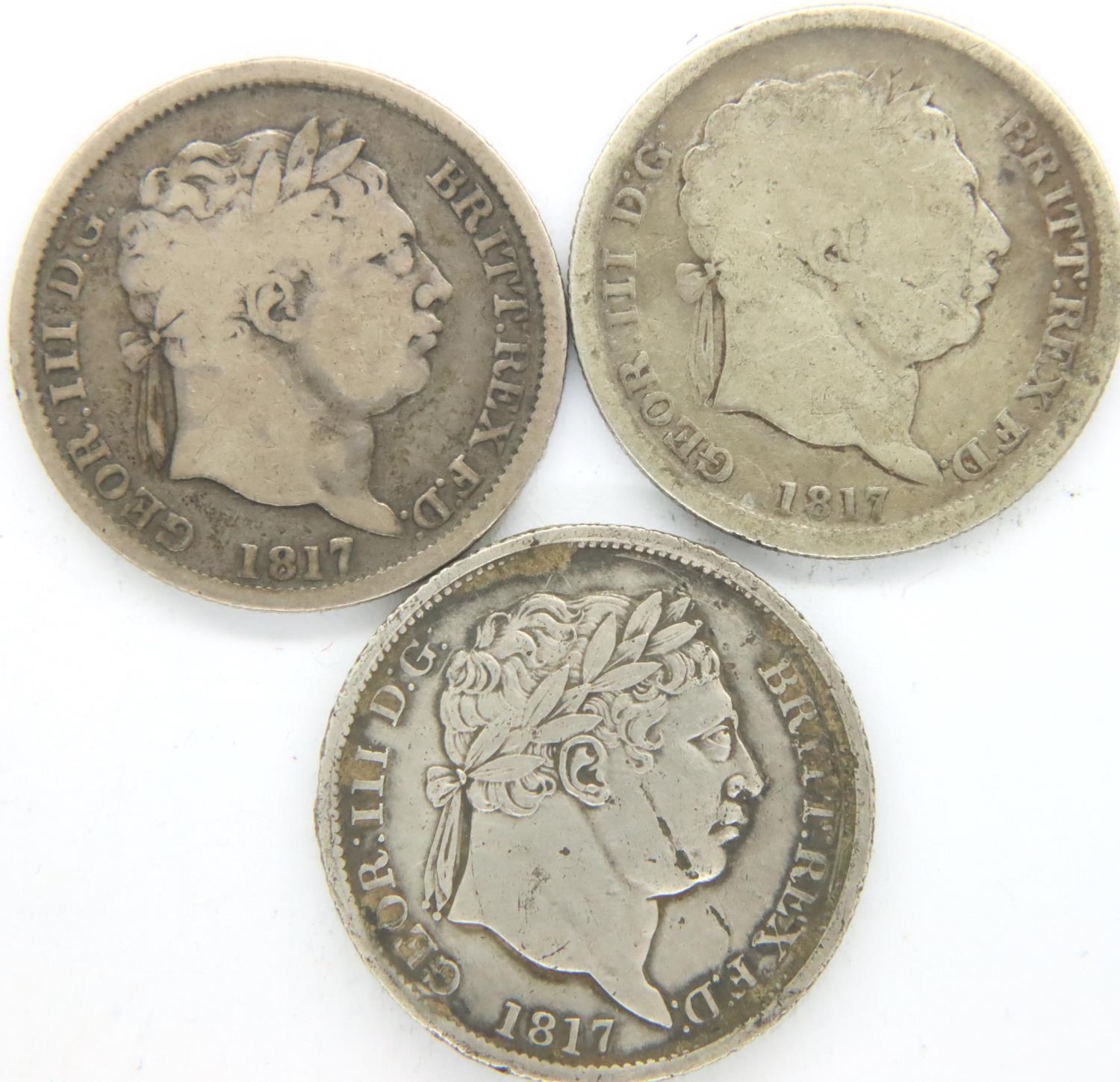 Three 1817 silver shillings of George III, mixed grades. P&P Group 1 (£14+VAT for the first lot and £1+VAT for subsequent lots)