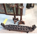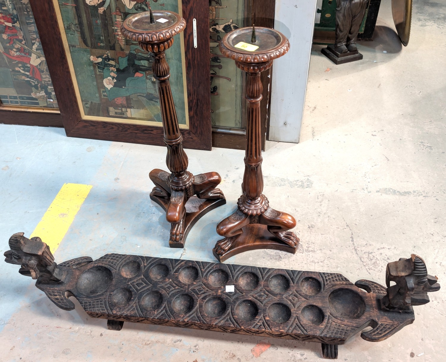 A pair of wooden floor-standing pricket candlesticks on reeded columns and triple feet, by Theodore Alexander, height 57cm; an ethnic carved boat.