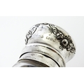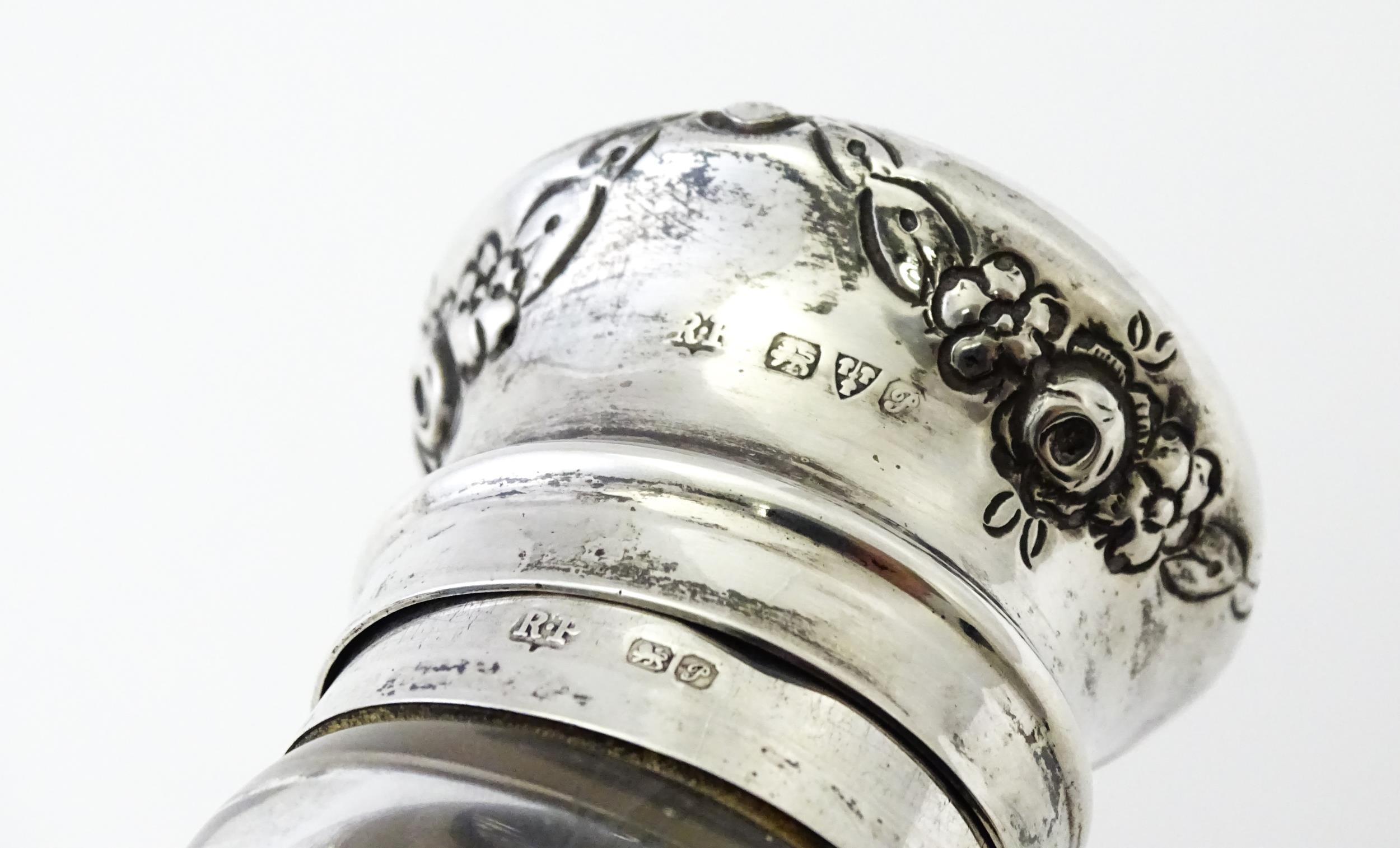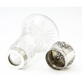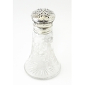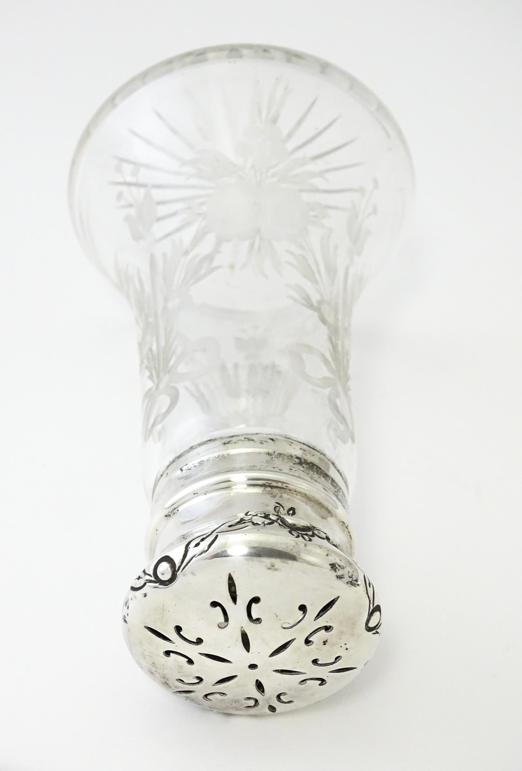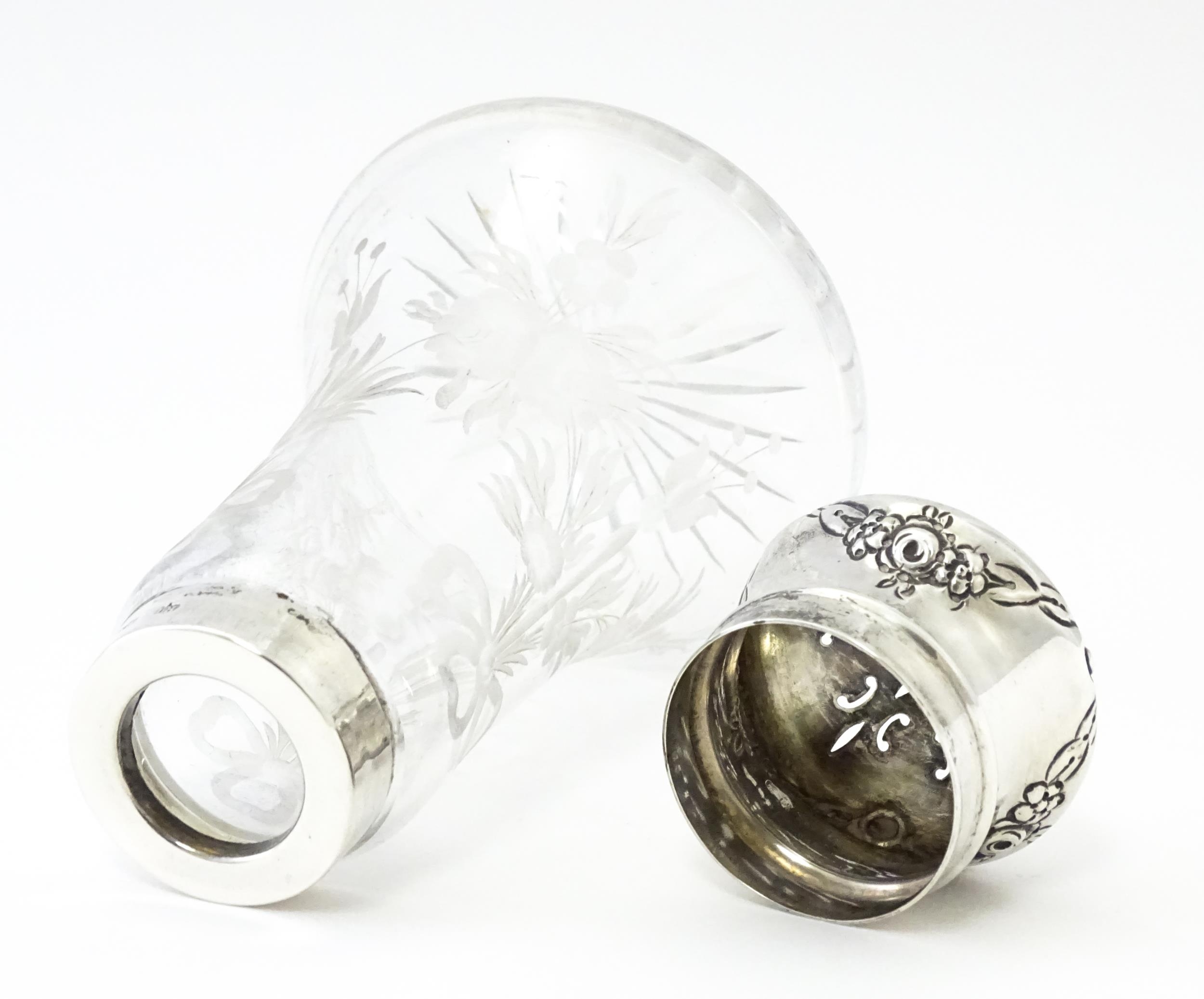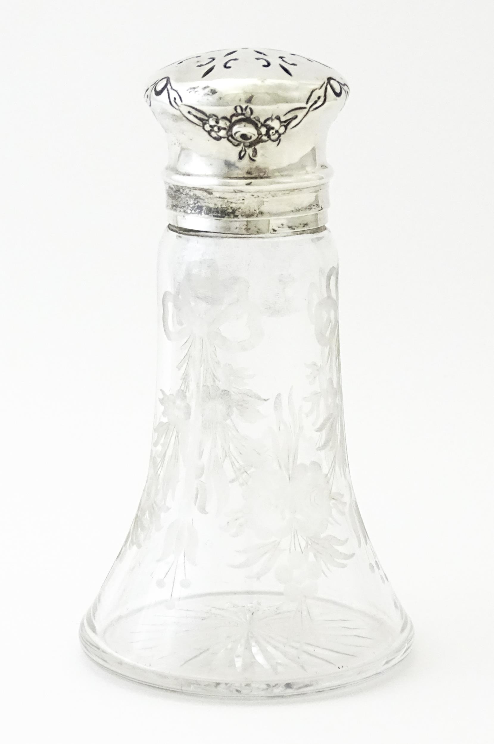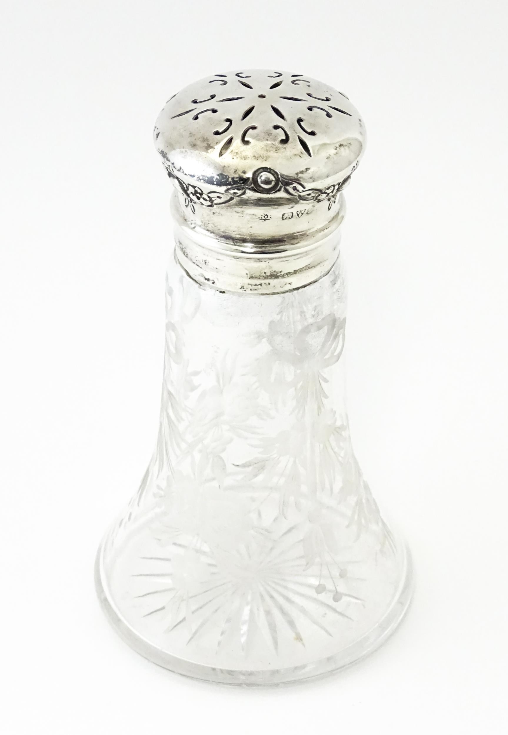 An etched glass sugar caster with silver top and mounts, hallmarked Chester 1915, maker Robert Pringle & Sons. Approx. 5 1/2" high