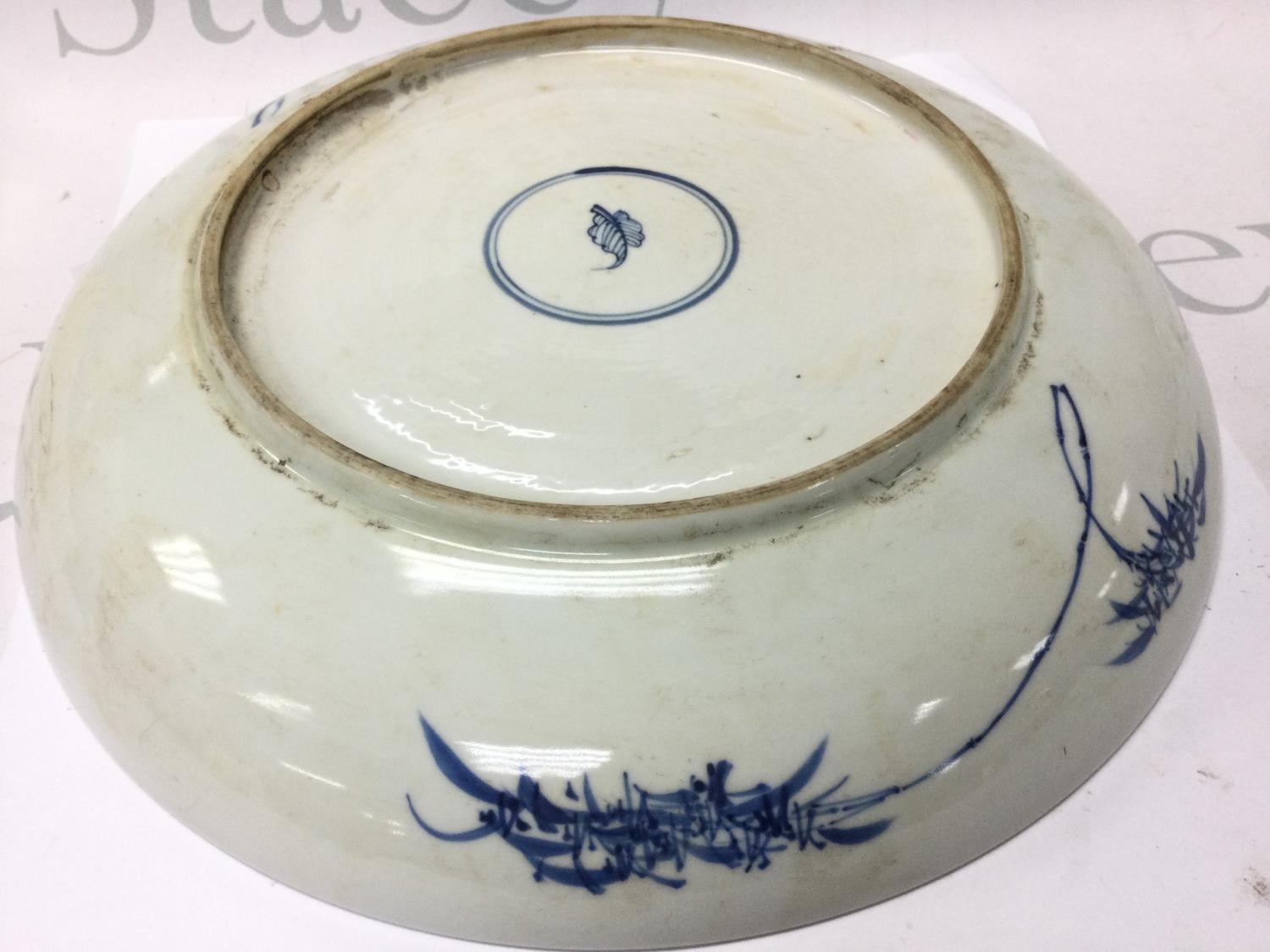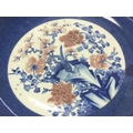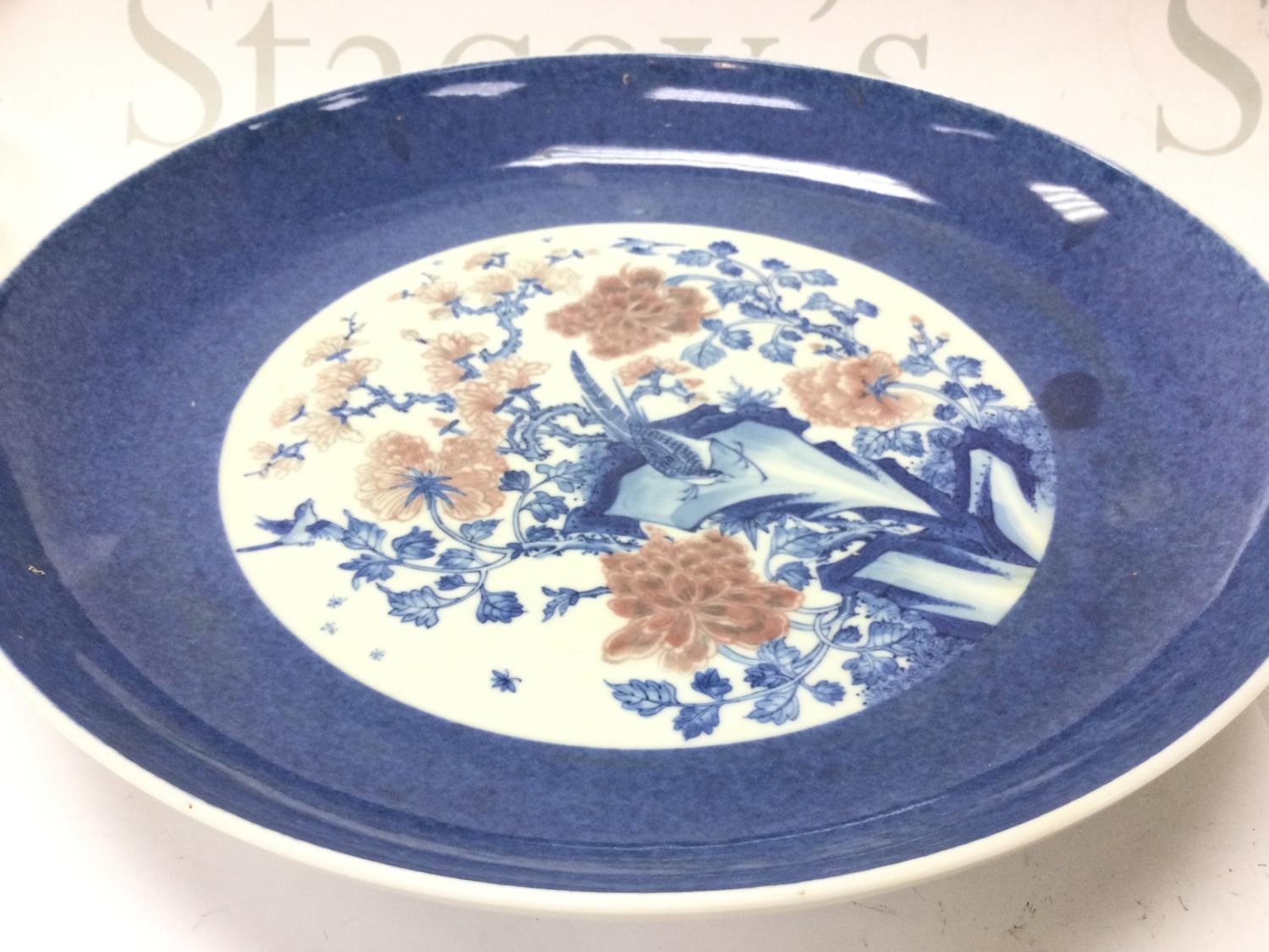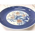 A Chinese blue and white and copper red floral porcelain charger, 30cm wide. This lot cannot be posted