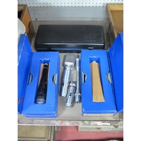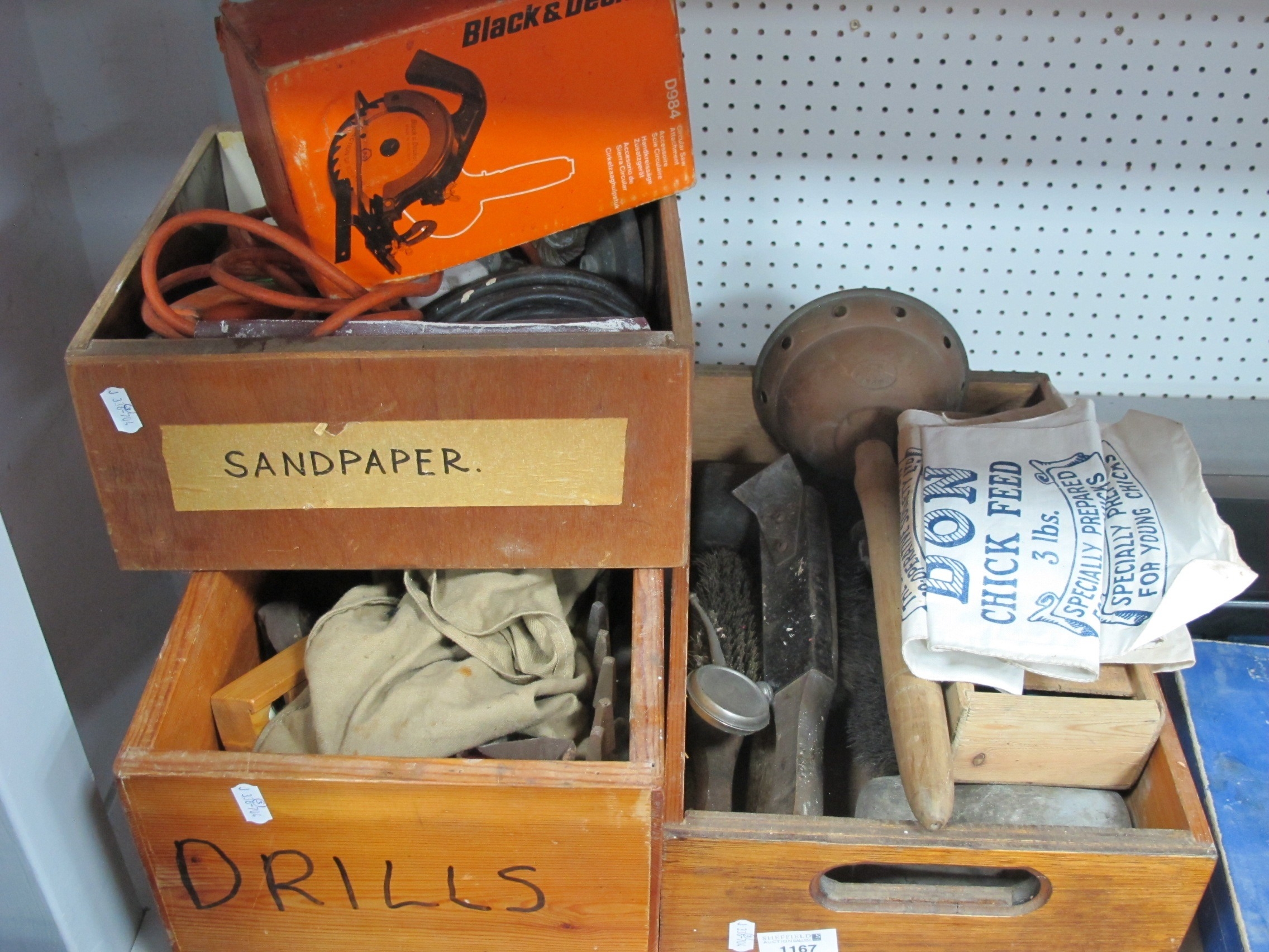 B&D Drill, saw attachment, drill bits, posser stick, Barnsley Co-Op chick feed bags, etc, in three wooden boxes.
