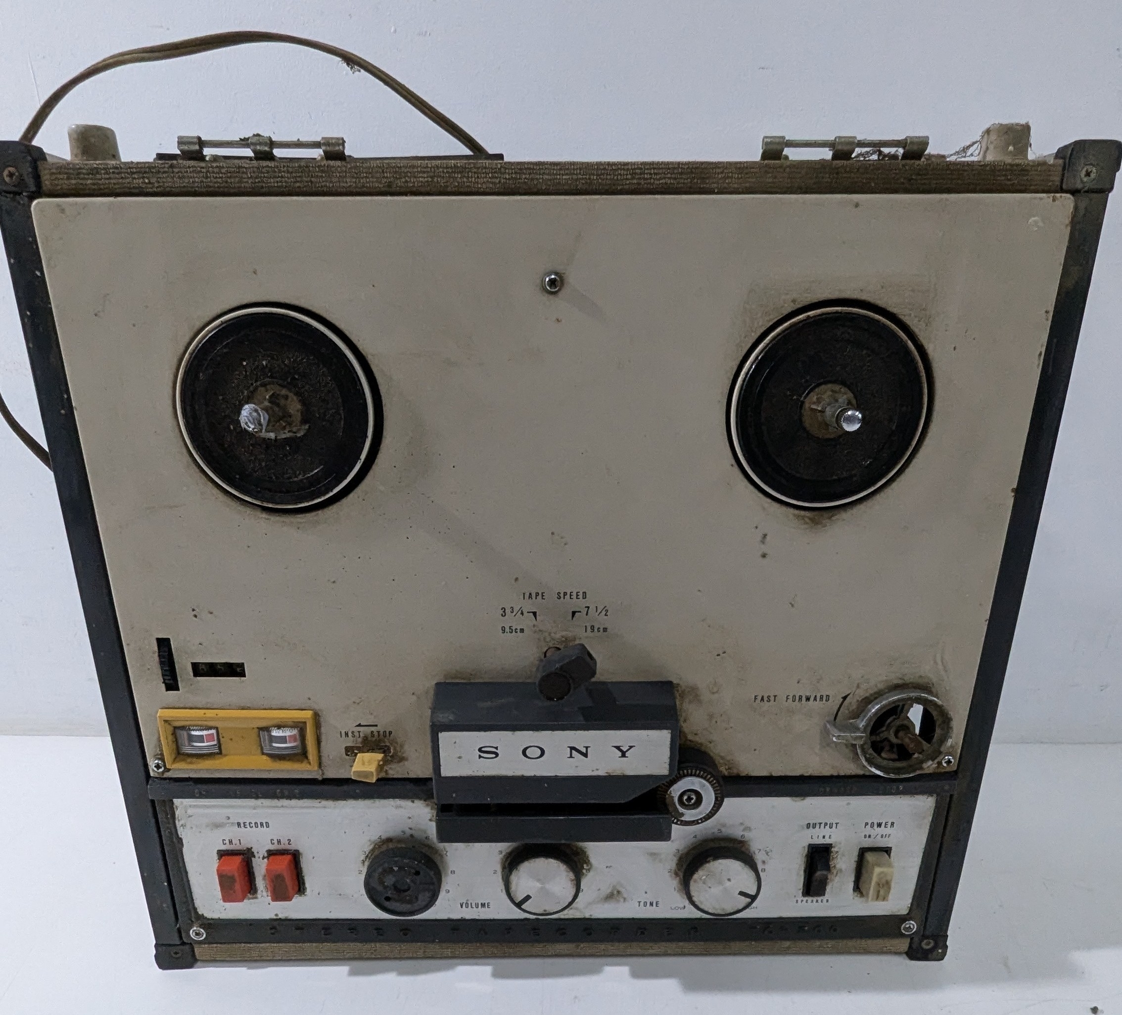 A vintage Sony TC-200 tape recorder, made in Japan by Sony Corporation, Tokyo. Dual-speed reel-to-reel recorder (3¾ & 7½ ips) with stereo record capability, VU meters, and channel controls. Housed in a portable case with integrated handle. The unit shows significant wear, dirt, and corrosion from age and storage; power and function untested, offered for restoration or parts. An early Sony model, appealing to collectors of 1960s analogue audio equipment.
