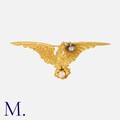 A Pearl and Diamond Brooch in yellow gold, designed as a bird with a pearl in it's talons and a diamond in its beak. French import mark, test indicate 18 carat gold.
