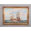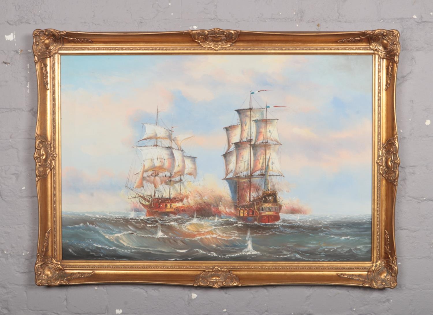 Ambrose, A large gilt frame oil on board, battle at sea. (59cm x 90cm).